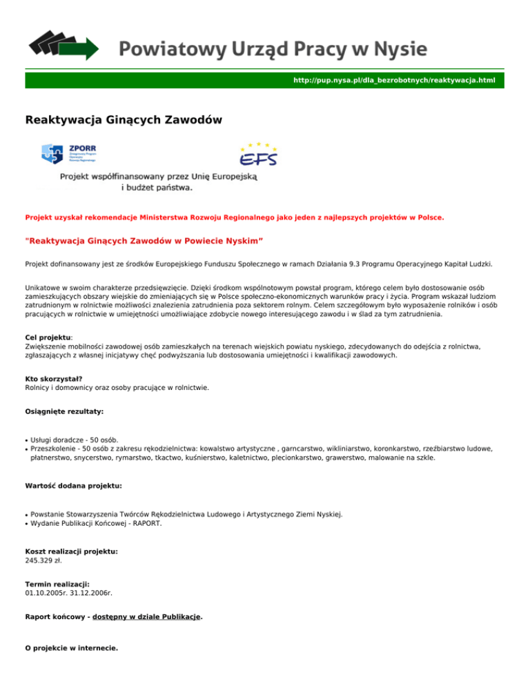 http://pup.nysa.pl/dla_bezrobotnych/reaktywacja.html Reaktywacja Ginących Zawodów Projekt uzyskał rekomendacje Ministerstwa Rozwoju Regionalnego jako jeden z najlepszych projektów w Polsce. "Reaktywacja Ginących Zawodów w Powiecie Nyskim” Projekt dofinansowany jest ze środków Europejskiego Funduszu Społecznego w ramach Działania 9.3 Programu Operacyjnego Kapitał Ludzki. Unikatowe w swoim charakterze przedsięwzięcie. Dzięki środkom wspólnotowym powstał program, którego celem było dostosowanie osób zamieszkujących obszary wiejskie do zmieniających się w Polsce społeczno-ekonomicznych warunków pracy i życia. Program wskazał ludziom zatrudnionym w rolnictwie możliwości znalezienia zatrudnienia poza sektorem rolnym. Celem szczegółowym było wyposażenie rolników i osób pracujących w rolnictwie w umiejętności umożliwiające zdobycie nowego interesującego zawodu i w ślad za tym zatrudnienia. Cel projektu: Zwiększenie mobilności zawodowej osób zamieszkałych na terenach wiejskich powiatu nyskiego, zdecydowanych do odejścia z rolnictwa, zgłaszających z własnej inicjatywy chęć podwyższania lub dostosowania umiejętności i kwalifikacji zawodowych. Kto skorzystał? Rolnicy i domownicy oraz osoby pracujące w rolnictwie. Osiągnięte rezultaty: ● ● Usługi doradcze - 50 osób. Przeszkolenie - 50 osób z zakresu rękodzielnictwa: kowalstwo artystyczne , garncarstwo, wikliniarstwo, koronkarstwo, rzeźbiarstwo ludowe, płatnerstwo, snycerstwo, rymarstwo, tkactwo, kuśnierstwo, kaletnictwo, plecionkarstwo, grawerstwo, malowanie na szkle. Wartość dodana projektu: ● ● Powstanie Stowarzyszenia Twórców Rękodzielnictwa Ludowego i Artystycznego Ziemi Nyskiej. Wydanie Publikacji Końcowej - RAPORT. Koszt realizacji projektu: 245.329 zł. Termin realizacji: 01.10.2005r. 31.12.2006r. Raport końcowy - dostępny w dziale Publikacje. O projekcie w internecie. ● ● ● http://www.koweziu.edu.pl http://www.funduszeonline.pl http://www.blizejfunduszy.eu Nazwa pliku Rozmiar Pobierz Kategoria: Reaktywacja ginących zawodów [ 1 ] Informacja o projekcie "Reaktywacja ginących zawodów" 888KB pobierz