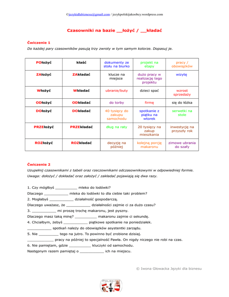©[email protected] / jezykpolskijakoobcy.wordpress.com Czasowniki na bazie __łożyć / __kładać Ćwiczenie 1 Do każdej pary czasowników pasują trzy zwroty w tym samym kolorze. Dopasuj je. POłożyć kłaść dokumenty ze stołu na biurko projekt na etapy pracy / obowiązków ZAłożyć ZAkładać klucze na miejsce dużo pracy w realizację tego projektu wizytę Włożyć Wkładać ubranie/buty dzieci spać wzrost sprzedaży ODłożyć ODkładać do torby firmę się do łóżka DOłożyć DOkładać 40 tysięcy do zakupu samochodu spotkanie z piątku na wtorek serwetki na stole PRZEłożyć PRZEkładać dług na raty 20 tysięcy na zakup mieszkania inwestycję na przyszły rok ROZłożyć ROZkładać decyzję na później kolejną porcję makaronu zimowe ubrania do szafy Ćwiczenie 2 Uzupełnij czasownikami z tabeli oraz rzeczownikami odczasownikowymi w odpowiedniej formie. Uwaga: dołożyć / dokładać oraz założyć / zakładać pojawiają się dwa razy. 1. Czy mógłbyś __________ mleko do lodówki? Dlaczego ___________ mleka do lodówki to dla ciebie taki problem? 2. Mogłabyś ___________ działalność gospodarczą. Dlaczego uważasz, że ___________ działalności zajmie ci za dużo czasu? 3. ___________ mi proszę trochę makaronu, jest pyszny. Dlaczego masz taką minę? __________ makaronu zajmie ci sekundę. 4. Chciałbym, żebyś ___________ piątkowe spotkanie na poniedziałek. ___________ spotkań należy do obowiązków asystentki zarządu. 5. Nie _________ tego na jutro. To powinno być zrobione dzisiaj. ____________ pracy na później to specjalność Pawła. On nigdy niczego nie robi na czas. 6. Nie pamiętam, gdzie __________ kluczyki od samochodu. Następnym razem pamiętaj o ___________ ich na miejscu. © Iwona Głowacka Języki dla biznesu ©[email protected] / jezykpolskijakoobcy.wordpress.com 7. ___________ (my, przeszły) realizację projektu na trzy kluczowe etapy. Pierwszy rozpocznie się w przyszłym miesiącu. ____________ projektu na trzy etapy ułatwi jego realizację. 8. Czy mógłbyś _________ mi 5 złotych? Zabrakło mi gotówki na parking. __________ 5 złotych pozwoli mi zapłacić za dwie godziny parkowania. 9. __________(my, teraźniejszy/ przeszły) , że w 2015 roku uda nam się osiągnąć piętnastoprocentowy wzrost zysków. To ___________ może być trudne do zrealizowania. Ćwiczenie 3 Dopasuj po trzy zwroty do każdej pary czasowników. POłożyć kłaść dokumenty ze stołu na biurko projekt na etapy pracy / obowiązków ZAłożyć ZAkładać klucze na miejsce dużo pracy w realizację tego projektu wizytę Włożyć Wkładać ubranie/buty dzieci spać wzrost sprzedaży ODłożyć ODkładać do torby firmę się do łóżka DOłożyć DOkładać 40 tysięcy do zakupu samochodu spotkanie z piątku na wtorek serwetki na stole PRZEłożyć PRZEkładać dług na raty 20 tysięcy na zakup mieszkania inwestycję na przyszły rok ROZłożyć ROZkładać decyzję na później kolejną porcję makaronu zimowe ubrania do szafy © Iwona Głowacka Języki dla biznesu