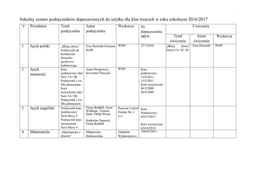 . Szkolny zestaw podręczników dopuszczonych do użytku dla klas trzecich w roku szkolnym 2016/2017 L P Przedmiot 1 Język polski 2 Język niemiecki 3 Język angielski 4 Matematyka Tytuł podręcznika „Bliżej słowa” Podręcznik do kształcenia literackojęzykowokulturowego Kurs podstawowy aha! New 3A+3B. Podręcznik z ćw. Dla gimnazjum Kurs rozszerzony aha! New 3A+3B. Podręcznik z ćw. Dla gimnazjum Podręcznik kurs podstawowy Next Move 3 Podręcznik kurs rozszerzony Next Move 4 „Matematyka z plusem” Autor podręcznika Wydawca Ewa Horwath Grażyna WSiP Kiełb Nr dopuszczenia MEN 27/3/2010 Anna Potopowicz Krzysztof Tkaczyk WSiP Fiona Beddall, Jayne Wildman, Tomasz Siuta, Philip Wood Pearson Central Kurs Europe Sp. z Podstawowy o.o. 624/3/2013 Katherine Stannett, Fiona Beddall Małgorzata Dobrowolska Gdańskie Wydawnictwo Kurs podstawowy 13/6/2011 13/5/2011 Kurs rozszerzony 86/5/2009 86/6/2009 Kurs rozszerzony 624/4/2014 168/03/2011 Ćwiczenia Tytuł ćwiczenia Autor ćwiczenia „Bliżej słowa” Ewa Horwath Zeszyt ćw. Kl. III Wydawca WSiP . Szkolny zestaw podręczników dopuszczonych do użytku dla klas trzecich w roku szkolnym 2016/2017 Oświatowe Nowa Era 60/3/2011 Roman Malarz Puls Ziemi. Podręcznik do geografii dla klasy trzeciej gimnazjum, cz. 3 Nowa Era 5/3/2010 Biologia Puls życia 3 Nowa Era 58/3/2010 8 Fizyka Spotkania z Grażyna FrancuzOrnat, Nowa Era fizyką część 3 i 4 Teresa Kulawik, Maria Nowotny-Różańska 93/3/2010 93/4/2011 9 Chemia Nowa Era 49/3/2010 10 Zajęcia artystyczne 11 Zajęcia techniczne 5 Historia 6 Geografia 7 Matematyka 3 „Śladami przeszłości „3 Zofia Bdałek Stanisław Roszak Anna Łaszkiewicz B Sągin M Sękstas J. Kulowik, T Chemia Nowej Kulowik, M Litwin Ery. Podręcznik dla gimnazjum Część 3 Beata Marcinkowska, Zeszyt do zajęć Lidia Frydzińskaartystycznych z Świątczak plastyki. Kraina sztuki. Waldemar Czyżewski, Technika w praktyce. Zajęcia Waldemar Lib, Wojciech Walat mechanicznomotoryzacyjne. PWN Nowa Era „Śladami przeszłości zeszyt ćwiczeń Puls Ziemi 3 Zeszyt ćwiczeń Puls życia część 3 Spotkania z fizyką zeszyt ćwiczeń część 3 i 4 Zeszyt ćwiczeń dla gimnazjum chemia Nowej Ery 3 Anna Łaszkiewicz Nowa Era J. S. Osika Nowa Era Nowa Era Nowa Era Grażyna FrancuzOrnat, Teresa Kulawik, Małgorzata Masłowska, Małgorzata Generowicz . Szkolny zestaw podręczników dopuszczonych do użytku dla klas trzecich w roku szkolnym 2016/2017 A. Pacewicz T. Kształcenie Merta obywatelskie w szkole samorządnej. Podręcznik i ćwiczenie . Część 2 Edukacja dla M. Borowiecki, Z. bezpieczeństwa Pytasz, E. Rygała Wydawnictwo CEO 169/2/2010 PWN 193/2009 Religia Żyć w miłości Bożej Ks. Jan Szpet D. Jackowiak AZ-33-01/10-PO3/13 Wychowanie do życia w rodzinie Wędrując ku dorosłości. Wychowanie do życia w rodzinie dla uczniów klas I- III gimnazjum red. Teresa Król Krystyna Maśnik, Wojciech Śledziński, Grażyna Węglarczyk, Jadwiga Wronicz; Księgarnia św. Wojciecha Wydawnictwo Rubikon 12 Wiedza o społeczeństwie 13 Edukacja dla bezpieczeństwa 14 15 2005/2009 Edukacja dla bezpieczeństwa zeszyt ćwiczeń J. Lauk, A. Przybył PWN Wędrując ku dorosłości ćwiczenie. Praca zbiorowa pod red. Teresy Król. Wydawnictwo Rubikon