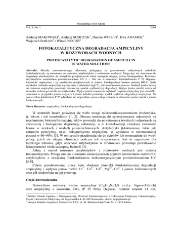 Proceedings of ECOpole Vol. 3, No. 1 2009 Andrzej MAKOWSKI1, Andrzej SOBCZAK1, Danuta WCISŁO1, Ewa ADAMEK1 Wojciech BARAN1 i Witold NOCOŃ2 FOTOKATALITYCZNA DEGRADACJA AMPICYLINY W ROZTWORACH WODNYCH PHOTOCATALYTIC DEGRADATION OF AMPICILLIN IN WATER SOLUTIONS Abstrakt: Metody zaawansowanego utleniania, polegające na generowaniu reaktywnych rodników hydroksylowych, są stosowane do usuwania antybiotyków z roztworów wodnych. Mogą być teŜ stosowane do degradacji antybiotyków do związków przejściowych, które następnie ulegają łatwiej biodegradacji. Roztwory antybiotyków naświetlano promieniowaniem UV λ = 366 nm w obecności fotokatalizatora P 25 Degussa. Zawartość ampicyliny i jej produktów przejściowych w trakcie fotodegradacji badano metodą HPLC. Stałe szybkości rozkładu ampicyliny wyznaczano z zaleŜności logC/Co od czasu trwania procesu. Dodatek jonów Ŝelaza do roztworu ampicyliny powoduje nieznaczny spadek szybkości jej degradacji. Wpływ jonów miedzi zaleŜy od stosunku molowego metalu do antybiotyku. Wpływ jonów wapnia na szybkość rozpadu ampicyliny jest niewielki, natomiast w przypadku jonów magnezu i jonów kobaltu powoduje spadek szybkości degradacji ampicyliny. Na powierzchni katalizatora P 25 adsorbuje się ampicylina; proces ulega zmianie w obecności jonów metali i jonów fosforanowych. Słowa kluczowe: ampicylina, fotokatalityczna degradacja W ostatnich latach poświęca się wiele uwagi mikrozanieczyszczeniom środowiska, tj. lekom i ich metabolitom [1, 2]. Obecna tendencja do syntetyzowania odpornych na mechanizmy biotransformacyjne leków prowadzi do powstawania trwałych i odpornych na chemiczną i biologiczna degradację substancji, a w konsekwencji zwiększa zawartość leków w ściekach i wodach powierzchniowych. Antybiotyki β-laktamowe, takie jak naturalne penicyliny, m.in. półsyntetyczna ampicylina, są wydalane w niezmienionej postaci w 60÷90% [3]. W ten sposób przedostają się do ścieków lub ewentualnie do wody pitnej, jeŜeli nie ulegną eliminacji podczas ich oczyszczania. Jest to zagroŜenie dla ludzkiego zdrowia, gdyŜ obecność antybiotyków w środowisku powoduje powstawanie lekooporności wielu szczepów bakterii [4]. Jedną z metod usuwania antybiotyków z roztworów wodnych jest metoda fotokatalityczna. Polega ona na utlenianiu zanieczyszczeń poprzez naświetlanie roztworów antybiotyków z zawiesiną fotokatalizatora niskoenergetycznym promieniowaniem UV [5-8]. Celem przedstawionej pracy było zbadanie kinetyki fotokatalitycznej degradacji ampicyliny i wpływu jonów metali Fe3+, Cu2+, Ca2+, Mg2+, Co2+ i jonów fosforanowych oraz pH środowiska na jej przebieg. Część doświadczalna Naświetlano roztwory wodne ampicyliny (C16H19N3O4S cz.d.a. Sigma-Aldrich) oraz ampicyliny z zawiesiną TiO2 (P 25 firmy Degussa, rozmiar cząstek 21 nm, 1 Zakład Chemii Ogólnej i Nieorganicznej, Wydział Farmaceutyczny z Oddziałem Medycyny Laboratoryjnej, Śląski Uniwersytet Medyczny, ul. Jagiellońska 4, 41-200 Sosnowiec, email: [email protected] Instytut Podstaw InŜynierii Środowiska PAN, ul. M. Skłodowskiej-Curie 34, 41-819 Zabrze 2 82 Andrzej Makowski, Andrzej Sobczak, Danuta Wcisło, Ewa Adamek, Wojciech Baran i Witold Nocoń powierzchnia właściwa 50 m2/g), oraz roztwory antybiotyków z jonami metali w obecności fotokatalizatora. Do przygotowania roztworów antybiotyku z jonami metali o odpowiednim stosunku molowym uŜywano roztworów chlorków metali cz.d.a. Do przygotowania roztworów z jonami fosforanowymi uŜywano wodorofosforanu(V) amonu cz.d.a. POCh. Badane roztwory antybiotyku z jonami metali i z jonami fosforanowymi opisano w tabeli 1. Proces prowadzono w krystalizatorach z ciągłym mieszaniem za pomocą mieszadeł magnetycznych i z dostępem powietrza atmosferycznego. Stosowano 4 lampy Philips TL-40 W/05 o natęŜeniu promieniowania 2,9 mW cm–2 i maksimum emisji przy długości fali λ = 366 nm. W naświetlanych roztworach po odwirowaniu badano zmiany stęŜenia ampicyliny metodą HPLC. Stosowano detektor UV-VIS f-my Merck-Hitachi o długości fali λ = 220 nm i kolumnę BDS Hypersil C18 o uziarnieniu 5 µm, długości 150 mm i średnicy 2,1 mm. Jako fazę ruchomą stosowano roztwór buforu mrówczanowego i acetonitrylu o stosunku objętościowym 1:1. Następnie wyznaczano zaleŜność logC/Co od czasu trwania procesu fotokatalitycznego i obliczano stałe szybkości fotokatalitycznej degradacji ampicyliny. Oceniając wpływ pH na stałe szybkości degradacji antybiotyku, badano jego roztwory o pH ustalonym odpowiednio poprzez dodatek 0,1 mol/dm3 HCl lub 0,1 mol/dm3 NaOH. Tabela 1 Roztwory ampicyliny o stęŜeniu 0,1 mmol/dm3 z jonami metali i jonami fosforanowymi Table 1 Solutions of ampicillin (0.1 mmol/dm3) with metal and phosphate ions Jony Stosunek molowy antybiotyk : jony metalu Fe3+ 1; 3; 5;10 2+ 1; 5 2+ 5; 10 Mg2+ 5; 10 Cu Ca 2+ Co HPO 2− 4 10 1; 5 Wyniki i ich omówienie ZaleŜność C/Co ampicyliny od czasu trwania procesu fotolitycznego dla roztworu ampicyliny i procesu fotokatalitycznego dla roztworu tego antybiotyku i jego roztworów z jonami Ŝelaza o róŜnym stosunku molowym antybiotyk : metal zamieszczono na rysunku 1. Jak wynika z tego rysunku i danych z tabeli 2, dodatek jonów Ŝelaza powoduje zmniejszenie szybkości fotokatalitycznego rozpadu ampicyliny. Szybkość procesu fotolitycznego jest wielokrotnie mniejsza niŜ procesu fotokatalitycznego. Na rysunku 2 zamieszczono zaleŜność C/Co ampicyliny w roztworze tego antybiotyku i jej roztworach z jonami Ca2+ i jonami fosforanowymi od czasu trwania procesu fotokatalitycznego. Jak wynika z danych w tabeli 2, jony wapnia nieznacznie wpływają na szybkość procesu, a jony fosforanowe przyśpieszają proces degradacji ampicyliny. Z rysunku 3 i danych z tabeli 2 wynika, Ŝe jony magnezu wpływają na szybkość degradacji ampicyliny wraz ze wzrostem ich stęŜenia w roztworze. Fotokatalityczna degradacja ampicyliny w roztworach wo
