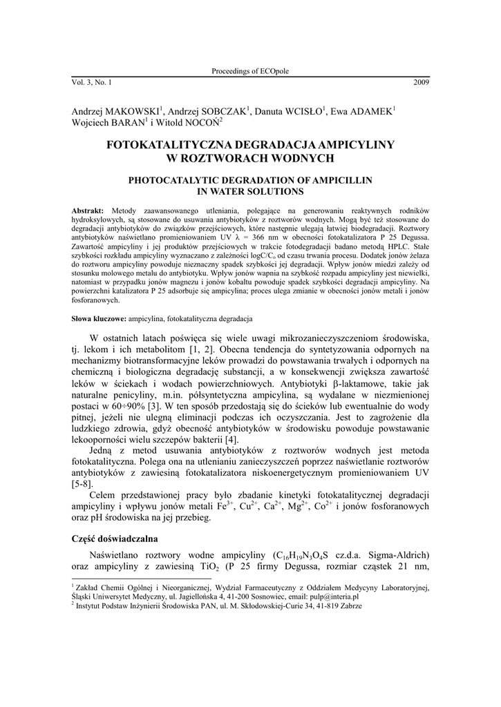 fotokatalityczna degradacja ampicyliny w roztworach wodnych