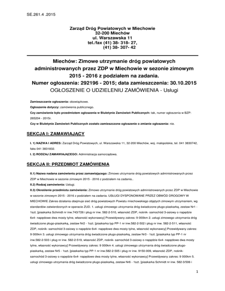 SE.261.4 .2015 Zarząd Dróg Powiatowych w Miechowie 32-200 Miechów ul. Warszawska 11 tel./fax (41) 38- 318- 27, (41) 38- 307- 42 Miechów: Zimowe utrzymanie dróg powiatowych administrowanych przez ZDP w Miechowie w sezonie zimowym 2015 - 2016 z podziałem na zadania. Numer ogłoszenia: 292196 - 2015; data zamieszczenia: 30.10.2015 OGŁOSZENIE O UDZIELENIU ZAMÓWIENIA - Usługi Zamieszczanie ogłoszenia: obowiązkowe. Ogłoszenie dotyczy: zamówienia publicznego. Czy zamówienie było przedmiotem ogłoszenia w Biuletynie Zamówień Publicznych: tak, numer ogłoszenia w BZP: 265204 - 2015r. Czy w Biuletynie Zamówień Publicznych zostało zamieszczone ogłoszenie o zmianie ogłoszenia: nie. SEKCJA I: ZAMAWIAJĄCY I. 1) NAZWA I ADRES: Zarząd Dróg Powiatowych, ul. Warszawska 11, 32-200 Miechów, woj. małopolskie, tel. 041 3830742, faks 041 3831832. I. 2) RODZAJ ZAMAWIAJĄCEGO: Administracja samorządowa. SEKCJA II: PRZEDMIOT ZAMÓWIENIA II.1) Nazwa nadana zamówieniu przez zamawiającego: Zimowe utrzymanie dróg powiatowych administrowanych przez ZDP w Miechowie w sezonie zimowym 2015 - 2016 z podziałem na zadania.. II.2) Rodzaj zamówienia: Usługi. II.3) Określenie przedmiotu zamówienia: Zimowe utrzymanie dróg powiatowych administrowanych przez ZDP w Miechowie w sezonie zimowym 2015 - 2016 z podziałem na zadania. USŁUGI DYSPONOWANE PRZEZ OBWÓD DROGOWY W MIECHOWIE Zakres działania obejmuje sieć dróg powiatowych Powiatu miechowskiego objętych zimowym utrzymaniem, wg standardów zatwierdzonych w operacie ZUD. 1. usługi zimowego utrzymania dróg świadczone pługo-piaskarką, zestaw Nr1 1szt. [piaskarka Schmidt nr inw.743/726 i pług nr inw. 582-2-510, własność ZDP, nośnik- samochód 3-osiowy o napędzie 6x4- napędowe dwa mosty tylne, własność wykonawcy] Przewidywany zakres: 9 000km 2. usługi zimowego utrzymania dróg świadczone pługo-piaskarką, zestaw Nr2 - 1szt. [piaskarka typ PP-1 nr inw.582-2-502 i pług nr inw. 582-2-511, własność ZDP, nośnik- samochód 3-osiowy o napędzie 6x4- napędowe dwa mosty tylne, własność wykonawcy] Przewidywany zakres: 9 000km 3. usługi zimowego utrzymania dróg świadczone pługo-piaskarką, zestaw Nr3 - 1szt. [piaskarka typ PP-1 nr inw.582-2-503 i pług nr inw. 582-2-519, własność ZDP, nośnik- samochód 3-osiowy o napędzie 6x4- napędowe dwa mosty tylne, własność wykonawcy] Przewidywany zakres: 9 000km 4. usługi zimowego utrzymania dróg świadczone pługopiaskarką, zestaw Nr5 - 1szt. [piaskarka typ PP-1 nr inw.582-2-505 i pług nr inw. 9150-009, własność ZDP, nośniksamochód 3-osiowy o napędzie 6x4- napędowe dwa mosty tylne, własność wykonawcy] Przewidywany zakres: 9 000km 5. usługi zimowego utrzymania dróg świadczone pługo-piaskarką, zestaw Nr6 - 1szt. [piaskarka Schmidt nr inw. 582-3/506 i 1 SE.261.4 .2015 pług nr inw. 9150-011, własność ZDP, nośnik- samochód 3-osiowy o napędzie 6x4- napędowe dwa mosty tylne własność wykonawcy] Przewidywany zakres: 9 000km 6. usługi dotyczące zimowego utrzymania dróg wykonywane koparko-ładowarką (załadunek materiałów) o poj. łyżki co najmniej 0,25m3 lub więcej (sprzęt wykonawcy) - 1szt Przewidywany zakres: 300godz. 7.transport materiałów do zimowego utrzymania dróg ze składowiska w Chrustach k.Książa Wielkiego do Miechowa Przewidywany zakres: 17km x 6500T= 110500 Tkm 8. ustawienie zasłon przeciwśnieżnych i rozebranie zasłon przeciwśnieżnych po sezonie zimowym, na wybranych odcinkach dróg powiatowych na długości 5,500km. Przewidywany zakres: 5,500km 9. zimowe utrzymanie odcinków chodników przy ulicach i drogach powiatowych w Miechowie na pow. 12 199m2 oraz w ciągu dr. powiatowej 1206K Jaksice do dr.kraj nr7 w m. Jaksice na pow.371m2 - materiał do posypywania Zamawiającego. Przewidywany zakres: 50dni (dzień=doba 24godz.) 10. zimowe utrzymanie wiaduktu wraz z chodnikami i dojazdami w ciągu dr. powiatowej 1194K Gr. woj.- Kozłów - Książ Wielki m. Kozłów - materiał do posypywania Zamawiającego. Przewidywany zakres: 30dni (dzień=doba 24godz.) 11. zimowe utrzymanie odcinków chodników w ciągu dr. powiatowej 1194K Gr. woj.- Kozłów - Książ W m. Kozłów na pow.1356m2, w ciągu dr. powiatowej 1198K Mierzawa Sędziszów - Kozłów m. Kozłów na pow.94m2, w ciągu dr. powiatowej 1183K Kozłów- Przybysławice - Łazy m. Kozłów na pow.193m2 i w ciągu dr. powiatowej 1180K Kozłów - Kępie - Charsznica m. Kępie na pow. 576m2 - materiał do posypywania Zamawiającego. Przewidywany zakres: 50dni (dzień=doba 24godz.) 12. zimowe utrzymanie odcinków chodników w ciągu dr. powiatowej 1172K Maków - Gołcza - Zerwana w m. Gołcza na pow. 2882m2, w ciągu drogi powiatowej 1204K Miechów (ul.Kolejowa)-Rzeżuśnia-Gołcza w m. Gołcza na pow. 447m2, w ciągu dr. powiatowej 1172K Maków - Gołcza -Zerwana w m. Wysocice na pow. 1059m2 i w ciągu dr. powiatowej 1174K Szreniawa - Przybysławice w m. Szreniawa na pow.1008m2 materiał do posypywania Zamawiającego. Przewidywany zakres: 50dni (dzień=doba 24godz.) 13. zimowe utrzymanie chodnika w ciągu dr. powiatowej 1224K Bukowska Wola - Działoszyce m. Słaboszów na pow. 1540m2, w ciągu dr. powiatowej 1194K gr.woj.- Książ Wlk.-Słaboszów w m. Słaboszów na pow.495m2 i w ciągu dr. powiatowej 1214K Małoszów Janowice w m. Janowice na pow. 289m2 - materiał do posypywania Zamawiającego. Przewidywany zakres: 50dni (dzień=doba 24godz.) 14. zimowe utrzymanie chodnika w ciągu dr. powiatowej 1235K Racławice - Wrocimowice m. Racławice na pow. 1500m2 i w ciągu dr. powiatowej 1233K Kropidło-Racławice m. Racławice na pow. 630m2 - materiał do posypywania Zamawiającego. Przewidywany zakres: 50dni (dzień=doba 24godz.) 15. zimowe utrzymanie chodnika w ciągu dr. powiatowej 1194K Gr. woj. - Kozłów - Książ Wielki - Słaboszów m. Książ Wielki na pow.1564m2 i w ciągu dr.1219K Książ Wlk. - Zaryszyn w m. Książ Wielki na pow. 415m2 i w m. Książ Mały na pow.884m2 