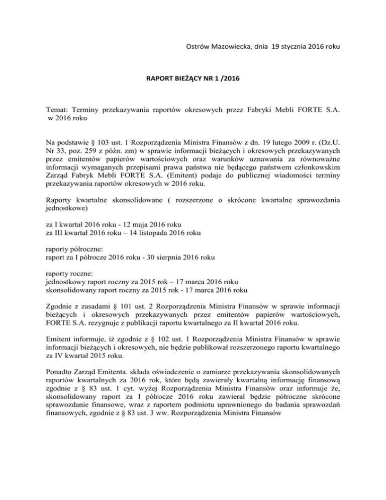 Ostrów Mazowiecka, dnia 19 stycznia 2016 roku RAPORT BIEŻĄCY NR 1 /2016 Temat: Terminy przekazywania raportów okresowych przez Fabryki Mebli FORTE S.A. w 2016 roku Na podstawie § 103 ust. 1 Rozporządzenia Ministra Finansów z dn. 19 lutego 2009 r. (Dz.U. Nr 33, poz. 259 z późn. zm) w sprawie informacji bieżących i okresowych przekazywanych przez emitentów papierów wartościowych oraz warunków uznawania za równoważne informacji wymaganych przepisami prawa państwa nie będącego państwem członkowskim Zarząd Fabryk Mebli FORTE S.A. (Emitent) podaje do publicznej wiadomości terminy przekazywania raportów okresowych w 2016 roku. Raporty kwartalne skonsolidowane ( rozszerzone o skrócone kwartalne sprawozdania jednostkowe) za I kwartał 2016 roku - 12 maja 2016 roku za III kwartał 2016 roku – 14 listopada 2016 roku raporty półroczne: raport za I półrocze 2016 roku - 30 sierpnia 2016 roku raporty roczne: jednostkowy raport roczny za 2015 rok – 17 marca 2016 roku skonsolidowany raport roczny za 2015 rok - 17 marca 2016 roku Zgodnie z zasadami § 101 ust. 2 Rozporządzenia Ministra Finansów w sprawie informacji bieżących i okresowych przekazywanych przez emitentów papierów wartościowych, FORTE S.A. rezygnuje z publikacji raportu kwartalnego za II kwartał 2016 roku. Emitent informuje, iż zgodnie z § 102 ust. 1 Rozporządzenia Ministra Finansów w sprawie informacji bieżących i okresowych, nie będzie publikował rozszerzonego raportu kwartalnego za IV kwartał 2015 roku. Ponadto Zarząd Emitenta. składa oświadczenie o zamiarze przekazywania skonsolidowanych raportów kwartalnych za 2016 rok, które będą zawierały kwartalną informację finansową zgodnie z § 83 ust. 1 cyt. wyżej Rozporządzenia Ministra Finansów oraz informuje że, skonsolidowany raport za I półrocze 2016 roku zawierał będzie półroczne skrócone sprawozdanie finansowe, wraz z raportem podmiotu uprawnionego do badania sprawozdań finansowych, zgodnie z § 83 ust. 3 ww. Rozporządzenia Ministra Finansów