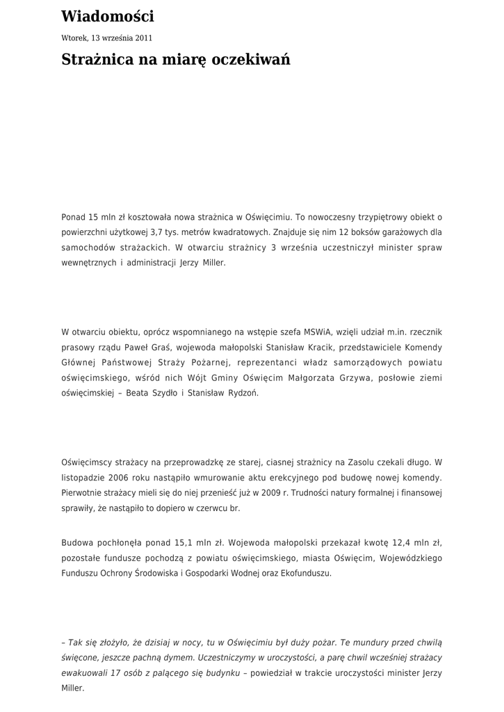 Wiadomości Wtorek, 13 września 2011 Strażnica na miarę oczekiwań Ponad 15 mln zł kosztowała nowa strażnica w Oświęcimiu. To nowoczesny trzypiętrowy obiekt o powierzchni użytkowej 3,7 tys. metrów kwadratowych. Znajduje się nim 12 boksów garażowych dla samochodów strażackich. W otwarciu strażnicy 3 września uczestniczył minister spraw wewnętrznych i administracji Jerzy Miller. W otwarciu obiektu, oprócz wspomnianego na wstępie szefa MSWiA, wzięli udział m.in. rzecznik prasowy rządu Paweł Graś, wojewoda małopolski Stanisław Kracik, przedstawiciele Komendy Głównej Państwowej Straży Pożarnej, reprezentanci władz samorządowych powiatu oświęcimskiego, wśród nich Wójt Gminy Oświęcim Małgorzata Grzywa, posłowie ziemi oświęcimskiej – Beata Szydło i Stanisław Rydzoń. Oświęcimscy strażacy na przeprowadzkę ze starej, ciasnej strażnicy na Zasolu czekali długo. W listopadzie 2006 roku nastąpiło wmurowanie aktu erekcyjnego pod budowę nowej komendy. Pierwotnie strażacy mieli się do niej przenieść już w 2009 r. Trudności natury formalnej i finansowej sprawiły, że nastąpiło to dopiero w czerwcu br. Budowa pochłonęła ponad 15,1 mln zł. Wojewoda małopolski przekazał kwotę 12,4 mln zł, pozostałe fundusze pochodzą z powiatu oświęcimskiego, miasta Oświęcim, Wojewódzkiego Funduszu Ochrony Środowiska i Gospodarki Wodnej oraz Ekofunduszu. – Tak się złożyło, że dzisiaj w nocy, tu w Oświęcimiu był duży pożar. Te mundury przed chwilą święcone, jeszcze pachną dymem. Uczestniczymy w uroczystości, a parę chwil wcześniej strażacy ewakuowali 17 osób z palącego się budynku – powiedział w trakcie uroczystości minister Jerzy Miller. Zwracając się do strażaków podkreślił, że 15 milionów wydane na nowe budynki to tak naprawdę skromne podziękowanie za ich pełną oddania służbę. Marszałek Województwa Małopolskiego Marek Sowa też nie przyjechał do Oświęcimia z pustymi rękami. Wręczając promesy powiedział, że wkrótce na wyposażenie oświęcimskich strażaków trafi nowy samochód ratowniczo-gaśniczy, pompa do zanieczyszczonej wody wraz z przyczepą oraz agregat pompowy. Minister Jerzy Miller przekazał sztandar dla Komendy Powiatowej Państwowej Straży Pożarnej w Oświęcimiu. Z rąk szefa MSWiA odebrał go komendant PSP w Oświęcimiu st. bryg. Tadeusz Spyra. Zasłużonych strażaków uhonorowano odznaczeniami. Z kolei pamiątkowe toporki strażackie komendant. Tadeusz Spyra wręczył m.in. gospodarzom okolicznych gmin, którzy wnieśli finansowy i rzeczowy wkład w budowę i wyposażenie strażnicy. W gronie obdarowanych znalazła się Wójt Gminy Oświęcim Małgorzata Grzywa. Oficjalne uroczystości zwieńczyła defilada z udziałem strażaków z regionu, w tym jednostek OSP z terenu gminy Oświęcim. Dzień później strażnicę mogli obejrzeć wszyscy zainteresowani mieszkańcy podczas dnia otwartego obiektu. Chętnych nie brakowało, by na własne oczy podziwiać siedzibę na miarę XXI wieku. Zapraszamy do oglądnięcia zdjęć z uroczystości Kliknij na zdjęcie, aby przejść do galerii zdjęć