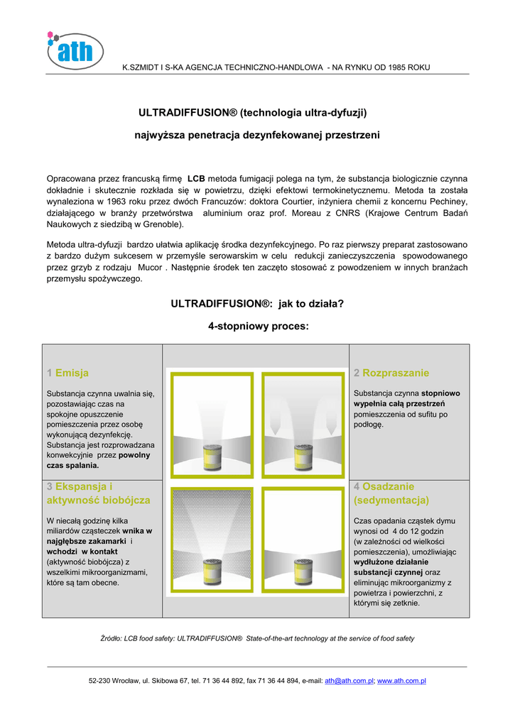 K.SZMIDT I S-KA AGENCJA TECHNICZNO-HANDLOWA - NA RYNKU OD 1985 ROKU ULTRADIFFUSION® (technologia ultra-dyfuzji) najwyższa penetracja dezynfekowanej przestrzeni Opracowana przez francuską firmę LCB metoda fumigacji polega na tym, że substancja biologicznie czynna dokładnie i skutecznie rozkłada się w powietrzu, dzięki efektowi termokinetycznemu. Metoda ta została wynaleziona w 1963 roku przez dwóch Francuzów: doktora Courtier, inżyniera chemii z koncernu Pechiney, działającego w branży przetwórstwa aluminium oraz prof. Moreau z CNRS (Krajowe Centrum Badań Naukowych z siedzibą w Grenoble). Metoda ultra-dyfuzji bardzo ułatwia aplikację środka dezynfekcyjnego. Po raz pierwszy preparat zastosowano z bardzo dużym sukcesem w przemyśle serowarskim w celu redukcji zanieczyszczenia spowodowanego przez grzyb z rodzaju Mucor . Następnie środek ten zaczęto stosować z powodzeniem w innych branżach przemysłu spożywczego. ULTRADIFFUSION®: jak to działa? 4-stopniowy proces: 1 Emisja 2 Rozpraszanie Substancja czynna uwalnia się, pozostawiając czas na spokojne opuszczenie pomieszczenia przez osobę wykonującą dezynfekcję. Substancja jest rozprowadzana konwekcyjnie przez powolny czas spalania. Substancja czynna stopniowo wypełnia całą przestrzeń pomieszczenia od sufitu po podłogę. 3 Ekspansja i aktywność biobójcza 4 Osadzanie (sedymentacja) W niecałą godzinę kilka miliardów cząsteczek wnika w najgłębsze zakamarki i wchodzi w kontakt (aktywność biobójcza) z wszelkimi mikroorganizmami, które są tam obecne. Czas opadania cząstek dymu wynosi od 4 do 12 godzin (w zależności od wielkości pomieszczenia), umożliwiając wydłużone działanie substancji czynnej oraz eliminując mikroorganizmy z powietrza i powierzchni, z którymi się zetknie. Źródło: LCB food safety: ULTRADIFFUSION® State-of-the-art technology at the service of food safety 52-230 Wrocław, ul. Skibowa 67, tel. 71 36 44 892, fax 71 36 44 894, e-mail: [email protected]; www.ath.com.pl