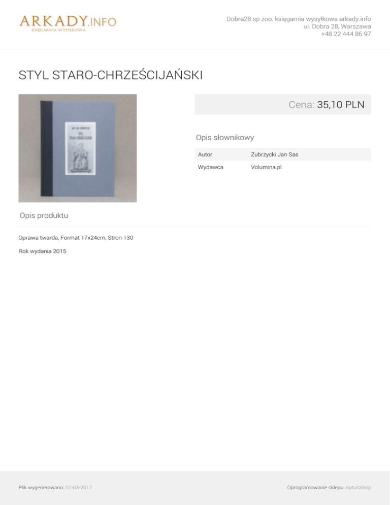 Dobra28 sp zoo. księgarnia wysyłkowa arkady.info ul. Dobra 28, Warszawa +48 22 444 86 97 STYL STARO-CHRZEŚCIJAŃSKI Cena: 35,10 PLN Opis słownikowy Autor Zubrzycki Jan Sas Wydawca Volumina.pl Opis produktu Oprawa twarda, Format 17x24cm, Stron 130 Rok wydania 2015 Plik wygenerowano: 07-03-2017 Powered by TCPDF (www.tcpdf.org) Oprogramowanie sklepu: AptusShop
