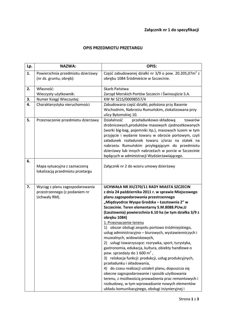 Załącznik nr 1 do specyfikacji OPIS PRZEDMIOTU PRZETARGU Lp. NAZWA: OPIS: 1. Powierzchnia przedmiotu dzierżawy (nr dz. gruntu, obręb): Część zabudowanej działki nr 3/9 o pow. 20.205,07m2 z obrębu 1084 Śródmieście w Szczecinie. 2. 3. 4. Własność: Wieczysty użytkownik: Numer Księgi Wieczystej: Charakterystyka nieruchomości 5. Przeznaczenie przedmiotu dzierżawy Skarb Państwa Zarząd Morskich Portów Szczecin i Świnoujście S.A. KW Nr SZ1S/00098557/4 Zabudowana część działki, położona przy Basenie Wschodnim, Nabrzeżu Rumuńskim, zlokalizowana przy ulicy Bytomskiej 10. Działalność przeładunkowo-składową towarów drobnicowych,produktów masowych zjednostkowanych (worki big-bag, pojemniki itp.), masowych luzem w tym przyjęcie i wydanie towaru w obrocie portowym, czyli załadunek rozładunek towaru z/oraz na statek na nabrzeżu Rumuńskim przylegającym do przedmiotu dzierżawy lub innych nabrzeżach w porcie w Szczecinie będących w administracji Wydzierżawiającego. 6. 7. Mapa sytuacyjna z zaznaczoną lokalizacją przedmiotu przetargu Załącznik nr 2 do wzoru umowy dzierżawy Wyciąg z planu zagospodarowania przestrzennego (z podaniem nr Uchwały RM). UCHWAŁA NR XII/270/11 RADY MIASTA SZCZECIN z dnia 24 października 2011 r. w sprawie Miejscowego planu zagospodarowania przestrzennego „Międzyodrze Wyspa Grodzka – Łasztownia 2” w Szczecinie. Teren elementarny S.M.8088.PUw,U (Łasztownia) powierzchnia 6.10 ha (w tym działka 3/9 z obrębu 1084) 1. Przeznaczenie terenu 1) obszar obsługi zespołu portowo śródmiejskiego, usług administracyjno – biurowych, wystawienniczych i muzealnych, widowiskowych, 2) usługi towarzyszące: rozrywka, sport, turystyka, gastronomia, edukacja, kultura, obiekty handlowe o pow. sprzedaży do 1 600 m2 , 3) relokacja funkcji: produkcji, usług produkcyjnych, przeładunku i składowania, 4) do czasu realizacji ustaleń planu, dopuszcza się obecne zagospodarowanie i sposób użytkowania terenu, z możliwością prowadzenia prac remontowych i rozbudowy, w tym wprowadzanie nowych elementów układu komunikacyjnego, obsługi inżynieryjnej i Strona 1 z 3 zagospodarowania zielenią; 2. Kształtowanie zabudowy i zagospodarowania terenu 1) obowiązująca i nieprzekraczalna linia zabudowy wg rysunku planu, 2) powierzchnia zabudowy do 40 % powierzchni działki, 3) nowe obiekty funkcji podstawowej i pomocniczej na wskazanych wydzieleniach wewnętrznych, oznaczonych na rysunku planu kolejno numerami: a) budynek (budynki) niepodpiwniczone, z dachem przestrzennym, o spadku do 100 %, bez prawa lokalizacji na dachu urządzeń technicznych, lokalizacja wszystkich funkcji pomocniczych w zwartej bryle budynku, wskazane użycie elewacyjnych materiałów ceramicznych, wysokość zabudowy, od 18,5 m do okapu (gzymsy koronującego) frontowego 30,0 m n.p.t, b) teren ekspozycji plenerowej i/lub zieleni urządzonej, 4) dachy przestrzenne, kryte ceramicznie, nie dotyczy obiektów zabytkowych, 5) obowiązuje lokalizacja funkcji usługowych i/lub recepcyjnych w przyziemiu zabudowy, 6) urządzenia techniczne obsługujące nową zabudowę np. stacje transformatorowe, przepompownie, wentylatornie, itp. oraz pomieszczenia do gromadzenia odpadów wyłącznie wbudowane, 7) utrzymanie geometrii akwatorium portowego: Basenu Zachodniego i Wschodniego, 8) utrzymanie (konserwacja i naprawa) nabrzeża wraz z jego technologicznym wyposażeniem, m.in. urządzeniami do przeładunku, cumowania, oczyszczania basenów, itp., ochronie podlega lokalizacja urządzeń, technologia i materiał zastosowany w konstrukcji nabrzeży, utrzymanie istniejących nawierzchni brukowych, dopuszcza się lokalizację wyposażenia do cumowania jednostek pływających, pomostów sezonowych oraz innych urządzeń niezbędnych dla nowych funkcji, 9) utrzymanie: zabytkowych obiektów budowlanych, zmiana sposobu użytkowania dla nowych funkcji wg zaleceń konserwatorskich, 10) ekspozycja dźwigów i elementów jednostek pływających bez ograniczeń, 11) pozostały teren zagospodarowany nawierzchniami utwardzonymi dla ekspozycji, z możliwością lokalizacji parkingów naziemnych, podjazdów do budynków zabytkowych, lokalizacji ogródków gastronomicznych stałych i czasowych, zgodnie z zaleceniami konserwatorskimi; 3. Zasady parcelacji 1) minimalna wielkość wydzielanej działki budowlanej 5 000 m2 , 2) granice działek prostopadłe do nabrzeża basenu, Strona 2 z 3 3) dopuszcza się realizację nowej zabudowy, zgodnie z ustaleniami planu, bez wydzielania terenów przynależnych; 4. Ochrona środowiska i przyrody 1) teren w granicach portu morskiego, 2) zachowanie i uzupełnienie wartościowego drzewostanu; 6. Komunikacja 1)teren dostępny z ulicy wewnętrznej S.M.8085.KDW i/lub S.M.8068.KDW, 2)likwidacja bocznic kolejowych. 8. Wykaz środków trwałych wchodzących w skład przedmiotu przetargu wraz z opisem stanu technicznego: Załącznik nr 1 b do opisu przedmiotu przetargu 9. Dostępna infrastruktura elektroenergetyczna, teletechniczna, wodociągowo-kanalizacyjna, gazowa (media): Załącznik nr 1 a do opisu przedmiotu przetargu 10. Likwidacje środków trwałych (wyburzenia): 11. Badanie gruntu: (badanie jakości gleby i ziemi, niewybuchy): Podjęte działania mające na celu likwidację budynków: a) garaż samochodowy nr inw. 1-0056 o pow. 59,40m2 b) budynek szalet nr 1 nr inw. 1-0287 o pow. 27,75m2 Brak 12. 13. Inwentaryzacja zieleni: Teren objęty ochroną dziedzictwa kulturowego i zabytków (Konserwator Zabytków): 14. Planowane przez ZMPSiŚ S.A. prace remontowe, inwestycyjne, modernizacyjne w okolicy przedmiotu przetargu Nie dotyczy Teren oraz budynki magazynowe Nr 9 i Nr 10 o walorach historycznych i architektonicznych posadowione przy nabrzeżu Rumuńskim wpisane są decyzją PSOZ/SZn/5340/68/91 z dnia 29.04.1991 r. do rejestru zabytków pod numerem rejestru A–1180 – Teren dawnego Portu Wolnocłowego na Łasztowni. Wykonanie odwodnienia oraz remont nawierzchni z płyt