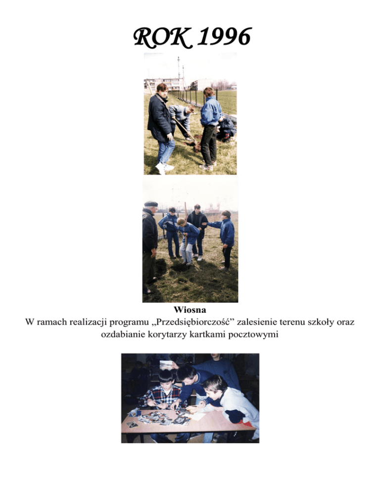 ROK 1996 Wiosna W ramach realizacji programu „Przedsiębiorczość” zalesienie terenu szkoły oraz ozdabianie korytarzy kartkami pocztowymi