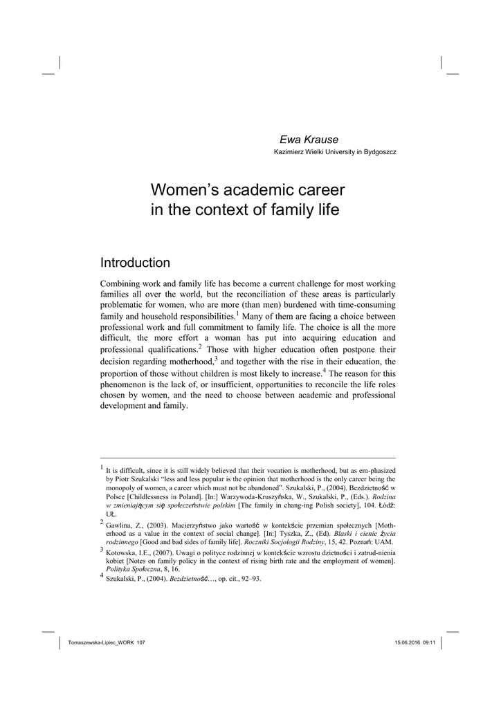 Ewa Krause Kazimierz Wielki University in Bydgoszcz Women’s academic career in the context of family life Introduction Combining work and family life has become a current challenge for most working families all over the world, but the reconciliation of these areas is particularly problematic for women, who are more (than men) burdened with time-consuming family and household responsibilities.1 Many of them are facing a choice between professional work and full commitment to family life. The choice is all the more difficult, the more effort a woman has put into acquiring education and professional qualifications.2 Those with higher education often postpone their decision regarding motherhood,3 and together with the rise in their education, the proportion of those without children is most likely to increase.4 The reason for this phenomenon is the lack of, or insufficient, opportunities to reconcile the life roles chosen by women, and the need to choose between academic and professional development and family. 1 2 It is difficult, since it is still widely believed that their vocation is motherhood, but as em-phasized by Piotr Szukalski “less and less popular is the opinion that motherhood is the only career being the monopoly of women, a career which must not be abandoned”. Szukalski, P., (2004). Bezdzietność w Polsce [Childlessness in Poland]. [In:] Warzywoda-Kruszyńska, W., Szukalski, P., (Eds.). Rodzina w zmieniającym się społeczeństwie polskim [The family in chang-ing Polish society], 104. Łódź: UŁ. Gawlina, Z., (2003). Macierzyństwo jako wartość w kontekście przemian społecznych [Motherhood as a value in the context of social change]. [In:] Tyszka, Z., (Ed). Blaski i cienie życia rodzinnego [Good and bad sides of family life]. Roczniki Socjologii Rodziny, 15, 42. Poznań: UAM. 3 Kotowska, I.E., (2007). Uwagi o polityce rodzinnej w kontekście wzrostu dzietności i zatrud-nienia kobiet [Notes on family policy in the context of rising birth rate and the employment of women]. Polityka Społeczna, 8, 16. 4 Szukalski, P., (2004). Bezdzietność…, op. cit., 92–93. Tomaszewska-Lipiec_WORK 107 15.06.2016 09:11 108 I. DISINTEGRATION OF THE WORK – PRIVATE LIFE RELATIONS AS A THREAT… Combining professional and family lives as a challenge for women realizing scientific careers It is even harder for women scholars to act as a parent. Embracing academic research involves the necessity to be constantly up to date, and this requires much greater investment on the part of women, better organization and more support from the family,5 but also from the state and the organization they work for – in this case, mostly, a university. Many young academic women decide not to have children for fear they might not cope with a doctorate or a postdoctoral degree later. Those who decide to become mothers must in turn accept the fact that either they will manage to maintain a balance between academic career and the parental role, or they will have to make constant choices between these two spheres of life. Bogdan Wojciszke points out that […] a serious, but kind of natural barrier on women’s road to academic career is family life, the functions of a wife and a mother, the care for the family. […] In the case of women scholars, a professional career is often pursued at the expense of the family, which is why they often tend to be single. […] Women are aware of this natural barrier to the development of their academic career, which are the duties of a wife and a mother. In my opinion, whether a woman will devote herself to pursuing an academic career, or abandon it, or limit her ambitions in order to spend more time doing household chores is a matter of choice.6 However, the necessity to choose between the family and the child, and one’s own academic and professional development seems to be unfair, and is a waste from the point of view of not only the whole society, but also from the perspective of the individual, and their potential, unfulfilled need of parenthood. A need that obviously affects the satisfaction and quality of life.7 5 6 7 Siemieńska-Żochowska, R., (2011). Niech będą zachowane proporcje [Let proportions be kept] (an interview conducted by A. Korzekwa). Kwartalnik Urzędu Patentowego RP, 1, 24– –25, http://www.uprp.pl/uprp/_gAllery/31/37/31378/KWARTALNIK_nr_1-2011_inter.pdf [Re-trieved: 23.04.2015]. Poros, J., (2004). Czy w nauce polskiej powinno być więcej kobiet? [Should there be more women in Polish academia?]. Sprawy nauki, Biuletyn Ministra Nauki i Szkolnictwa Wyższego, 12.03.2004, http://www.sprawynauki.waw.pl/?section=article&art_id=646&ref=search [Re-trieved: 23.03.2015]. Jastrzębska, A., (Ed.), (2013). MaMa na uczelni i tata też. Praktyczny poradnik dla władz uczelni [MaMa at the university, and dad too. A practical guide for university authorities]. Warszawa: Fundacja MaMa. Tomaszewska-Lipiec_WORK 108 15.06.2016 09:11 109 Ewa Krause. Women’s academic career in the context of family life Therefore, an academic career seems to be particularly absorbing in the context of reconciling it with family life. An academic career is a specific course of professional life, which concerns people seeking to obtain degrees (doctoral, postdoctoral, and the academic title of professor, obtaining which does not end, however, one’s academic development). It is a process during which an individual working as an academic (scientist, researcher) primarily collects research results and development accomplishments (through, among others, academic publications, conducting research and implementing research projects), as well as achievements in teaching, popularizing and organizational activities necessary to obtain the indicated degrees and the academic title. An academic career requires a lot of dedication, and starting one’s own family and being a parent may be a kind of burden, or obstacle, to its development. Therefore, academics, and particularly wom