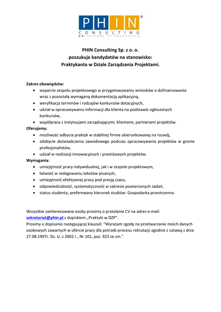 PHIN Consulting Sp. z o. o. poszukuje kandydatów na stanowisko: Praktykanta w Dziale Zarządzania Projektami. Zakres obowiązków: wsparcie zespołu projektowego w przygotowywaniu wniosków o dofinansowanie wraz z pozostałą wymaganą dokumentacją aplikacyjną, weryfikacja terminów i rodzajów konkursów dotacyjnych, udział w opracowywaniu informacji dla klienta na podstawie ogłoszonych konkursów, współpraca z instytucjami zarządzającymi, klientami, partnerami projektów. Oferujemy: możliwość odbycia praktyk w stabilnej firmie ukierunkowanej na rozwój, zdobycie doświadczenia zawodowego podczas opracowywania projektów w gronie profesjonalistów, udział w realizacji innowacyjnych i prestiżowych projektów. Wymagania: umiejętność pracy indywidualnej, jak i w zespole projektowym, łatwość w redagowaniu tekstów pisanych, umiejętność efektywnej pracy pod presją czasu, odpowiedzialność, systematyczność w zakresie powierzonych zadań, status studenta, preferowany kierunek studiów- Gospodarka przestrzenna. Wszystkie zainteresowane osoby prosimy o przesłanie CV na adres e-mail: [email protected] z dopiskiem „Praktyki w DZP”. Prosimy o dopisanie następującej klauzuli: "Wyrażam zgodę na przetwarzanie moich danych osobowych zawartych w ofercie pracy dla potrzeb procesu rekrutacji zgodnie z ustawą z dnia 27.08.1997r. Dz. U. z 2002 r., Nr 101, poz. 923 ze zm."