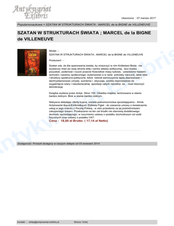 Utworzono : 07 marzec 2017 Popularnonaukowe > SZATAN W STRUKTURACH ŚWIATA ; MARCEL de la BIGNE de VILLENEUVE SZATAN W STRUKTURACH ŚWIATA ; MARCEL de la BIGNE de VILLENEUVE s i r b Model : SZATAN W STRUKTURACH ŚWIATA ; MARCEL de la BIGNE de VILLENEUVE Producent : - i l x Szatan wie, że dla opanowania świata, by zniszczyć w nim Królestwo Boże, nie wystarczy mieć po swej stronie elitę i centra władzy politycznej, lecz trzeba pozyskać, poderwać i rzucić przeciw Kościołowi masy ludowe, uwiedzione hasłami wolności i awansu społecznego; wylansować a w razie potrzeby narzucić, takie idee i struktury społeczno-polityczne, które niemal samoczynnie będą deprawować i dechrystianizować umysły, sumienia i obyczaje, szybko doprowadzać do wygaśnięcia wiary i nieodwracalnej apostazji całych narodów, że... musi stworzyć demokrację. E t a i r a w k y t n A Książka wydana przez Antyk. Stron 155. Okładka miękka, laminowana w stanie bardzo dobrym. Blok w stanie bardzo dobrym. Nabywca składając ofertę kupna, udziela pełnomocnictwa sprzedającemu - firmie Antykwariat "Exlibris" Elżbieta Figiel - do zawarcia umowy o świadczenie usług w jego imieniu z Pocztą Polską - w celu przesłania za jej pośrednictwem zakupionego towaru. Przekazane na ten cel środki nie stanowią dodatkowego dochodu sprzedającego, w rozumieniu ustawy o podatku dochodowym od osób fizycznych oraz ustawy o podatku VAT. Cena : 18,00 zł Brutto ( 17,14 zł Netto) Dostępność: Produkt dostępny w naszym sklepie od 03 wrzesień 2014 kontakt : - [email protected] Strona 1/{nb}