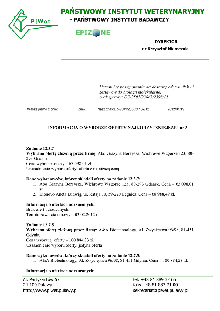 PAŃSTWOWY INSTYTUT WETERYNARYJNY - PAŃSTWOWY INSTYTUT BADAWCZY DYREKTOR dr Krzysztof Niemczuk Uczestnicy postępowania na dostawę odczynników i zestawów do biologii molekularnej znak sprawy: DZ-2501/23663/2398/11 Wasze pismo z dnia: Znak: Nasz znak:DZ-2501/23663/ 187/12 2012/01/19 INFORMACJA O WYBORZE OFERTY NAJKORZYTSNIEJSZEJ nr 3 Zadanie 12.3.7 Wybrano ofertę złożoną przez firmę: Abo Grażyna Boreysza, Wichrowe Wzgórze 123, 80293 Gdańsk. Cena wybranej oferty – 63.098,01 zł. Uzasadnienie wyboru oferty: oferta z najniższą ceną Dane wykonawców, którzy składali oferty na zadanie 12.3.7: 1. Abo Grażyna Boreysza, Wichrowe Wzgórze 123, 80-293 Gdańsk. Cena – 63.098,01 zł. 2. Bionovo Aneta Ludwig, ul. Rataja 30, 59-220 Legnica. Cena – 68.988,49 zł. Informacja o ofertach odrzuconych: Brak ofert odrzuconych. Termin zawarcia umowy – 03.02.2012 r. Zadanie 12.7.5 Wybrano ofertę złożoną przez firmę: A&A Biotechnology, Al. Zwycięstwa 96/98, 81-451 Gdynia. Cena wybranej oferty – 100.884,23 zł. Uzasadnienie wyboru oferty: jedyna oferta Dane wykonawców, którzy składali oferty na zadanie 12.7.5: 1. A&A Biotechnology, Al. Zwycięstwa 96/98, 81-451 Gdynia. Cena – 100.884,23 zł. Informacja o ofertach odrzuconych: Al. Partyzantów 57 24-100 Puławy http://www.piwet.pulawy.pl tel. +48 81 889 32 65 faks +48 81 887 71 00 [email protected] Brak ofert odrzuconych. Termin zawarcia umowy – 24.01.2011 r. Zadanie 12.7.12 Wybrano ofertę złożoną przez firmę: Krzysztof Kucharczyk Techniki Elektroforetyczne, ul. Pawińskiego 5A, 02-106 Warszawa. Cena wybranej oferty – 14.132,70 zł. Uzasadnienie wyboru oferty: jedyna oferta Dane wykonawców, którzy składali oferty na zadanie 12.7.12: 1. Krzysztof Kucharczyk Techniki Elektroforetyczne, ul. Pawińskiego 5A, 02-106 Warszawa. Cena – 14.132,70 zł. Informacja o ofertach odrzuconych: Brak ofert odrzuconych. Termin zawarcia umowy – 24.01.2011 r. Zadanie 12.7.12a Wybrano ofertę złożoną przez firmę: Abo Grażyna Boreysza, Wichrowe Wzgórze 123, 80293 Gdańsk. Cena wybranej oferty – 1242,30 zł. Uzasadnienie wyboru oferty: jedyna oferta Dane wykonawców, którzy składali oferty na zadanie 12.7.12a: 1. Abo Grażyna Boreysza, Wichrowe Wzgórze 123, 80-293 Gdańsk. Cena – 1242,30 zł. Informacja o ofertach odrzuconych: Brak ofert odrzuconych. Termin zawarcia umowy – 24.01.2012 r. Zadanie 12.8.1 Wybrano ofertę złożoną przez firmę: Bio-Rad Polska Sp. z o.o., ul. Nakielska 3, 01-106 Warszawa. Cena wybranej oferty – 2.337,00 zł. Uzasadnienie wyboru oferty: oferta z najniższą ceną Dane wykonawców, którzy składali oferty na zadanie 12.8.1: 1. Bio-Rad Polska Sp. z o.o., ul. Nakielska 3, 01-106 Warszawa. Cena – 2.337,00 zł. zł. 2. Bionovo Aneta Ludwig, ul. Rataja 30, 59-220 Legnica. Cena – 2.736,26zł. Informacja o ofertach odrzuconych: Brak ofert odrzuconych. Termin zawarcia umowy – 03.02.2012 r. Zadanie 12.8.2 Wybrano ofertę złożoną przez firmę: Labart Sp. z o.o., ul. Limbowa 5, 80-175 Gdańsk. Cena wybranej oferty – 19.951,09 zł. Uzasadnienie wyboru oferty: oferta z najniższą ceną Dane wykonawców, którzy składali oferty na zadanie 12.8.2: 1. LKB Biotech Sp.j., ul. Grójecka 130 lok. 12, 02-383 Warszawa. Cena – 90.668,22 zł. 2. Labart Sp. z o.o., ul. Limbowa 5, 80-175 Gdańsk. Cena – 19.951,09 zł. 3. Bionovo Aneta Ludwig, ul. Rataja 30, 59-220 Legnica. Cena –23.705,18 zł. Informacja o ofertach odrzuconych: Brak ofert odrzuconych. Termin zawarcia umowy – 03.02.2012 r. Zadanie 12.11.20 Wybrano ofertę złożoną przez firmę: Bio-Rad Polska Sp. z o.o., ul. Nakielska 3, 01-106 Warszawa. Cena wybranej oferty – 4.403,40 zł. Uzasadnienie wyboru oferty: oferta z najniższą ceną Dane wykonawców, którzy składali oferty na zadanie 12.11.20: 1. Bio-Rad Polska Sp. z o.o., ul. Nakielska 3, 01-106 Warszawa. Cena – 4.403,40 zł. zł. 2. Bionovo Aneta Ludwig, ul. Rataja 30, 59-220 Legnica. Cena – 5.736,08 zł. Informacja o ofertach odrzuconych: Brak ofert odrzuconych. Termin zawarcia umowy – 03.02.2012 r. Zadanie 12.11.21 Wybrano ofertę złożoną przez firmę: Labart Sp. z o.o., ul. Limbowa 5, 80-175 Gdańsk. Cena wybranej oferty – 3.766,79 zł. Uzasadnienie wyboru oferty: oferta z najniższą ceną Dane wykonawców, którzy składali oferty na zadanie 12.11.21: 1. Labart Sp. z o.o., ul. Limbowa 5, 80-175 Gdańsk. Cena – 3.766,79 zł. 2. Immuniq Beata Solon-Gogol, ul. Sąsiedzka 1m 44-240 Żory. Cena –8.468,55 zł. Informacja o ofertach odrzuconych: Brak ofert odrzuconych. Termin zawarcia umowy – 03.02.2012 r. Zadanie 12.11.29 Wybrano ofertę złożoną przez firmę: Krzysztof Kucharczyk Techniki Elektroforetyczne, ul. Pawińskiego 5A, 02-106 Warszawa. Cena wybranej oferty – 735,54 zł. Uzasadnienie wyboru oferty: jedyna oferta Dane wykonawców, którzy składali oferty na zadanie 12.11.29: 1. Krzysztof Kucharczyk Techniki Elektroforetyczne, ul. Pawińskiego 5A, 02-106 Warszawa. Cena – 735,54 zł. Informacja o ofertach odrzuconych: Brak ofert odrzuconych. Termin zawarcia umowy – 24.01.2011 r. Zadanie 12.11.29A Wybrano ofertę złożoną przez firmę: Abo Grażyna Boreysza, Wichrowe Wzgórze 123, 80293 Gdańsk. Cena wybranej oferty – 496,92 zł. Uzasadnienie wyboru oferty: jedyna oferta Dane wykonawców, którzy składali oferty na zadanie 12.11.29a: 1. Abo Grażyna Boreysza, Wichrowe Wzgórze 123, 80-293 Gdańsk. Cena – 496,92 zł. Informacja o ofertach odrzuconych: Brak ofert odrzuconych. Termin zawarcia umowy – 24.01.2012 r. INFORMACJA O ŚRODKACH OCHRONY PRAWNEJ Od niniejszej decyzji przysługują środki ochrony prawnej opisane w Dziale VI ustawy Prawo zamówień publicznych. Odwołanie przysługuje wyłącznie od niezgodnej z przepisami ustawy czynności zamawiającego podjętej w postępowaniu o udzielenie zamówienia lub zaniechania czynności, do której zamawiający jest zobowiązany na podstawie ustawy. Terminy wniesienia odwołania uregulowa