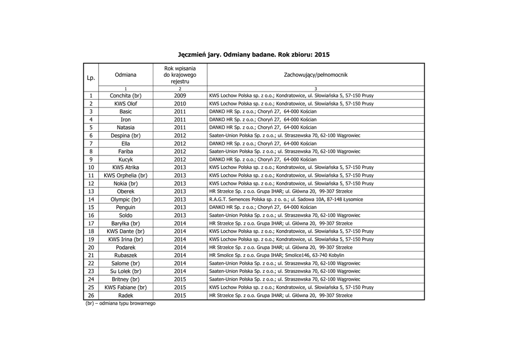 Jęczmień jary. Odmiany badane. Rok zbioru: 2015 Lp.