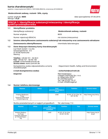 karta charakterystyki zgodnie z rozporządzeniem (WE) nr 1907/2006 (REACH), zmienionej 2015/830/UE Wodorotlenek sodowy, roztwór 50%, czysty numer artykułu: 8655 Wersja: 1.0 pl data sporządzenia: 07.04.2016 SEKCJA 1: Identyfikacja substancji/mieszaniny i identyfikacja spółki/przedsiębiorstwa 1.1 1.2 Identyfikator produktu Identyfikacja substancji Wodorotlenek sodowy, roztwór Numer artykułu 8655 Numer rejestracji (REACH) nie istotne (mieszanina) Istotne zidentyfikowane zastosowania substancji lub mieszaniny oraz zastosowania odradzane Zastosowania zidentyfikowane: 1.3 chemikalia laboratoryjna Dane dotyczące dostawcy karty charakterystyki Carl Roth GmbH + Co KG Schoemperlenstr. 3-5 D-76185 Karlsruhe Niemcy Telefon: +49 (0) 721 - 56 06 0 Fax: +49 (0) 721 - 56 06 149 e-mail: [email protected] Strona www: www.carlroth.de 1.4 Kompetentna osoba odpowiedzialna za kartę charakterystyki : Department Health, Safety and Environment e-mail (kompetentna osoba) : [email protected] Importer Wprowadzający: Linegal Chemicals Sp. z o.o. ul. Kasprzaka 44/52 01-224 Warszawa Tel: +48 22 631 16 27 E-mail: [email protected] Numer telefonu alarmowego Nazwa Ulica Kod pocztowy/miejscowość Telefon Strona www Łódź 42 631 47 24 (Fax: 42 657 42 95) http://www.imp.lodz.p l/ Instytut Medycyny Pracy Centrum Informacji Toksykologicznej Służba powiadamianych w nagłych przypadkach Nazwa Instytut Medycyny Pracy Centrum Informacji Toksykologicznej Polska (pl) Ulica Tel. alarmowy 112 . Kod pocztowy/miejscowość Telefon Łódź 42 631 47 24 (Fax: 42 657 42 95) Fax Strona www http://www.imp.lo dz.pl/ Strona 1 / 14 karta charakterystyki zgodnie z rozporządzeniem (WE) nr 1907/2006 (REACH), zmienionej 2015/830/UE Wodorotlenek sodowy, roztwór 50%, czysty numer artykułu: 8655 SEKCJA 2: Identyfikacja zagrożeń 2.1 Klasyfikacja substancji lub mieszaniny Klasyfikacja zgodnie z rozporządzeniem (WE) nr 1272/2008 (CLP) Klasyfikacja zg. z GHS Sekcja Klasa zagrożenia Klasa i kategoria zagrożenia Zwrot wskazujący rodzaj zagrożenia 2.16 substancja lub mieszanina powodująca korozję metali (Met. Corr. 1) H290 3.2 działanie żrące/podrażniające na skórę (Skin Corr. 1A) H314 3.3 poważne uszkodzenie oczu/działanie drażniące na oczy (Eye Dam. 1) H318 Uwagi Pełny tekst zwrotów wskazujących rodzaj zagrożenia i zwrotów EUH: zob. SEKCJA 16. 2.2 Elementy oznakowania Oznakowania zgodnie z rozporządzeniem (WE) nr 1272/2008 (CLP) Hasło ostrzegawcze Niebezpieczeństwo Piktogramy Zwroty wskazujące rodzaj zagrożenia H290 H314 Może powodować korozję metali. Powoduje poważne oparzenia skóry oraz uszkodzenia oczu. Zwroty wskazujące środki ostrożności Zwroty wskazujące środki ostrożności - zapobieganie P280 Stosować rękawice ochronne/odzież ochronną/ochronę oczu/ochronę twarzy. Zwroty wskazujące środki ostrożności - reagowanie P303+P361+P353 P305+P351+P338 P310 P390 W PRZYPADKU KONTATKU ZE SKÓRĄ (lub z włosami): Natychmiast zdjąć całą zanieczyszczoną odzież. Spłukać skórę pod strumieniem wody/prysznicem. W PRZYPADKU DOSTANIA SIĘ DO OCZU: ostrożnie płukać wodą przez kilka minut. Wyjąć soczewki kontaktowe, jeżeli są i można je łatwo usunąć. Kontynuować płukanie. Natychmiast skontaktować się z OŚRODKIEM ZATRUĆ/lekarzem. Usunąć wyciek, aby zapobiec szkodom materialnym. Niebezpieczne składniki do oznakowania: Polska (pl) wodorotlenek sodu Strona 2 / 14 karta charakterystyki zgodnie z rozporządzeniem (WE) nr 1907/2006 (REACH), zmienionej 2015/830/UE Wodorotlenek sodowy, roztwór 50%, czysty numer artykułu: 8655 Oznakowanie opakowań, których zawartość nie przekracza 125 ml Hasło ostrzegawcze: Niebezpieczeństwo Symbol(-e) H314 Powoduje poważne oparzenia skóry oraz uszkodzenia oczu. P280 Stosować rękawice ochronne/odzież ochronną/ochronę oczu/ochronę twarzy. P303+P361+P353 W PRZYPADKU KONTATKU ZE SKÓRĄ (lub z włosami): Natychmiast zdjąć całą zanieczyszczoną odzież. Spłukać skórę pod strumieniem wody/prysznicem. P305+P351+P338 W PRZYPADKU DOSTANIA SIĘ DO OCZU: ostrożnie płukać wodą przez kilka minut. Wyjąć soczewki kontaktowe, jeżeli są i można je łatwo usunąć. Kontynuować płukanie. P310 Natychmiast skontaktować się z OŚRODKIEM ZATRUĆ/lekarzem. zawiera: Wodorotlenek sodu 2.3 Inne zagrożenia Nie ma dodatkowych informacji. SEKCJA 3: Skład/informacja o składnikach 3.2 Mieszaniny Opis mieszanki Skład/informacja o składnikach. Nazwa substancji Identyfikator wt% Klasyfikacja zg. z 1272/2008/WE wodorotlenek sodu Nr. CAS 1310-73-2 40 50 Met. Corr. 1 / H290 Skin Corr. 1A / H314 Eye Dam. 1 / H318 Nr. WE 215-185-5 Nr. indeksowy 011-002-00-6 Nr. rej. REACH 01-211945789227-XXXX Piktogramy Specyficzne stężenia graniczne Skin Corr. 1A; H314: C≥5% Skin Corr. 1B; H314: 2 %≤C<5% Skin Irrit. 2; H315: 0,5 %≤C<2% Eye Dam. 1; H318: C ≥2% Eye Irrit. 2; H319: 0,5 %≤C<2% Uwagi Pełny tekst zwrotów wskazujących rodzaj zagrożenia i zwrotów EUH: zob. SEKCJA 16. SEKCJA 4: Środki pierwszej pomocy 4.1 Opis środków pierwszej pomocy Uwagi ogólne Natychmiast zdjąć całą zanieczyszczoną odzież. Samoochrona udzielających pierwszej pomocy. Polska (pl) Strona 3 / 14 karta charakterystyki zgodnie z rozporządzeniem (WE) nr 1907/2006 (REACH), zmienionej 2015/830/UE Wodorotlenek sodowy, roztwór 50%, czysty numer artykułu: 8655 Po narażeniu przez drogi oddechowe Gazy/opary, żrący. W przypadku nieregularnego oddechu lub bezdechu należy natychmiast zgłosić się do lekarza i rozpocząć czynności pierwszej pomocy. Po kontakcie ze skórą Zanieczyszczoną skórę natychmiast przemyć dużą ilością wody. Konieczna jest natychmiastowa pomoc medyczna, tak aby nie doprowadzić do przewlekłego i ciężkiego gojenia się ran. Po kontakcie z oczami W przypadku przedostania się do oczu natychmiast przemywać przez 10 do 15 minut przy otwartej powiece bieżącą wodą i zasięgnąć porady lekarza. Chronić nieuszkodzone oko. Po na