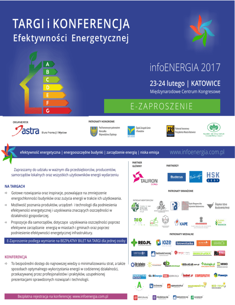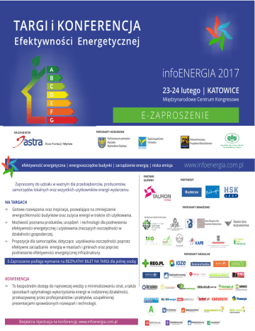 TARGI i KONFERENCJA Efektywności Energetycznej infoENERGIA 2017 23-24 lutego | KATOWICE Międzynarodowe Centrum Kongresowe E-ZAPROSZENIE PATRONATY HONOROWE ORGANIZATOR Biuro Promocji i Wystaw Pod honorowym patronatem Marszałka Województwa Śląskiego Śląski Związek Gmin i Powiatów efektywność energetyczna | energooszczędne budynki | zarządzenie energią | niska emisja PARTNER GŁÓWNY Patronat honorowy Prezydenta Miasta Katowice www.infoenergia.com.pl PARTNERZY Zapraszamy do udziału w ważnym dla przedsiębiorców, producentów, samorządów lokalnych oraz wszystkich użytkowników energii wydarzeniu NA TARGACH Gotowe rozwiązania oraz inspiracje, pozwalające na zmniejszenie energochłonności budynków oraz zużycia energii w trakcie ich użytkowania. Możliwość poznania produktów, urządzeń i technologii dla podniesienia efektywności energetycznej i uzyskiwania znaczących oszczędności w działalności gospodarczej. Propozycje dla samorządów, dotyczące uzyskiwania oszczędności poprzez efektywne zarządzanie energią w miastach i gminach oraz poprzez podniesienie efektywności energetycznej infrastruktury. E-Zaproszenie podlega wymianie na BEZPŁATNY BILET NA TARGI dla jednej osoby KONFERENCJA To bezpośredni dostęp do najnowszej wiedzy o minimalizowaniu strat, a także sposobach optymalnego wykorzystania energii w codziennej działalności, przekazywanej przez profesjonalistów i praktyków, uzupełnionej prezentacjami sprawdzonych rozwiązań i technologii. Bezpłatna rejestracja na konferencję: www.infoenergia.com.pl PATRONATY BRANŻOWE PATRONAT MERYTORYCZNY Śląska Okręgowa Izba Inżynierów Budownictwa PATRONATY MEDIALNE