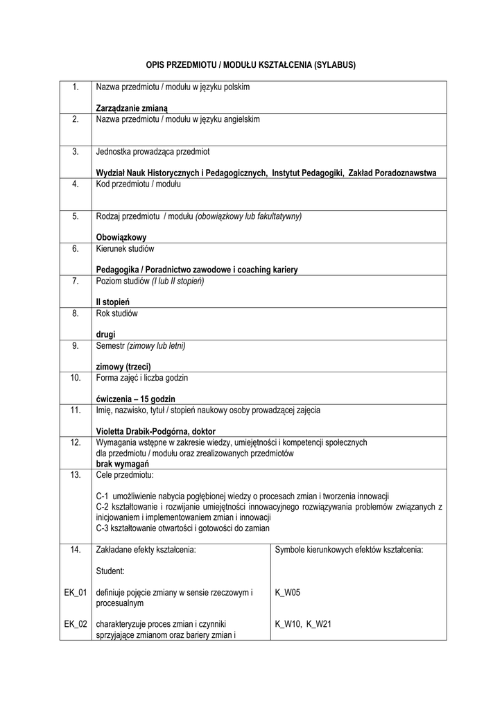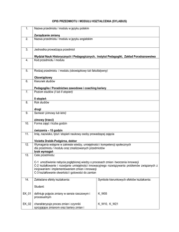 OPIS PRZEDMIOTU / MODUŁU KSZTAŁCENIA (SYLABUS) 1. Nazwa przedmiotu / modułu w języku polskim 2. Zarządzanie zmianą Nazwa przedmiotu / modułu w języku angielskim 3. Jednostka prowadząca przedmiot 4. Wydział Nauk Historycznych i Pedagogicznych, Instytut Pedagogiki, Zakład Poradoznawstwa Kod przedmiotu / modułu 5. Rodzaj przedmiotu / modułu (obowiązkowy lub fakultatywny) 6. Obowiązkowy Kierunek studiów 7. Pedagogika / Poradnictwo zawodowe i coaching kariery Poziom studiów (I lub II stopień) 8. II stopień Rok studiów 9. drugi Semestr (zimowy lub letni) 10. zimowy (trzeci) Forma zajęć i liczba godzin 11. ćwiczenia – 15 godzin Imię, nazwisko, tytuł / stopień naukowy osoby prowadzącej zajęcia 12. 13. Violetta Drabik-Podgórna, doktor Wymagania wstępne w zakresie wiedzy, umiejętności i kompetencji społecznych dla przedmiotu / modułu oraz zrealizowanych przedmiotów brak wymagań Cele przedmiotu: C-1 umożliwienie nabycia pogłębionej wiedzy o procesach zmian i tworzenia innowacji C-2 kształtowanie i rozwijanie umiejętności innowacyjnego rozwiązywania problemów związanych z inicjowaniem i implementowaniem zmian i innowacji C-3 kształtowanie otwartości i gotowości do zamian 14. Zakładane efekty kształcenia: Symbole kierunkowych efektów kształcenia: Student: EK_01 definiuje pojęcie zmiany w sensie rzeczowym i procesualnym K_W05 EK_02 charakteryzuje proces zmian i czynniki sprzyjające zmianom oraz bariery zmian i K_W10, K_W21 innowacji EK_03 rozumie procesy zmian organizacyjnych i edukacyjnych oraz procesy zmian grup i jednostek K_W17 EK_04 indentyfikuje uczestników procesów zmian i wybiera skuteczne strategie przełamywania oporu wobec zmian K_U10, K_K09, EK_05 generuje oryginalne rozwiązania w odpowiedzi na potrzebę zmiany i potrafi prognozować przebieg procesu zmian i przewidzieć skutki zaplanowanych działań K_U11, K_U12 K_K01 EK_06 wykorzystuje narzędzia poztywnej tranfromacji jednostek i organizacji EK_07 docenia znaczenie kultury promującej promującej zmianę 15. Treści programowe: Zmiany i innowacje – teorie zmiany a innowatyka pedagogiczna. Zarządzanie zmianą w organizacji. Przyczyny zmian. Rodzaje zmian. Zmiana jako efekt i jako proces (sens rzeczowy i czynnościowy). Zmiana struktury i zmiana zasobów ludzkich. Procesy zmiany – rozmorożenie, zmiana, zamrożenie. Postawy wobec zmiany – innowatorzy, pionierzy, maruderzy, opór. Rola liderów zmian – wizjonerskie przywództwo. Informacja, wyjaśnianie i przekonywanie – czynniki powodzenia zmian. Procedury / modele zarządzania zmianą - od diagnozy otoczenia zewnętrznego po ocenę wewnętrznego potencjału – wykorzystanie analizy SWOT; Planowanie, kreowanie kultury promującej zmianę. Destabilizacja, okresy przejściowe i tranzycje. Opór wobec zmian – przyczyny i przezwycieżanie oporu. Analiza pola sił K.Levina. Analiza strategiczna M. Croziera - tor przeszkód z podwójną pętla przekształceń. Coaching i poradnictwo jako pomoc w zarządzaniu zmianami w życiu jednostek. Narzędzia pozytywnej tranformacji. Gotowość do zmian – warsztat. 16. Zalecana literatura (podręczniki) L. Clarke, Zarządzanie zmianą, Gebethner i Spółka ,Warszawa 1997 M. Crozier, E. Friedberg, Człowiek i system. Ograniczenia działania zaspołowego, Warszawa 1982 M. Crozier, Kryzys inteligencji. Szkic o niezdolności elit do zmian, Warszawa 1996 R. Schulz, Studia z innowatyki pedagogicznej, Toruń 1996 B. Śliwerski, Klinika szkolnej demokracji, Kraków 1996 B. Śliwerski, Jak zmieniać szkołę. Studia z polityki oświatowej i pedagogiki porównawczej, Kraków 1998. I. Majewska-Opiełka, Agent pozytywnej zmiany, Rebis, Poznań 2009 J. Kotter, Gdy góra lodowa topnieje. Wprowadzanie zmian w każdych okolicznościach, Wyd. Helion, Gliwice 2005 Cohen D.S., Sedno zmian. Narzędzia i taktyki pozytywnej transformacji twojej firmy, Wyd. Helion, Gliwice 2008 D. Ekiert-Grabowska, D. Oldroyd, Kierowanie zmianą, Wyd. MEN, Warszawa 1996 D. Elsner, Kierowanie zmianą w szkole,Wydawnictwo CODN, Warszawa 2005 17. Forma zaliczenia poszczególnych komponentów przedmiotu / modułu, sposób sprawdzenia osiągnięcia zamierzonych efektów kształcenia: wykład: --------ćwiczenia: zaliczenie na ocenę Kryteria oceny: Ocena bardzo dobra – student ma ugruntowaną wiedzę z zakresu zarządzania zmianą: definiuje pojęcie zmiany w sensie rzeczowym i procesualnym, charakteryzuje proces zmian i czynniki sprzyjające zmianom oraz bariery zmian i innowacji, rozumie procesy zmian organizacyjnych i edukacyjnych oraz procesy zmian grup i jednostek, indentyfikuje uczestników procesów zmian i wybiera skuteczne strategie przełamywania oporu wobec zmian, generuje oryginalne rozwiązania w odpowiedzi na potrzebę zmiany i potrafi prognozować przebieg procesu zmian i przewidzieć skutki zaplanowanych działań, wykorzystuje narzędzia pozytywnej tranfromacji jednostek i organizacji, docenia znaczenie kultury promującej promującej zmianę. Ocena dobra – student ma wystarczającą wiedzę z zakresu zarządzania zmianą: definiuje pojęcie zmiany w sensie rzeczowym i procesualnym, charakteryzuje proces zmian i czynniki sprzyjające zmianom oraz bariery zmian i innowacji, rozumie procesy zmian organizacyjnych i edukacyjnych oraz procesy zmian grup i jednostek, indentyfikuje uczestników procesów zmian i wybiera skuteczne strategie przełamywania oporu wobec zmian, generuje oryginalne rozwiązania w odpowiedzi na potrzebę zmiany i potrafi prognozować przebieg procesu zmian i przewidzieć skutki zaplanowanych działań, wykorzystuje narzędzia poztywnej tranfromacji jednostek i organizacji, docenia znaczenie kultury promującej promującej zmianę. Ocena dostateczna – student ma dostateczną wiedzę z zakresu z zakresu zarządzania zmianą: definiuje pojęcie zmiany w sensie rzeczowym i procesualnym, charakteryzuje proces zmian i czynniki sprzyjające zmianom oraz bariery zmian i innowacji, rozumie pr