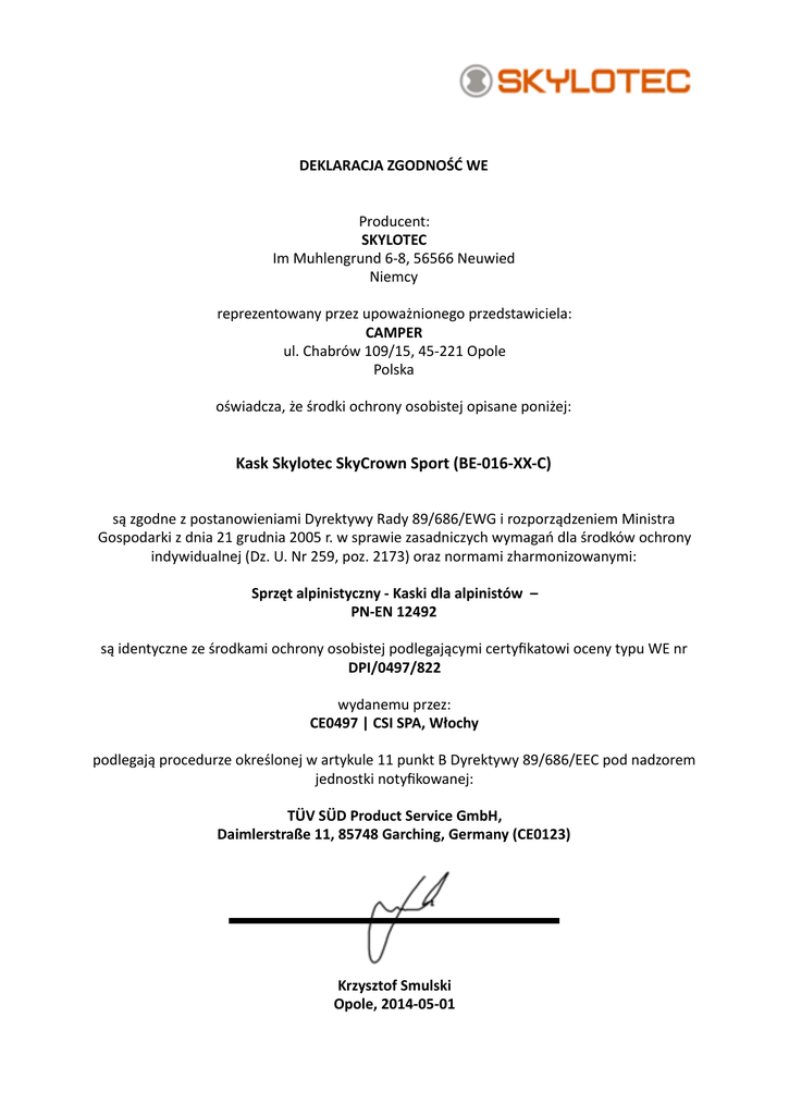 DEKLARACJAZGODNOŚĆWE Producent: SKYLOTEC ImMuhlengrund6-8,56566Neuwied Niemcy reprezentowanyprzezupoważnionegoprzedstawiciela: CAMPER ul.Chabrów109/15,45-221Opole Polska oświadcza,żeśrodkiochronyosobistejopisaneponiżej: KaskSkylotecSkyCrownSport(BE-016-XX-C) sązgodnezpostanowieniamiDyrektywyRady89/686/EWGirozporządzeniemMinistra Gospodarkizdnia21grudnia2005r.wsprawiezasadniczychwymagańdlaśrodkówochrony indywidualnej(Dz.U.Nr259,poz.2173)oraznormamizharmonizowanymi: Sprzętalpinistyczny-Kaskidlaalpinistów– PN-EN12492 sąidentyczneześrodkamiochronyosobistejpodlegającymicertyfikatowiocenytypuWEnr DPI/0497/822 wydanemuprzez: CE0497|CSISPA,Włochy podlegająprocedurzeokreślonejwartykule11punktBDyrektywy89/686/EECpodnadzorem jednostkinotyfikowanej: TÜVSÜDProductServiceGmbH, Daimlerstraße11,85748Garching,Germany(CE0123) KrzysztofSmulski Opole,2014-05-01