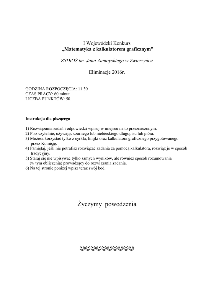 I Wojewódzki Konkurs „Matematyka z kalkulatorem graficznym” ZSDiOŚ im. Jana Zamoyskiego w Zwierzyńcu Eliminacje 2016r. GODZINA ROZPOCZĘCIA: 11.30 CZAS PRACY: 60 minut. LICZBA PUNKTÓW: 50. Instrukcja dla piszącego 1) Rozwiązania zadań i odpowiedzi wpisuj w miejscu na to przeznaczonym. 2) Pisz czytelnie, używając czarnego lub niebieskiego długopisu lub pióra. 3) Możesz korzystać tylko z cyrkla, linijki oraz kalkulatora graficznego przygotowanego przez Komisję. 4) Pamiętaj, jeśli nie potrafisz rozwiązać zadania za pomocą kalkulatora, rozwiąż je w sposób tradycyjny. 5) Staraj się nie wpisywać tylko samych wyników, ale również sposób rozumowania (w tym obliczenia) prowadzący do rozwiązania zadania. 6) Na tej stronie poniżej wpisz teraz swój kod. Życzymy powodzenia ZADANIE 1 (4pkt) 2 3 24 3 3 3 a) Oblicz dokładną wartość wyrażenia: ( 1 ) 3 3 3 . 3 b) Wpisz w przygotowanej tabelce osiem pierwszych cyfr po przecinku rozwinięcia dziesiętnego wartości wyrażenia z podpunktu a). Rozwiązanie: a) Odpowiedź: a) ………………………………………………………………………….. Rozwiązanie: b) Odpowiedź: b) ZADANIE 2 (4pkt) Iloczyn dwóch kolejnych liczb całkowitych jest równy 123552. Wyznacz te liczby. Rozwiązanie: Odpowiedź: …………………………………………………………………………….. ZADANIE 3 (6pkt) Naszkicuj na kalkulatorze w tym samym układzie współrzędnych 4 wykresy funkcji f ( x) ax 2 3ax dla a = 1, a = -1, a = 2, a = -2. Następnie przerysuj je dokładnie w miejsce przeznaczone na rozwiązanie. Napisz jaką wspólną własność mają wszystkie te wykresy dla a 0? Rozwiązanie: Odpowiedź: …………………………………………………………………………….. ZADANIE 4 (4pkt) Oblicz wartość wyrażenia a4 b4 dla a 1001 i b 1000 . ab Rozwiązanie: Odpowiedź: …………………………………………………………………………….. ZADANIE 5 (6pkt) W 1938 roku amerykański psycholog R.Woodworth przeprowadził badania nad szybkością zapominania zdobytej wiedzy, gdy nie jest ona utrwalana. Okazało się, że zjawisko zapominania można opisać za pomocą tzw. funkcji logarytmicznej. Wyniki jednego z jego doświadczeń można opisać wzorem: M 100 15 ln( x 1) , gdzie M - procent pamiętanych wiadomości, x- liczba dni, które upłynęły od nauczenia się tych wiadomości. Korzystając odpowiedniej opcji kalkulatora graficznego napisz: a) Jaki procent wiadomości został zapomniany podczas badań Woodwortha w czasie pierwszych 5 dni. Wynik zaokrąglij do pełnych procentów. b) Po jakim czasie została zapomniana połowa wiadomości? Źródło: Matematyka 2, GWO Rozwiązanie: a) Odpowiedź: a) ………………………………………………………………………….. Rozwiązanie: b) Odpowiedź: b) ………………………………………………………………………… ZADANIE 6 (4pkt) 1 Podaj 128 cyfrę po przecinku w rozwinięciu dziesiętnym liczby 13 . Rozwiązanie: Odpowiedź: …………………………………………………………………………….. ZADANIE 7 (6pkt) 1 Wyznacz wszystkie cyfry okresu zasadniczego rozwinięcia dziesiętnego ułamka 19 . Rozwiązanie: Odpowiedź: ZADANIE 8 (6pkt) 1 Dane są równania linii prostych: y x , y 2 x 1 , y 3 x 2 . Linie te ograniczają trójkąt ABC. a) Wyznacz współrzędne wierzchołków A, B, C tego trójkąta. b) Oblicz obwód tego trójkąta. Rozwiązanie a): Odpowiedź a): …………………………………………………………………………….. Rozwiązanie b): Odpowiedź a): …………………………………………………………………………….. ZADANIE 9 (6pkt) a) Oblicz wartość sumy: 21 + 22 + 23 + … + 2n-1 + 2n dla każdego n = 1, 2, 3, …,10. Zapisz wartość każdej z tych sum. b) Sformułuj hipotezę dotyczącą podzielności n -tej sumy przez 6 zależności od n naturalnego. Uzasadnij tę hipotezę. Rozwiązanie a): Rozwiązanie b): Odpowiedź a): …………………………………………………………………………….. Odpowiedź b): …………………………………………………………………………….. ZADANIE 10 (4pkt) Piłkarz stojący w punkcie P = (1,1) kopie piłkę w kierunki bramki S1S2 (odcinek o końcach S1 = (5,4), S2 = (8,4) ). Zakładając, że tor lotu piłki jest w przybliżeniu linią prostą, napisz równania wszystkich takich prostych (w postaci: y = ax + b), aby piłka poruszając się po nich, trafiła w światło bramki (między słupki bramki S1S2 ) Rozwiązanie: Odpowiedź: ……………………………………………………………………………..