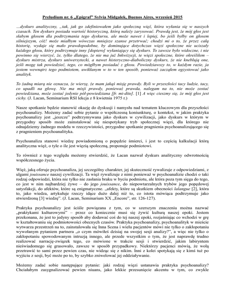 Preludium nr. 6 „Epigraf” Sylvia Midgalek, Buenos Aires, wrzesień 2015 …dyskurs analityczny, „tak, jak go zdefiniowałem jako społeczną więź, która wyłania się w naszych czasach. Ten dyskurs posiada wartość historyczną, którą należy zarysować. Prawdą jest, że mój głos jest słabym głosem dla podtrzymania tego dyskursu, ale może nawet i lepiej, bo jeśli byłby on głosem silniejszym, cóż! może miałbym wówczas mniejsze szanse przetrwać; chodzi mi o to, że przez całą historię, wydaje się mało prawdopodobne, by dominujące dotychczas więzi społeczne nie uciszały każdego głosu, który podtrzymuje inny [dopiero] wyłaniający się dyskurs. To zawsze było widoczne, i nie powinno się wierzyć, że, tylko dlatego, że nie ma już Inkwizycji, te więzi społeczne, które określiłem – dyskurs mistrza, dyskurs uniwersytecki, a nawet histeryczno-diaboliczny dyskurs, że nie kneblują one, jeśli mogę tak powiedzieć, tego, co mógłbym posiadać z głosu. Powiedziawszy to, w każdym razie, ja jestem wewnątrz tego podmiotem, uwikłanym w to w ten sposób, ponieważ zacząłem egzystować jako analityk. To żadną miarą nie oznacza, że wierzę, że mam jakąś misję prawdy. Byli w przeszłości tacy ludzie, tacy, co upadli na głowę. Nie ma misji prawdy, ponieważ prawda, nalegam na to, nie może zostać powiedziana, może zostać jedynie pół-powiedziana [fr. mi-dite]. [1] A więc cieszmy się, że mój głos jest cichy. (J. Lacan, Seminarium RSI lekcja z 8 kwietnia 1975 r.) Nasze spotkanie będzie stanowić okazję do dyskusji i namysłu nad tematem kluczowym dla przyszłości psychoanalizy. Możemy zadać sobie pytanie o współczesną koniunkturę, o kontekst, w jakim praktyka psychoanalizy jest „jeszcze” podtrzymywana jako dyskurs w cywilizacji, jako dyskurs w którym w przygodny sposób może zainstalować się niespotykany tryb społecznej więzi, dla którego nie odnajdziemy żadnego modelu w rzeczywistości, przygodne spotkanie pragnienia psychoanalizującego się z pragnieniem psychoanalityka. Psychoanaliza stanowi wiedzę powiadomioną o popędzie śmierci, i jest to częścią kalkulacji którą analityczna więź, o tyle o ile jest więzią społeczną, proponuje podmiotowi. To również z tego względu możemy stwierdzić, że Lacan nazwał dyskurs analityczny odwrotnością współczesnego życia. Więź, jaką oferuje psychoanaliza, jej szczególny charakter, jej skuteczność rywalizuje z odpowiedziami, z ulgami jouissance naszej cywilizacji. Ta więź rywalizuje z nimi ponieważ w psychoanalizie chodzi o taki rodzaj odpowiedzi, która nie tylko nie zasłania braku w byciu podmiotu, ale która poza tym sięga do tego, co jest w nim najbardziej żywe – do jego jouissance, do niepowtarzalnych trybów jego popędowej satysfakcji, do afektów, które są enigmatyczne. „afekty, które są skutkiem obecności lalangue [2], która to, jako wiedza, artykułuje rzeczy idące dużo dalej niż to, co istota mówiąca podtrzymuje jako stwierdzoną [3] wiedzę”. (J. Lacan, Seminarium XX „Encore”, str. 126-127). Praktyka psychoanalizy jest ściśle powiązana z tym, co w szerszym znaczeniu można nazwać „praktykami kulturowymi” – przez co koniecznie musi się żywić kulturą naszej epoki. Jestem przekonana, że jest to jedyny sposób aby dodawać coś do tej naszej epoki, rozjaśniając co wchodzi w grę w kształtowaniu się podmiotowości obecnych czasów. Praktyka psychoanalizy, psychoanalityk w mieście wytwarza przestrzeń na to, zainstalowała się Inna Scena i wielu pacjentów mówi nie tylko o zakłopotaniu wywołanym pytaniem partnera „o czym mówiłeś dzisiaj na swojej sesji analizy?”, a więc nie tylko o zakłopotaniu spowodowanym intruzją innego, ale przede wszystkim o tym, że jest naprawdę trudno realizować narrację-związek tego, co mówione w trakcie sesji i stwierdzić, jakim labiryntem nieświadomego się grasowało, zawsze w sposób przypadkowy. Niektórzy pacjenci mówią, że wolą przetrawić to sami przez pewien czas, nie widząc się z nikim. Inni z kolei spotykają się z kimś tuż po wyjściu z sesji, być może po to, by szybko zniwelować jej oddziaływanie. Możemy zadać sobie następujące pytanie: jaki rodzaj więzi ustanawia praktyka psychoanalizy? Chciałabym zasygnalizować pewien niuans, jako lekkie przesunięcie akcentu w tym, co zwykle rozumiemy przez nakaz Lacana, mianowicie, że psychoanaliza musi łączyć się z podmiotowością swoich czasów. Chciałabym wprowadzić niuans, orientując moje pytanie następująco: w jaki sposób psychoanaliza jako dyskurs pewnej epoki wpływa na podmiotowość swoich czasów? Będzie chodzić o to, by zastanowić się, przeszukać, zbadać i przejrzeć ponownie te pozycje, w jakich ustawiają się uczestnicy doświadczenia, oraz to, w jaki sposób przynosi to kliniczną skuteczność właściwą psychoanalizie. Na zakończenie, zaproponuję dla nadchodzących w Medellin dyskusji jedno z moich starych pytań, które moim zdaniem prowadzi nas do tematu obranego na IX Spotkanie „Wiązania i rozwiązania według kliniki psychoanalitycznej”, mianowicie – jakie jest leczenie w psychoanalizie? Tekst oryginalnie napisany po hiszpańsku, tłumaczenie na podstawie wersji francuskiej Vicky Estevez: Sara Rodowicz-Ślusarczyk Przypisy tłumaczki: [1] Istotne jest to, że można coś wypowiedzieć w połowie, co oddaje francuski neologizm mi-dire. Należy odróżnić wypowiadanie w połowie od powszechnego w języku polskim zwrotu, że ktoś mówi połowę prawdy (tj. coś skrywa lub kłamie). [2] Lalangue to termin określający język w jego wymiarze jouissance, która tworzy i przenika ciało. To wymiar języka nie niosący ze sobą żadnego sensu, jest to rozkosz gaworzenia, muzyczności języka która odbija się echem w ciele człowieka w jego najwcześniejszym dzieciństwie w kontakcie z matką. [2] Oryg.: énonciation, także: enuncj