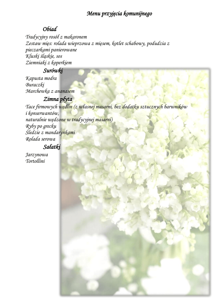 Menu przyjęcia komunijnego Obiad Tradycyjny rosół z makaronem Zestaw mięs: rolada wieprzowa z mięsem, kotlet schabowy, podudzia z pieczarkami panierowane Kluski śląskie, sos Ziemniaki z koperkiem Surówki Kapusta modra Buraczki Marchewka z ananasem Zimna płyta Tace firmowych wędlin (z własnej masarni, bez dodatku sztucznych barwników i konserwantów, naturalnie wędzone w tradycyjnej masarni) Ryby po grecku Śledzie z mandarynkami Rolada serowa Sałatki Jarzynowa Tortollini