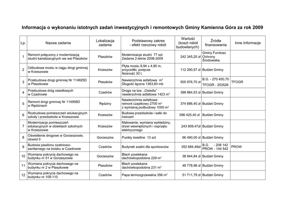Informacja o wykonaniu istotnych zadań inwestycyjnych i