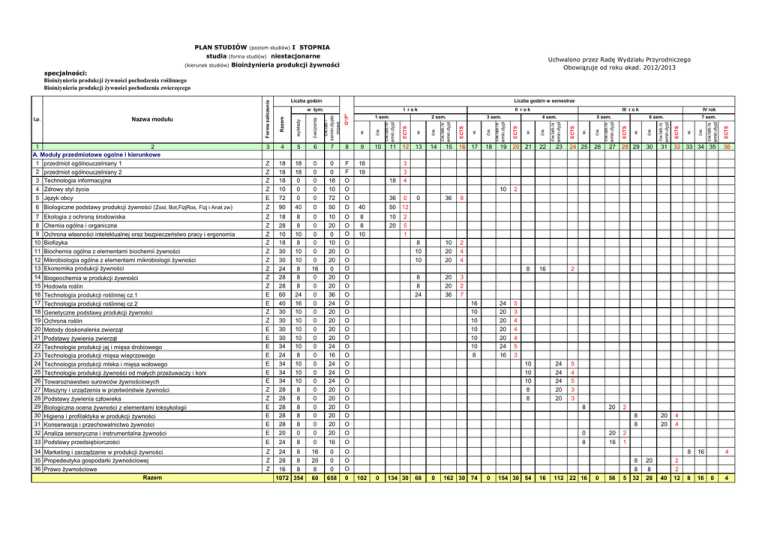 PLAN STUDIÓW (poziom studiów) I STOPNIA studia (forma studiów) niestacjonarne (kierunek studiów) Bioinżynieria produkcji żywności Uchwalono przez Radę Wydziału Przyrodniczego Obowiązuje od roku akad. 2012/2013 90 40 0 50 O Z Z Z Z Z Z Z Z Z E E Z Z E E E E E E E Z Z E E E E 18 28 10 18 30 30 24 28 28 60 40 30 30 30 30 34 24 34 34 34 28 28 28 28 28 20 8 8 10 8 10 10 8 8 8 24 16 10 10 10 10 10 8 10 10 10 8 8 8 8 8 0 0 0 0 0 0 0 16 0 0 0 0 0 0 0 0 0 0 0 0 0 0 0 0 0 0 0 10 20 0 10 20 20 0 20 20 36 24 20 20 20 20 24 16 24 24 24 20 20 20 20 20 20 O O O O O O O O O O O O O O O O O O O O O O O O O O E 24 8 0 16 O 16 20 8 60 0 0 0 658 O O O Z Z Z 24 8 28 8 16 8 1072 354 0 2 5 1 ćw. 12 10 20 w. 50 8 8 10 ćw. 40 ćw.lab./s emin.dypl . 0 w. ćw.lab./s emin.dypl . ECTS 36 0 36 8 8 10 10 10 20 20 2 4 4 8 8 24 20 20 36 3 2 7 20 21 22 23 10 2 8 16 10 10 10 10 10 8 24 20 20 20 20 24 16 16 24 25 26 27 28 29 20 2 30 31 32 33 34 35 20 20 4 4 40 2 2 12 2 24 24 24 20 20 5 4 5 3 3 8 8 8 0 134 30 68 0 162 30 74 0 36 5 3 4 4 4 5 3 10 10 10 8 8 102 ECTS Z 18 3 3 4 19 ćw.lab./s emin.dypl 18 18 18 w. F F O O O 16 17 ćw. 0 0 18 10 72 15 ECTS 0 0 0 0 0 14 7 sem. ćw. 18 18 0 0 0 13 w. 18 18 18 10 72 12 ćw. Z Z Z Z E 11 6 sem. ćw.lab./s emin.dypl . ECTS 10 w. 9 5 sem. ECTS 8 ćw. 7 ćw.lab./s emin.dypl . 6 IV rok III r o k 4 sem. w. 5 3 sem. ćw.lab./s emin.dypl . ECTS 4 II r o k 2 sem. ECTS 3 1 sem. ćw.lab./s emin.dypl 34 Marketing i zarządzanie w produkcji żywności 35 Propedeutyka gospodarki żywnościowej 36 Prawo żywnościowe Razem ćw. Biogeochemia w produkcji żywności Hodowla roślin Technologia produkcji roślinnej cz.1 Technologia produkcji roślinnej cz.2 Genetyczne podstawy produkcji żywności Ochrona roślin Metody doskonalenia zwierząt Podstawy żywienia zwierząt Technologie produkcji jaj i mięsa drobiowego Technologia produkcji mięsa wieprzowego Technologia produkcji mleka i mięsa wołowego Technologie produkcji żywności od małych przeżuwaczy i koni Towaroznawstwo surowców żywnościowych Maszyny i urządzenia w przetwórstwie żywności Podstawy żywienia człowieka Biologiczna ocena żywności z elementami toksykologii Higiena i profilaktyka w produkcji żywności Konserwacja i przechowalnictwo żywności Analiza sensoryczna i instrumentalna żywności 33 Podstawy przedsiębiorczości w. Ekologia z ochroną środowiska Chemia ogólna i organiczna Ochrona własności intelektualnej oraz bezpieczeństwo pracy i ergonomia Biofizyka Biochemia ogólna z elementami biochemii żywności Mikrobiologia ogólna z elementami mikrobiologii żywności Ekonomika produkcji żywności O*/F* 7 8 9 10 11 12 13 14 15 16 17 18 19 20 21 22 23 24 25 26 27 28 29 30 31 32 ćw.lab / semin.dyplo mowe 6 Biologiczne podstawy produkcji żywności (Zool, Bot,FizjRos, Fizj i Anat zw) I rok ćwiczenia 1 2 A. Moduły przedmiotowe ogolne i kierunkowe 1 przedmiot ogólnouczelniany 1 2 przedmiot ogólnouczelniany 2 3 Technologia informacyjna 4 Zdrowy styl życia 5 Język obcy Liczba godzin w semestrze w tym: wykłady Nazwa modułu Liczba godzin Razem Lp. Forma zaliczenia specjalności: Bioinżynieria produkcji żywności pochodzenia roślinnego Bioinżynieria produkcji żywności pochodzenia zwierzęcego 154 30 54 16 0 20 2 8 16 1 112 22 16 0 56 5 8 8 32 20 8 28 8 16 8 16 4 0 4 1 2 3 4 5 6 7 8 9 B. Moduły przedmiotowe specjalnościowe i fakultatywne: Bioinżynieria produkcji żywności pochodzenia zwierzęcego 10 11 12 13 14 15 16 17 18 19 20 21 22 23 24 25 1 Przedmiot specjalnościowy 2 Przedmiot specjalnościowy E 28 8 0 20 F 8 20 4 E 28 8 0 20 F 8 20 4 Przedmiot specjalnościowy Przedmiot specjalnościowy Przedmiot specjalnościowy Przedmiot specjalnościowy Przedmiot specjalnościowy Przedmiot specjalnościowy Przedmiot specjalnościowy Przedmiot fakulatytwny Przedmiot fakulatywny E E E E E E E Z Z 3 4 5 6 7 8 9 10 11 28 8 0 20 F 28 8 0 20 F 28 8 0 20 F 28 8 0 20 F 28 8 0 20 F 28 8 0 20 F 28 8 0 20 F 48 16 0 32 F 48 16 0 32 F Razem 348 104 0 244 0 0 Ogółem AB 1420 458 60 902 102 B. Moduły przedmiotowe specjalnościowe i fakultatywne: Bioinżynieria produkcji żywności pochodzenia roślinnego 8 8 8 8 8 0 0 0 0 134 30 0 68 0 0 0 0 0 162 30 74 0 0 0 0 16 154 30 70 0 16 40 8 40 152 30 56 1 Przedmiot specjalnościowy 2 Przedmiot specjalnościowy E 28 8 20 0 F 8 20 4 E 28 8 20 0 F 8 20 4 Przedmiot specjalnościowy Przedmiot specjalnościowy Przedmiot specjalnościowy Przedmiot specjalnościowy Przedmiot specjalnościowy Przedmiot specjalnościowy Przedmiot specjalnościowy Przedmiot fakulatywny Przedmiot fakulatywny E E E E E E E Z Z 28 28 28 28 28 28 28 48 48 348 8 8 8 8 8 8 8 16 16 104 0 0 0 0 0 0 0 0 0 40 20 20 20 20 20 20 20 32 32 204 F F F F F F F F F 0 0 0 1420 458 100 862 0 102 0 0 48 0 0 102 0 3 4 5 6 7 8 9 10 11 Razem Ogółem AB 26 0 0 0 134 30 0 68 0 0 0 162 30 74 0 0 0 16 40 154 30 70 0 0 56 0 0 27 28 29 20 20 20 20 20 5 5 5 5 5 8 8 8 8 100 25 32 156 30 64 30 31 32 29 30 31 32 0 28 20 5 20 5 16 4 8 16 4 8 72 18 16 0 112 30 24 16 16 16 32 32 4 4 8 12 16 16 32 4 4 8 8 8 8 8 8 20 20 20 20 20 40 0 8 8 8 8 100 25 32 0 20 20 16 16 72 112 30 56 0 156 30 64 28 112 30 24 16 32 12 0 48 18 48 18 112 40 24 16 80 30 0 8 5 5 5 5 5 5 5 4 8 4 8 18 16 0 C. Moduł: dyplomowy+ praktyka 1 Seminarium dyplomowe i przygotowanie do egz. dyplomowego 2 Praktyka zawodowa Razem Ogółem ABC Z Z 48 48 0 0 1468 458 0 48 O O 0 60 950 0 Ponadto studentów obowiązuje: 1. Szkolenie biblioteczne i szkolenie BHP w I semestrze 2. Praktyka zawodowa po ..III..... roku studiów, w wymiarze 8 tygodni, godzin 40 godz. tygodniowo............... . Studenci dokonują wyboru specjalności w 3 semestrze studiów Studia kończą się egzaminem dyplomowym Do planu studiów należy dołączyć wykaz przedmiotów do wyboru * O -przedmiot obowiązkowy do zaliczenia danego roku studiów F - przedmiot fakultatywny (do wyboru) 0 0 0 134 30 0 68 0 0 0 162 30 74 0 0 0 0 0 154 30 70 0 0 16 0 0 152 30 56 0 0 0 0 0 156 30 64 0 0 28 0 10 10 0 0 Prze