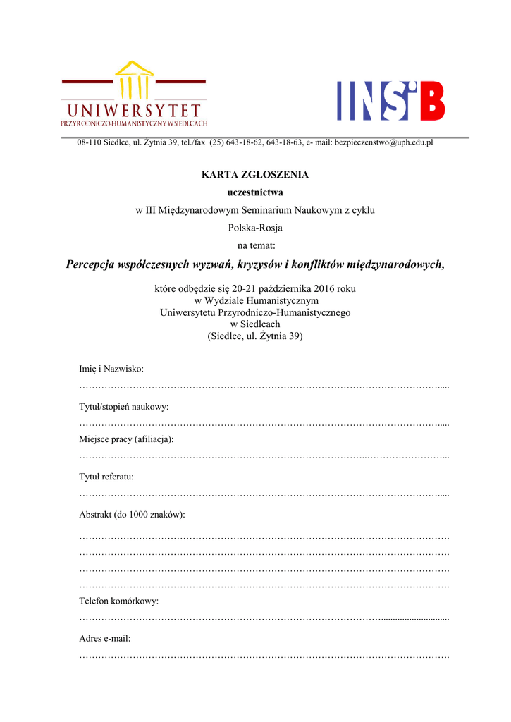 08-110 Siedlce, ul. Żytnia 39, tel./fax (25) 643-18-62, 643-18-63, e- mail: [email protected] KARTA ZGŁOSZENIA uczestnictwa w III Międzynarodowym Seminarium Naukowym z cyklu Polska-Rosja na temat: Percepcja współczesnych wyzwań, kryzysów i konfliktów międzynarodowych, które odbędzie się 20-21 października 2016 roku w Wydziale Humanistycznym Uniwersytetu Przyrodniczo-Humanistycznego w Siedlcach (Siedlce, ul. Żytnia 39) Imię i Nazwisko: ……………………………………………………………………………………………………..... Tytuł/stopień naukowy: ……………………………………………………………………………………………………..... Miejsce pracy (afiliacja): ………………………………………………………………………………..……………………... Tytuł referatu: ……………………………………………………………………………………………………..... Abstrakt (do 1000 znaków): ………………………………………………………………………………………………………. ………………………………………………………………………………………………………. ………………………………………………………………………………………………………. ………………………………………………………………………………………………………. Telefon komórkowy: ……………………………………………………………………………………............................. Adres e-mail: ………………………………………………………………………………………………………. Adres do korespondencji: ………………………………………………………………………………………………………. Zgłoszenia udziału w seminarium prosimy przesyłać na adres mailowy: [email protected] lub pocztą na adres korespondencyjny INSiB. Termin nadsyłania zgłoszeń: 20 września 2016 r. OSOBA UPOWAŻNIONA DO KONTAKTU mgr Anna Piskorz tel. 793 265 989 email: [email protected] Opłatę seminaryjną w wysokości 370 PLN (90 euro) należy uiścić do 30 września 2016 r. na konto 19 1240 2685 1111 0000 3656 3195 w tytule przelewu podając imię i nazwisko wraz z dopiskiem: Seminarium Polska – Rosja. Organizatorzy nie zapewniają i nie rezerwują noclegów. Uczestników chcących otrzymać fakturę VAT prosimy o podanie danych: Nazwa Instytucji: …………………………………………………………………………………………….... Adres płatnika: …………………………………………………………………………………………….... Numer NIP płatnika: …………………………………………………………………………………………….... Adres do wysłania faktury: …………………………………………………………………………………………….... Fakturę VAT [ ] proszę przesłać pocztą, [ ] odbiorę osobiście podczas konferencji Uczestników z zagranicy, pragnących otrzymać wizę wjazdową do Polski prosimy o jak najszybsze przesłanie następujących danych: - wyraźnego skanu paszportu, - adresu konsulatu, do którego należy skierować wniosek o wydanie wizy, - adresu domowego, na który zostanie w seminarium i wniosek do konsulatu. przesłane zaproszenie do udziału