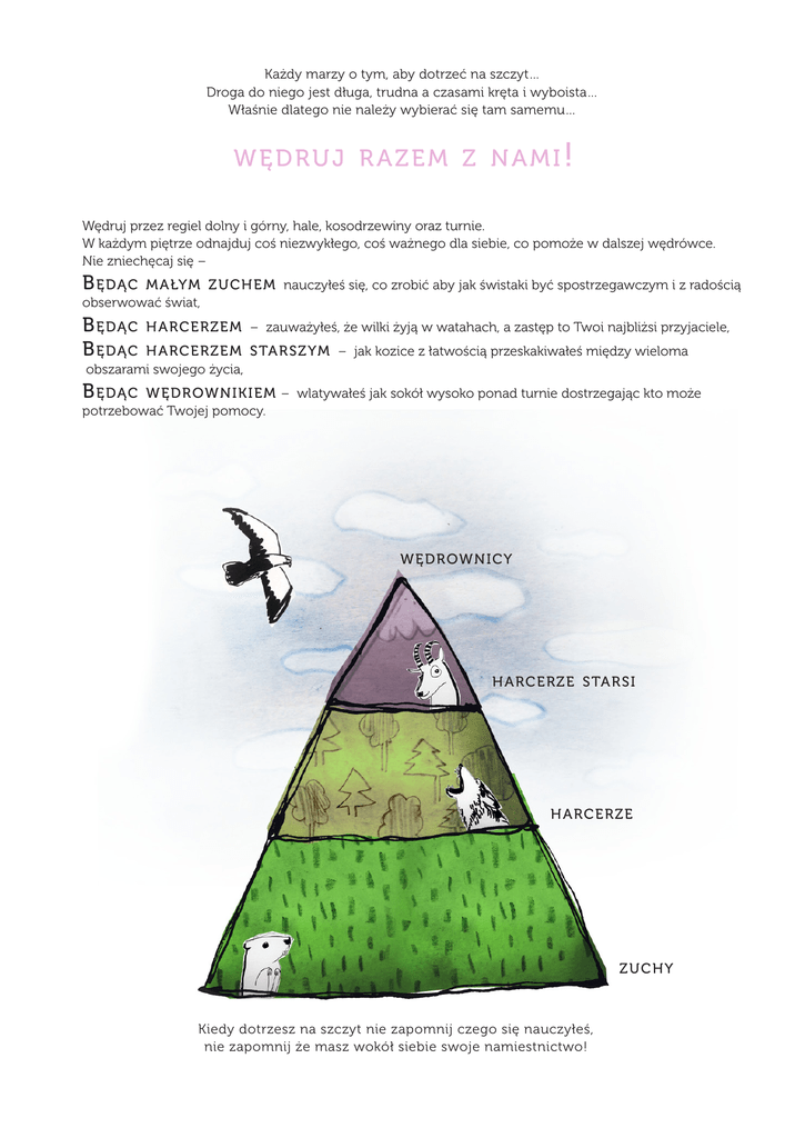 Każdy marzy o tym, aby dotrzeć na szczyt… Droga do niego jest długa, trudna a czasami kręta i wyboista… Właśnie dlatego nie należy wybierać się tam samemu… wędruj razem z nami! Wędruj przez regiel dolny i górny, hale, kosodrzewiny oraz turnie. W każdym piętrze odnajduj coś niezwykłego, coś ważnego dla siebie, co pomoże w dalszej wędrówce. Nie zniechęcaj się – B ędąc małym z u c h e m nauczyłeś się, co zrobić aby jak świstaki być spostrzegawczym i z radością obserwować świat, B ędąc B ędąc harc e r z e m – zauważyłeś, że wilki żyją w watahach, a zastęp to Twoi najbliżsi przyjaciele, B ędąc węd rown i k i e m – wlatywałeś jak sokół wysoko ponad turnie dostrzegając kto może harc e r z e m s ta r s z ym – jak kozice z łatwością przeskakiwałeś między wieloma obszarami swojego życia, potrzebować Twojej pomocy. w ę d rown i cy h a rc e r z e s ta r s i h a rc e r z e zuchy Kiedy dotrzesz na szczyt nie zapomnij czego się nauczyłeś, nie zapomnij że masz wokół siebie swoje namiestnictwo! Program n a m i e s t n i ko w s k i 2013/214 D rodzy drużynowi ! Specjalnie dla Was w tym roku zespół namiestników przygotował wiele ciekawych zajęć oraz zbiórek wspierających Waszą pracę metodyczną oraz dających pole do wymiany doświadczeń. Jak działa program: 1.Każde namiestnictwo będzie w tym roku pracowało pod patronatem jednego z przedstawionych, charakterystycznych dla danego pionu zwierząt. 2.Odbędą się 3 zbiórki wspólne dla wszystkich: - zbiórka rozpoczynająca rok harcerski 2013/14 - spotkanie Wigilijne - zbiórka kończąca rok harcerski 2013/14 z rozdaniem lilijek 3. Odbędą się co najmniej 3 zbiórki oddzielne dla każdego namiestnictwa, których terminy ustalicie wspólnie. 4. Odbędą się zajęcia namiestnictw podczas zlotów hufcowych.