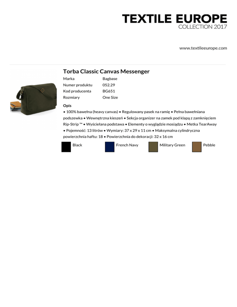 Torba Classic Canvas Messenger Marka Bagbase Numer produktu 052.29 Kod producenta BG651 Rozmiary One Size Opis • 100% bawełna (heavy canvas) • Regulowany pasek na ramię • Pełna bawełniana podszewka • Wewnętrzna kieszeń • Sekcja organizer na zamek pod klapą z zamknięciem Rip-Strip ™ • Wyściełana podstawa • Elementy o wyglądzie mosiądzu • Metka TearAway • Pojemność: 13 litrów • Wymiary: 37 x 29 x 11 cm • Maksymalna cylindryczna powierzchnia haftu: 18 • Powierzchnia do dekoracji: 32 x 16 cm Black French Navy Military Green Pebble