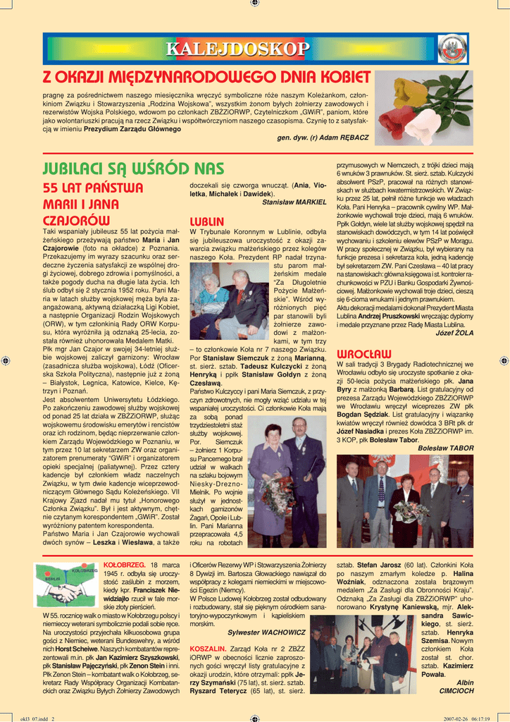Z OKAZJI MIĘDZYNARODOWEGO DNIA KOBIET pragnę za pośrednictwem naszego miesięcznika wręczyć symboliczne róże naszym Koleżankom, członkiniom Związku i Stowarzyszenia „Rodzina Wojskowa”, wszystkim żonom byłych żołnierzy zawodowych i rezerwistów Wojska Polskiego, wdowom po członkach ZBŻZiORWP, Czytelniczkom „GWiR”, paniom, które jako wolontariuszki pracują na rzecz Związku i współtwórczyniom naszego czasopisma. Czynię to z satysfakcją w imieniu Prezydium Zarządu Głównego gen. dyw. (r) Adam RĘBACZ JUBILACI SĄ WŚRÓD NAS 55 LAT PAŃSTWA MARII I JANA CZAJORÓW doczekali się czworga wnucząt. (Ania, Violetka, Michałek i Dawidek). Stanisław MARKIEL Taki wspaniały jubileusz 55 lat pożycia małżeńskiego przeżywają państwo Maria i Jan Czajorowie (foto na okładce) z Poznania. Przekazujemy im wyrazy szacunku oraz serdeczne życzenia satysfakcji ze wspólnej drogi życiowej, dobrego zdrowia i pomyślności, a także pogody ducha na długie lata życia. Ich ślub odbył się 2 stycznia 1952 roku. Pani Maria w latach służby wojskowej męża była zaangażowaną, aktywną działaczką Ligi Kobiet, a następnie Organizacji Rodzin Wojskowych (ORW), w tym członkinią Rady ORW Korpusu, która wyróżniła ją odznaką 25-lecia, została również uhonorowała Medalem Matki. Płk mgr Jan Czajor w swojej 34-letniej służbie wojskowej zaliczył garnizony: Wrocław (zasadnicza służba wojskowa), Łódź (Oficerska Szkoła Polityczna), następnie już z żoną – Białystok, Legnica, Katowice, Kielce, Kętrzyn i Poznań. Jest absolwentem Uniwersytetu Łódzkiego. Po zakończeniu zawodowej służby wojskowej od ponad 25 lat działa w ZBŻZiORWP, służąc wojskowemu środowisku emerytów i rencistów oraz ich rodzinom, będąc nieprzerwanie członkiem Zarządu Wojewódzkiego w Poznaniu, w tym przez 10 lat sekretarzem ZW oraz organizatorem prenumeraty “GWiR” i organizatorem opieki specjalnej (paliatywnej). Przez cztery kadencje był członkiem władz naczelnych Związku, w tym dwie kadencje wiceprzewodniczącym Głównego Sądu Koleżeńskiego. VII Krajowy Zjazd nadał mu tytuł „Honorowego Członka Związku”. Był i jest aktywnym, chętnie czytanym korespondentem „GWiR”. Został wyróżniony patentem korespondenta. Państwo Maria i Jan Czajorowie wychowali dwóch synów – Leszka i Wiesława, a także W Trybunale Koronnym w Lublinie, odbyła się jubileuszowa uroczystość z okazji zawarcia związku małżeńskiego przez kolegów naszego Koła. Prezydent RP nadał trzynastu parom małżeńskim medale “Za Długoletnie Pożycie Małżeńskie”. Wśród wyróżnionych pięć par stanowili byli żołnierze zawodowi z małżonkami, w tym trzy – to członkowie Koła nr 7 naszego Związku. Por Stanisław Siemczuk z żoną Marianną, st. sierż. sztab. Tadeusz Kulczycki z żoną Henryką i ppłk Stanisław Gołdyn z żoną Czesławą. Państwo Kulczyccy i pani Maria Siemczuk, z przyczyn zdrowotnych, nie mogły wziąć udziału w tej wspaniałej uroczystości. Ci członkowie Koła mają za sobą ponad trzydziestoletni staż służby wojskowej. Por. Siemczuk – żołnierz 1 Korpusu Pancernego brał udział w walkach na szlaku bojowym Niesky-DreznoMielnik. Po wojnie służył w jednostkach garnizonów Żagań, Opole i Lublin. Pani Marianna przepracowała 4,5 roku na robotach KOŁOBRZEG. 18 marca 1945 r. odbyła się uroczystość zaślubin z morzem, kiedy kpr. Franciszek Niewidziajło rzucił w fale morskie złoty pierścień. W 55. rocznicę walk o miasto w Kołobrzegu polscy i niemieccy weterani symbolicznie podali sobie ręce. Na uroczystości przyjechała kilkuosobowa grupa gości z Niemiec, weterani Bundeswehry, a wśród nich Horst Scheiwe. Naszych kombatantów reprezentowali m.in. płk Jan Kazimierz Szyszkowski, płk Stanisław Pajęczyński, płk Zenon Stein i inni. Płk Zenon Stein – kombatant walk o Kołobrzeg, sekretarz Rady Współpracy Organizacji Kombatanckich oraz Związku Byłych Żołnierzy Zawodowych i Oficerów Rezerwy WP i Stowarzyszenia Żołnierzy 8 Dywizji im. Bartosza Głowackiego nawiązał do współpracy z kolegami niemieckimi w miejscowości Egezin (Niemcy). W Polsce Ludowej Kołobrzeg został odbudowany i rozbudowany, stał się pięknym ośrodkiem sanatoryjno-wypoczynkowym i kąpieliskiem morskim. Sylwester WACHOWICZ okl3_07.indd okl3 07.indd 2 LUBLIN KOSZALIN. Zarząd Koła nr 2 ZBŻZ iORWP w obecności licznie zaproszonych gości wręczył listy gratulacyjne z okazji urodzin, które otrzymali: ppłk Jerzy Szymański (75 lat), st. sierż. sztab. Ryszard Teterycz (65 lat), st. sierż. przymusowych w Niemczech, z trójki dzieci mają 6 wnuków 3 prawnuków. St. sierż. sztab. Kulczycki absolwent PSzP, pracował na różnych stanowiskach w służbach kwatermistrzowskich. W Związku przez 25 lat, pełnił różne funkcje we władzach Koła. Pani Henryka – pracownik cywilny WP. Małżonkowie wychowali troje dzieci, mają 6 wnuków. Ppłk Gołdyn, wiele lat służby wojskowej spędził na stanowiskach dowódczych, w tym 14 lat poświęcił wychowaniu i szkoleniu elewów PSzP w Morągu. W pracy społecznej w Związku, był wybierany na funkcje prezesa i sekretarza koła, jedną kadencję był sekretarzem ZW. Pani Czesława – 40 lat pracy na stanowiskach: główna księgowa i st. kontroler rachunkowości w PZU i Banku Gospodarki Żywnościowej. Małżonkowie wychowali troje dzieci, cieszą się 6-cioma wnukami i jednym prawnukiem. Aktu dekoracji medalami dokonał Prezydent Miasta Lublina Andrzej Pruszkowski wręczając dyplomy i medale przyznane przez Radę Miasta Lublina. Józef ŻOLA WROCŁAW W sali tradycji 3 Brygady Radiotechnicznej we Wrocławiu odbyło się uroczyste spotkanie z okazji 50-lecia pożycia małżeńskiego płk. Jana Byry z małżonką Barbarą. List gratulacyjny od prezesa Zarządu Wojewódzkiego ZBŻZiORWP we Wrocławiu wręczył wiceprezes ZW płk Bogdan Sędziak. List gratulacyjny i wiązankę kwiat