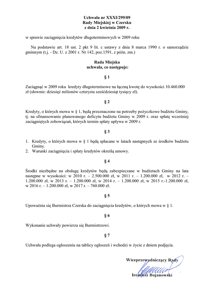 Uchwała nr XXXI/299/09 Rady Miejskiej w Czersku z dnia 2 kwietnia 2009 r. w sprawie zaciągnięcia kredytów długoterminowych w 2009 roku Na podstawie art. 18 ust. 2 pkt 9 lit. c ustawy z dnia 8 marca 1990 r. o samorządzie gminnym (t.j. - Dz. U. z 2001 r. Nr 142, poz.1591, z późn. zm.) Rada Miejska uchwala, co następuje: §1 Zaciągnąć w 2009 roku kredyty długoterminowe na łączną kwotę do wysokości 10.460.000 zł (słownie: dziesięć milionów czterysta sześćdziesiąt tysięcy zł). §2 Kredyty, o których mowa w § 1, będą przeznaczone na potrzeby poŜyczkowe budŜetu Gminy, tj. na sfinansowanie planowanego deficytu budŜetu Gminy w 2009 r. oraz spłatę wcześniej zaciągniętych zobowiązań, których termin spłaty upływa w 2009 r. §3 1. Kredyty, o których mowa w § 1 będą spłacane w latach następnych ze środków budŜetu Gminy. 2. Warunki zaciągnięcia i spłaty kredytów określą umowy. §4 Środki niezbędne na obsługę kredytów będą zabezpieczane w budŜetach Gminy na lata następne w wysokości: w 2010 r. – 2.500.000 zł, w 2011 r. – 1.200.000 zł, w 2012 r. – 1.200.000 zł, w 2013 r. – 1.200.000 zł, w 2014 r. – 1.200.000 zł, w 2015 r.-1.200.000 zł, w 2016 r. – 1.200.000 zł, w 2017 r. – 760.000 zł. §5 UpowaŜnia się Burmistrza Czerska do zaciągnięcia kredytów, o których mowa w § 1. §6 Wykonanie uchwały powierza się Burmistrzowi. §7 Uchwała podlega ogłoszeniu na tablicy ogłoszeń i wchodzi w Ŝycie z dniem podjęcia. Uzasadnienie: W uchwale Nr XXVIII/250/08 Rady Miejskiej w Czersku z dnia 18 grudnia 2008 r. w sprawie budŜetu gminy Czersk na 2009 rok (z późniejszymi zmianami) w § 11 ustalono roczne limity na sfinansowanie potrzeb poŜyczkowych budŜetu Gminy, w tym na nowe kredyty przeznaczone na sfinansowanie planowanego deficytu budŜetu oraz na zobowiązania z tytułu spłaty wcześniej zaciągniętych zobowiązań, na łączną kwotę 10.460.000 zł. Pozyskanie tej kwoty planowane jest poprzez zaciągnięcie kredytów długoterminowych w bankach wybranych zgodnie z ustawą - prawo zamówień publicznych. Na sfinansowanie planowanego deficytu przewidziano zaciągniecie kredytów do wysokości 5.948.599 zł (240.000 zł deficytu finansuje poŜyczka z WFOŚiGW). Pozostała wielkość zaciąganych kredytów, tj. 4.511.401 zł, zostanie przeznaczona na spłatę wcześniej zaciągniętych zobowiązań poŜyczkowo-kredytowych.