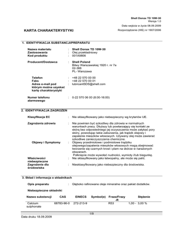 Shell Donax TD 10W-30 Wersja 1.0 Data wejścia w życie 08.09.2009 Rozporządzenie (WE) nr 1907/2006 KARTA CHARAKTERYSTYKI 1. IDENTYFIKACJA SUBSTANCJI/PREPARATU Nazwa materiału Zastosowania Kod produktu : : : Shell Donax TD 10W-30 Olej przekładniowy 001A9806 Producent/Dostawca : Shell Poland Bitwy Warszawskiej 1920 r. nr 7a 02-366 PL- Warszawa : : : +48 22 570 00 00 +48 22 570 00 01 [email protected] : 0-22 570 06 00 (8:00-16:00) Klasyfikacja EC : Nie sklasyfikowany jako niebezpieczny wg kryteriów UE. Zagrożenia zdrowia : : Nie powinien być szkodliwy dla zdrowia w normalnych warunkach pracy. Dłuższy lub powtarzający się kontakt ze skórą bez odpowiedniego jej oczyszczenia może zatykać pory skóry, powodując takie zaburzenia, jak trądzik olejowy i zapalenie mieszków włosowych. Używany olej może zawierać szkodliwe zanieczyszczenia chemiczne. Objawy przedmiotowe i podmiotowe trądziku olejowego/zapalenia mieszków włosowych mogą obejmować tworzenie się czarnych krost i plam na skórze w narażonych obszarach. Połknięcie może wywołać nudności, wymioty i/lub biegunkę. Nie sklasyfikowany jako łatwopalny, ale może się palić. : Niesklasyfikowany jako niebezpieczny dla środowiska. Telefon Faks Adres e-mail pod którym można uzyskać kartę charakterystyki Numer telefonu alarmowego 2. IDENTYFIKACJA ZAGROŻEŃ Objawy i Symptomy Właściwości niebezpieczne Zagrożenie dla środowiska : 3. Skład i informacja o składnikach : Opis preparatu Głęboko rafinowane oleje mineralne oraz pakiet dodatków. Niebezpieczne składniki Nazwa substancji Calcium sulphonate CAS EINECS 68783-96-0 272-213-9 Symbol(e) 1/9 Data druku 18.09.2009 Fraza/Frazy -R R53 Stężenie 1,00 - 3,00 % Shell Donax TD 10W-30 Wersja 1.0 Data wejścia w życie 08.09.2009 Rozporządzenie (WE) nr 1907/2006 KARTA CHARAKTERYSTYKI Dialkiloditiofosfora n cynku 68649-42-3 Dodatkowe informacje : 272-028-3 Xi R38; R52/53 1,00 - 3,00 % Głęboko rafinowany olej mineralny zawierający <3% w/w ekstraktu dimetylosulfotlenku (DMSO) zgodnie z normą IP346. (nota L). Patrz rozdział 16 zawierający pełne objaśnienia fraz EC R. 4. Pierwsza pomoc Informacje ogólne : Wdychanie : Kontakt ze skórą : Kontakt z oczami : Spożycie : Informacje dla lekarza : Nie powinien być szkodliwy dla zdrowia w normalnych warunkach pracy. Nie jest konieczne leczenie w przypadku zastosowania w normalnych warunkach. Jeśli objawy się utrzymują, uzyskać pomoc medyczną. Zdjąć skażoną odzież. Miejsca wystawione na działanie substancji spłukać wodą, a następnie umyć mydłem, jeśli jest dostępne. Jeżeli podrażnienie nie ustąpi należy skonsultować się z lekarzem. Przepłukać oczy dużą ilością wody. Jeżeli podrażnienie nie ustąpi należy skonsultować się z lekarzem. Na ogół nie jest wymagane żadne leczenie, chyba że połknięto duże ilości, tym niemniej należy zasięgnąć porady lekarza. Leczyć objawowo. 5. Postępowanie w przypadku pożaru Usunąć z miejsca pożaru cały personel nie biorący bezpośrednio udziału w akcji gaśniczej. Szczególne zagrożenia : Odpowiednie Środki Gaśnicze : Nieodpowiednie Środki Gaśnicze Sprzęt ochronny dla strażaków : : Niebezpieczne produkty spalania mogą zawierać: Złożoną mieszaninę cząstek stałych zwieszonych w powietrzu i cząstek ciekłych oraz gazów (dym). Tlenek węgla. Niezidentyfikowane składniki organiczne i nieorganiczne. Piana, strumień wody lub mgła. Suchy proszek gaśniczy, dwutlenek węgla, piasek lub ziemia mogą być użyte tylko do małych pożarów. Nie stosować silnego strumienia wody. Podczas zbliżania się do ognia w zamkniętej przestrzeni należy nosić odpowiedni sprzęt ochronny zawierający aparat oddechowy. 6. Postępowanie w przypadku niezamierzonego uwolnienia do środowiska Unikać kontaktu z rozlanym lub uwolnionym materiałem. Wytyczne dotyczące doboru osobistego sprzętu ochronnego znajdują się w rozdziale 8 karty charakterystyki substancji niebezpiecznej. Informacje na temat usuwania produktu znajdują się w części 13 karty charakterystyki. Stosować się do lokalnych i międzynarodowych przepisów. Środki ochrony : Unikać zanieczyszczenia skóry i oczu. Zastosować odpowiednie zabezpieczenia w celu zapobieżenia skażeniu środowiska. Zapobiec rozlewowi lub przedostaniu się do ścieków, rowów lub rzek stosując piasek, ziemię lub inne 2/9 Data druku 18.09.2009 Shell Donax TD 10W-30 Wersja 1.0 Data wejścia w życie 08.09.2009 Rozporządzenie (WE) nr 1907/2006 KARTA CHARAKTERYSTYKI Metody czyszczenia : Dodatkowe porady : odpowiednie bariery. Ryzyko poślizgnięcia w przypadku rozlania. Aby uniknąć wypadków, należy bezzwłocznie uprzątnąć. Zapobiec rozprzestrzenianiu stosując bariery z piasku, ziemi lub innych odpowiednich materiałów. Produkt należy zebrać bezpośrednio lub za pomocą substancji adsorbującej. Zebrać pozostałości za pomocą środka absorbującego, takiego jak glina, piasek lub inny odpowiedni materiał, i utylizować w bezpieczny sposób. Jeżeli nie można powstrzymać dużego rozlewu należy poinformować lokalne władze. 7. Postępowanie z substancją/preparatem i jej/jego magazynowanie Ogólne środki ostrożności : Sposób obchodzenia się z materiałem : Przechowywanie : Zalecane materiały : Nieodpowiednie materiały Dodatkowe informacje : : Użyć wentylacji wyciągowej znajdującej się na miejscu, jeśli istnieje zagrożenie wdychania oparów, par lub aerozoli. Należy we właściwy sposób pozbyć się wszystkich zabrudzonych szmat lub materiałów czyszczących, aby nie dopuścić do pożaru. Informacji przedstawionych w niniejszej karcie charakterystyki należy użyć jako danych wyjściowych dla oceny ryzyka lokalnych warunków, aby ustalić odpowiednie metody kontroli w zakresie bezpiecznego obchodzenia się, przechowywania i usuwania tego materiału. Unikać dłuższego lub wielokrotnego kontaktu ze skórą. Unikać wdychania oparów i/lub mgły. Pod