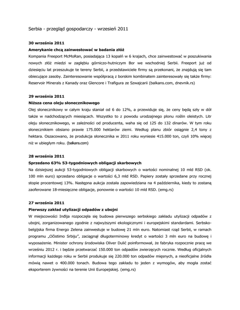 Serbia - przegląd gospodarczy - wrzesień 2011 30 września 2011 Amerykanie chcą zainwestować w badania złóż Kompania Freeport McMoRan, posiadająca 13 kopalń w 6 krajach, chce zainwestować w poszukiwania nowych złóż miedzi w zagłębiu górniczo-hutniczym Bor we wschodniej Serbii. Freeport już od dziesięciu lat przeszukuje te tereny Serbii, a przedstawiciele firmy są przekonani, że znajdują się tam obiecujące zasoby. Zainteresowanie współpracą z borskim kombinatem zainteresowały się także firmy: Reservoir Minerals z Kanady oraz Glencore i Trafigura ze Szwajcarii (balkans.com, dnevnik.rs) 29 września 2011 Niższa cena oleju słonecznikowego Olej słonecznikowy w całym kraju staniał od 6 do 12%, a przewiduje się, że ceny będą szły w dół także w nadchodzących miesiącach. Wszystko to z powodu urodzajnego plonu roślin oleistych. Litr oleju słonecznikowego, w zależności od producenta, waha się od 125 do 132 dinarów. W tym roku słonecznikiem obsiano prawie 175.000 hektarów ziemi. Według planu zbiór osiągnie 2,4 tony z hektara. Oszacowano, że produkcja słonecznika w 2011 roku wyniesie 415.000 ton, czyli 10% więcej niż w ubiegłym roku. (balkans.com) 28 września 2011 Sprzedano 63% 53-tygodniowych obligacji skarbowych Na dzisiejszej aukcji 53-tygodniowych obligacji skarbowych o wartości nominalnej 10 mld RSD (ok. 100 mln euro) sprzedano obligacje o wartości 6,3 mld RSD. Papiery zostały sprzedane przy rocznej stopie procentowej 13%. Następna aukcja została zapowiedziana na 4 października, kiedy to zostaną zaoferowane 18-miesięczne obligacje, ponownie o wartości 10 mld RSD. (emg.rs) 27 września 2011 Pierwszy zakład utylizacji odpadów z ubojni W miejscowości Inñija rozpoczęła się budowa pierwszego serbskiego zakładu utylizacji odpadów z ubojni, zorganizowanego zgodnie z najwyższymi ekologicznymi i europejskimi standardami. Serbskobelgijska firma Energo Zelena zainwestuje w budowę 21 mln euro. Natomiast rząd Serbii, w ramach programu „Očistimo Srbiju”, zaciągnął długoterminowy kredyt o wartości 3 mln euro na budowę i wyposażenie. Minister ochrony środowiska Oliver Dulić poinformował, że fabryka rozpocznie pracę we wrześniu 2012 r. i będzie przetwarzać 150.000 ton odpadów zwierzęcych rocznie. Według oficjalnych informacji każdego roku w Serbii produkuje się 220.000 ton odpadów mięsnych, a nieoficjalne źródła mówią nawet o 400.000 tonach. Budowa tego zakładu to jeden z wymogów, aby mogła zostać eksporterem żywności na terenie Unii Europejskiej. (emg.rs) 26 września 2011 Autobusem z Belgradu do Linz Serbskie przedsiębiorstwo transportowe Lasta wkrótce przewiezie pierwszych pasażerów na nowej linii Belgrad-Ptuj-Maribor-Graz-Linz. Autobusy do Linz będą odjeżdżać z dworca w stolicy w każdą środę i niedzielę o g. 21.00, a w stronę powrotną w piątki i wtorki o 15.30. – Po raz kolejny wyszliśmy naprzeciw życzeniom naszych klientów. Tym razem wprowadzając kurs łączący Serbię, Słowenię i Austrię – powiedziała Ana Petrović z firmy Lasta. Bilet w obie strony należy wykorzystać w okresie trzech miesięcy od momentu zakupu, a jego cena wynosi 96 euro. Uprawnieni do zniżki są emeryci (10%) i dzieci do lat dziesięciu (50%). Połączenie zostało zorganizowane we współpracy z przedsiębiorstwami Veolia Požarevac, Veolia Štajerska, Veolia Maribor i Blaguss Austria. Pasażerowie wszystkich międzynarodowych kursów przewoźnika Lasta w dniu podróży mogą skorzystać z darmowego transferu na terytorium Serbii. W tym celu konieczne jest okazanie ważnego biletu na przejazd międzynarodowy. Bilety można nabyć w Belgradzie, Nowym Sadzie, Kragujewacu i Niszu, w kasach i agencjach turystycznych Lasta. Zakup biletów będzie możliwy także na dworcach w Ptuju i Mariborze, Graz (Hauptbahnhof), Wels (Elsenfeldstrasse) i Lizn (Industriezell). W Serbii rezerwacji dokonuje się pod numerem telefonu 0900 334 334. (balkans.com) Najdroższy ser na świecie W Serbii produkuje się najdroższy ser na świecie. Mowa o serze z oślego mleka (tzw. „magareći sir”), wytwarzanym w rezerwacie Zasavica. Do wyprodukowania jednego kilograma potrzeba aż 25 litrów oślego mleka, którego litr kosztuje 40 euro. Stąd niebagatelna cena sera - 1000 euro za kilogram. Od momentu prezentacji specjału na Targach turystycznych w 2010 roku zamówiono jedynie 0,5 kg, co jest dowodem na to, że na zakup mogą pozwolić sobie tylko najbogatsi smakosze. (balkans.com) 25 września 2011 Śliw i śliwek coraz mniej Uprawa śliwki w Serbii ma wielowiekową tradycję. Owoc ten przez dziesięciolecia był swego rodzaju serbskim znakiem towarowym. Mimo to jego rodzima produkcja odnotowuje spadek, a liczba śliw zmniejsza się z roku na rok. Aktualnie ich liczba wynosi 43 mln. Jak podkreśla Vojislav Stanković z Izby Gospodarczej Republiki Serbii, to 17 mln mniej, niż kilkadziesiąt lat temu. Rocznie produkcja śliwek wynosi od 450.000 do 600.000 ton. Dwa lata temu zebrano 620.000 ton, rok temu 424.000, natomiast w tym roku szacuje się, że zbiory nie przekroczą 550.000 ton. Około 65% zebranych owoców zostanie wykorzystanych przy produkcji alkoholu. Największym importerem serbskiej śliwki jest Rosja, która w ubiegłym roku kupiła 1.686 ton o wartości 4,3 mln dolarów (ogólna ilość przeznaczona na eksport wyniosła 4.138 ton, a jej wartość 8,8 mln dolarów). Liczba śliw w Serbii zaczęła zmniejszać się po 1938 roku, po przybyciu z Bułgarii choroby, która zdziesiątkowała drzewka „węgierki” – najbardziej rozpowszechnionej wówczas odmiany, znanej pod nazwą „požegača”. (tanjug.rs) 24 września 2011 Emerytury i pensje w 2012 r. wyższe o około 5% Ministerstwo Finansów Republiki Serbii oceniło, że wypłaty i emerytury z budżetu wynagrodzeń w 2012 roku zwiększą się o 4%, a w październiku 2011 b.r. już o 0,8%. Wypłaty są zależne od wzrostu inflacji, która ja