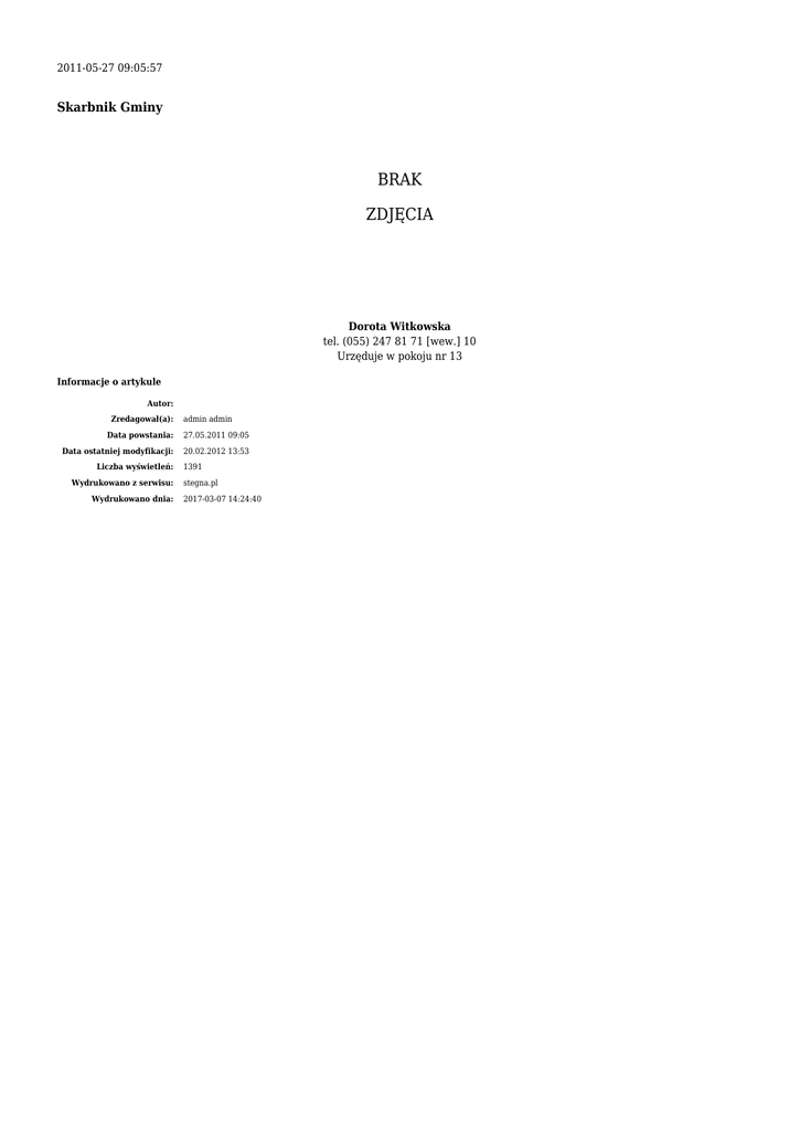 2011-05-27 09:05:57 Skarbnik Gminy BRAK ZDJĘCIA Dorota Witkowska tel. (055) 247 81 71 [wew.] 10 Urzęduje w pokoju nr 13 Informacje o artykule Autor: Zredagował(a): admin admin Data powstania: 27.05.2011 09:05 Data ostatniej modyfikacji: 20.02.2012 13:53 Liczba wyświetleń: Wydrukowano z serwisu: Wydrukowano dnia: 1391 stegna.pl 2017-03-07 14:24:40