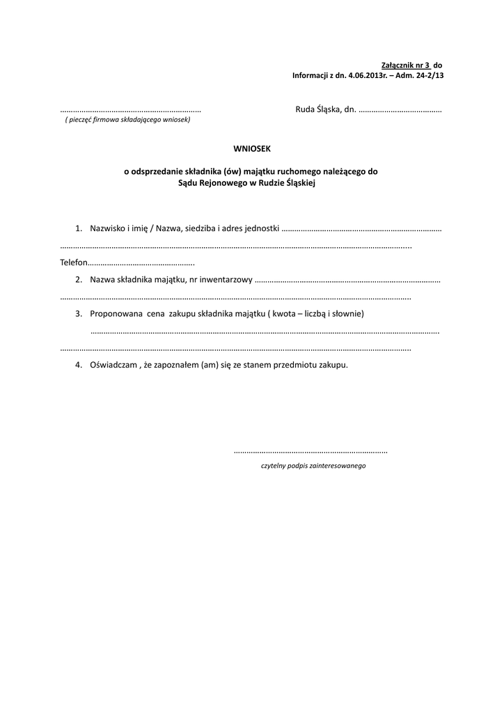 Załącznik nr 3 do Informacji z dn. 4.06.2013r. – Adm. 24-2/13 ………………………………………………………… Ruda Śląska, dn. ………………………………… ( pieczęć firmowa składającego wniosek) WNIOSEK o odsprzedanie składnika (ów) majątku ruchomego należącego do Sądu Rejonowego w Rudzie Śląskiej 1. Nazwisko i imię / Nazwa, siedziba i adres jednostki ………………………………………………………………… ……………………………………………………………………………………………………………………………………………..... Telefon………………………………………….. 2. Nazwa składnika majątku, nr inwentarzowy …………………………………………………………………………… ……………………………………………………………………………………………………………………………………………….. 3. Proponowana cena zakupu składnika majątku ( kwota – liczbą i słownie) ………………………………………………………………………………………………………………………………………………. ……………………………………………………………………………………………………………………………………………….. 4. Oświadczam , że zapoznałem (am) się ze stanem przedmiotu zakupu. ……………………………………………………………… czytelny podpis zainteresowanego