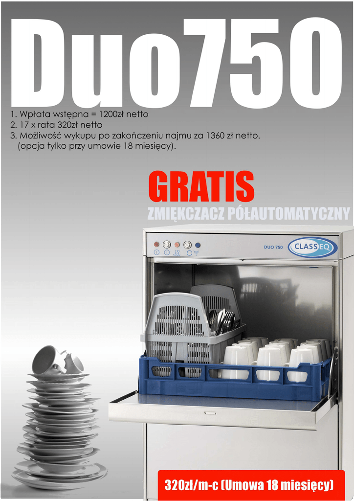 REGULAMIN DŁUGOTERMINOWEGO WYNAJMU ZMYWARKI CLASSEQ DUO 750 Program wynajmu maszyn obowiązuje od dnia 01.06.2011 do odwołania. Umowa na wynajem zostaje podpisana pomiędzy wynajmującym -firmą Classeq Polska sp. z o.o., a najemcą – firmą będącą użytkownikiem zmywarki. Koszt 18 miesięcznego wynajmu zmywarki podblatowej Classeq Duo 750 wraz z półautomatyczną stacją uzdatniania wody wynosi: ⇒ Wpłata wstępna przy podpisaniu umowy 1.200,- zł netto stanowiąca jednomiesięczny czynsz wraz z kosztami instalacji. ⇒ Czynsz za wynajem urządzenia w kwocie 320,- zł netto miesięcznie. ⇒ Istnieje możliwość odkupienia urządzenia po zakończeniu umowy wynajmu. PODBLATOWA ZMYWARKA DO NACZYŃ CLASSEQ DUO 750 Szerokość ................................................ 570 mm PRZYŁĄCZE Głębokość ............................................... 630 mm Przyłącze wodne - BSP .....................................3/4" Głębokość - Drzwi otwarte ......................... 990 mm Wymagane ciśnienie wody ............................. 2 bary Wysokość ................................................ 835 mm Typ odpływu .............................................. Pompa Wielkość kosza ............................. 500 mm (kwadrat) Średnica odpływu ........................................ 22 mm Maksymalna wysokość komory mycia ............ 345mm Max wysokość odpływu od podłoża ............... 650mm Waga - Netto/Brutto ................................ 65/70 kg Max/Min ciśnienie wody ......................... 6 / 0,5 Bar Wbudowana pompa płucząca .................. STANDARD Minimalny przepływ wody ......................... 2,5 l/min WODNE: Wbudowany dozownik detergentów .................... Tak Wbudowany dozownik środka nabłyszczającego ... Tak Dwuwarstwowe drzwi ....................................... Tak Dwuwarstwowa obudowa .................................. Tak Maksymalna wydajność koszy na godzinę PRZYŁĄCZE - Woda o temperaturze 50°C .............................. 20 220/50/1 ...................................................... Opcja Czas trwania cyklu ........................................ 3 min 400/50/3 ........................................................Tak Wydajność pompy myjącej ....................... 380 l/min 1 fazowe - Woda o temperaturze 10°C .............. 30 A Pojemność zbiornika myjącego .......................... 18 l 1 fazowe - Woda o temperaturze 40°C .............. 16 A Temperatura pracy zbiornika myjącego.............. 55°C 3 fazowe - Woda o temperaturze 10°C .............. 16 A Pojemność bojlera ............................................ 7 l Całkowita moc przyłączeniowa - Temperatura pracy bojlera .............................. 85°C Woda o temperaturze 40°C ........................ 6.75 kW Pobór wody do płukania - 2 Bary .................... 2.75 l Woda o temperaturze 10°C ........................ 6.75 kW Blokada temperatury ....................................... Tak Moc grzałek komory myjącej ......................... 2.0 kW .................................................. (może być usunięta) Moc grzałek bojlera ..................................... 6.0 kW Tryb szybkiego startu ....................................... Tak Moc pompy myjącej .................................. 0.74 kW ELEKTRYCZNE: CLASSEQ POLSKA Sp. z o.o. Al.. Stanów Zjednoczonych 51 / 509 04-028 Warszawa Tel. 22 8130325 NIP 822-220-80-18 Fax. 22 4335360 KRS 0000262677