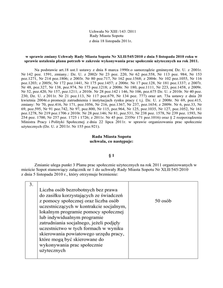 Uchwała Nr XIII /143 /2011 Rady Miasta Sopotu z dnia 18 listopada 2011r. w sprawie zmiany Uchwały Rady Miasta Sopotu Nr XLII/545/2010 z dnia 5 listopada 2010 roku w sprawie ustalenia planu potrzeb w zakresie wykonywania prac społecznie uŜytecznych na rok 2011. Na podstawie art.18 ust.1 ustawy z dnia 8 marca 1990r.o samorządzie gminnym( Dz. U. z 2001r. Nr 142 poz. 1591, zmiany.: Dz. U. z 2002r Nr 23 poz. 220, Nr 62 poz.558, Nr 113 poz. 984, Nr 153 poz.1271, Nr 214 poz.1806; z 2003r. Nr 80 poz.717, Nr 162 poz.1568; z 2004r. Nr 102 poz.1055, Nr 116 poz.1203; z 2005r, Nr 172 poz.1441, Nr 175 poz.1457; z 2006r. Nr 17 poz.128, Nr 181 poz.1337; z 2007r. Nr 48, poz.327, Nr 138, poz.974, Nr 173 poz.1218; z 2008r. Nr 180, poz.1111, Nr 223, poz.1458, z 2009r. Nr 52, poz.420, Nr 157, poz.1211; z 2010r. Nr 28 poz.142 i 146, Nr 106, poz.675 Dz. U. z 2010r. Nr 40 poz. 230, Dz. U. z 2011r. Nr 21 poz.113, Nr 117 poz.679, Nr 134 poz. 777) oraz art. 73a ustawy z dnia 20 kwietnia 2004r.o promocji zatrudnienia i instytucjach rynku pracy ( t.j. Dz. U. z 2008r. Nr 69, poz.415, zmiany: Nr 70, poz.416, Nr 171, poz.1056, Nr 216, poz.1367, Nr 237, poz.1654; z 2009r. Nr 6, poz.33, Nr 69, poz.595, Nr 91 poz.742, Nr 97, poz.800, Nr 115, poz.964, Nr 125, poz.1035, Nr 127, poz.1052, Nr 161 poz.1278, Nr 219 poz.1706 z 2010r. Nr 28 poz.146; Nr 81, poz.531, Nr 238 poz. 1578, Nr 239 poz. 1593, Nr 254 poz. 1700, Nr 257 poz. 1725 i 1726; z 2011r. Nr 45 poz. 235Nr 171 poz.1016) oraz § 2 rozporządzenia Ministra Pracy i Polityki Społecznej z dnia 22 lipca 2011r. w sprawie organizowania prac społecznie uŜytecznych (Dz. U. z 2011r. Nr 155 poz.921). Rada Miasta Sopotu uchwala, co następuje: §1 Zmianie ulega punkt 3 Planu prac społecznie uŜytecznych na rok 2011 organizowanych w mieście Sopot stanowiący załącznik nr 1 do uchwały Rady Miasta Sopotu Nr XLII/545/2010 z dnia 5 listopada 2010 r., który otrzymuje brzmienie: 3. Liczba osób bezrobotnych bez prawa do zasiłku korzystających ze świadczeń z pomocy społecznej oraz liczba osób uczestniczących w kontrakcie socjalnym, lokalnym programie pomocy społecznej lub indywidualnym programie zatrudniania socjalnego, jeŜeli podjęły uczestnictwo w tych formach w wyniku skierowania powiatowego urzędu pracy, które mogą być skierowane do wykonywania prac społecznie uŜytecznych 50 osób §2 Realizację uchwały powierza się Prezydentowi Miasta Sopotu. §3 Uchwała wchodzi w Ŝycie z dniem podjęcia. UZASADNIENIE Zmiana uchwały Rady Miasta Sopotu Nr XLII/545/2010 z dnia 5 listopada 2010 roku w sprawie ustalenia planu potrzeb w zakresie wykonywania prac społecznie uŜytecznych na rok 2011 jest wynikiem nowelizacji ustawy z dn.20.04.2004 r. o promocji zatrudnienia i instytucjach rynku pracy (t.j. Dz. U. z 2008r. Nr 69 poz. 415 z póź. zm.) oraz wejścia w Ŝycie Rozporządzenie Ministra Pracy i Polityki Społecznej z dnia 22 lipca 2011 r. (Dz. U. z 2011r. Nr 155 poz.921) w sprawie organizowania prac społecznie uŜytecznych. Rozszerzony został katalog osób, które mogą być skierowane do wykonywania prac społecznie uŜytecznych o osoby uczestniczące w kontrakcie socjalnym, indywidualnym programie usamodzielniania, lokalnym programie pomocy społecznej lub indywidualnym programie zatrudnienia socjalnego, jeŜeli podjęły uczestnictwo w tych formach w wyniku skierowania powiatowego urzędu pracy na podstawie art. 50 ust. 2 w/w ustawy. . .