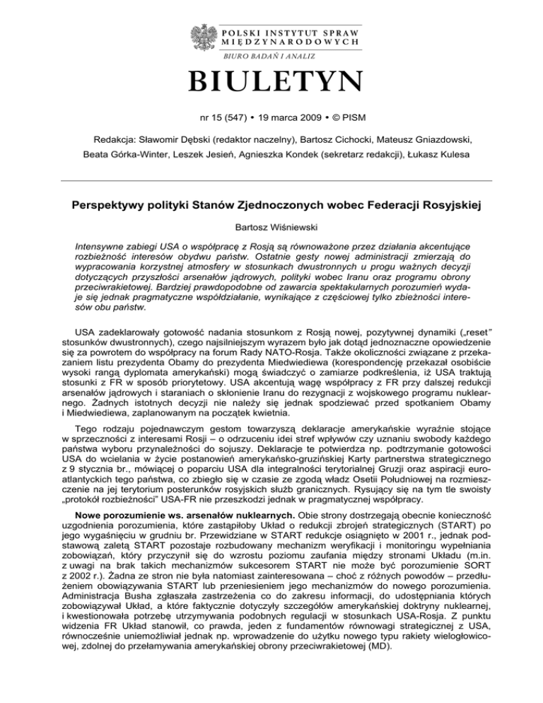 BIURO BADAŃ I ANALIZ BIULETYN nr 15 (547) • 19 marca 2009 • © PISM Redakcja: Sławomir Dębski (redaktor naczelny), Bartosz Cichocki, Mateusz Gniazdowski, Beata Górka-Winter, Leszek Jesień, Agnieszka Kondek (sekretarz redakcji), Łukasz Kulesa Perspektywy polityki Stanów Zjednoczonych wobec Federacji Rosyjskiej Bartosz Wiśniewski Intensywne zabiegi USA o współpracę z Rosją są równoważone przez działania akcentujące rozbieżność interesów obydwu państw. Ostatnie gesty nowej administracji zmierzają do wypracowania korzystnej atmosfery w stosunkach dwustronnych u progu ważnych decyzji dotyczących przyszłości arsenałów jądrowych, polityki wobec Iranu oraz programu obrony przeciwrakietowej. Bardziej prawdopodobne od zawarcia spektakularnych porozumień wydaje się jednak pragmatyczne współdziałanie, wynikające z częściowej tylko zbieżności interesów obu państw. USA zadeklarowały gotowość nadania stosunkom z Rosją nowej, pozytywnej dynamiki („reset” stosunków dwustronnych), czego najsilniejszym wyrazem było jak dotąd jednoznaczne opowiedzenie się za powrotem do współpracy na forum Rady NATO-Rosja. Także okoliczności związane z przekazaniem listu prezydenta Obamy do prezydenta Miedwiediewa (korespondencję przekazał osobiście wysoki rangą dyplomata amerykański) mogą świadczyć o zamiarze podkreślenia, iż USA traktują stosunki z FR w sposób priorytetowy. USA akcentują wagę współpracy z FR przy dalszej redukcji arsenałów jądrowych i staraniach o skłonienie Iranu do rezygnacji z wojskowego programu nuklearnego. Żadnych istotnych decyzji nie należy się jednak spodziewać przed spotkaniem Obamy i Miedwiediewa, zaplanowanym na początek kwietnia. Tego rodzaju pojednawczym gestom towarzyszą deklaracje amerykańskie wyraźnie stojące w sprzeczności z interesami Rosji – o odrzuceniu idei stref wpływów czy uznaniu swobody każdego państwa wyboru przynależności do sojuszy. Deklaracje te potwierdza np. podtrzymanie gotowości USA do wcielania w życie postanowień amerykańsko-gruzińskiej Karty partnerstwa strategicznego z 9 stycznia br., mówiącej o poparciu USA dla integralności terytorialnej Gruzji oraz aspiracji euroatlantyckich tego państwa, co zbiegło się w czasie ze zgodą władz Osetii Południowej na rozmieszczenie na jej terytorium posterunków rosyjskich służb granicznych. Rysujący się na tym tle swoisty „protokół rozbieżności” USA-FR nie przeszkodzi jednak w pragmatycznej współpracy. Nowe porozumienie ws. arsenałów nuklearnych. Obie strony dostrzegają obecnie konieczność uzgodnienia porozumienia, które zastąpiłoby Układ o redukcji zbrojeń strategicznych (START) po jego wygaśnięciu w grudniu br. Przewidziane w START redukcje osiągnięto w 2001 r., jednak podstawową zaletą START pozostaje rozbudowany mechanizm weryfikacji i monitoringu wypełniania zobowiązań, który przyczynił się do wzrostu poziomu zaufania między stronami Układu (m.in. z uwagi na brak takich mechanizmów sukcesorem START nie może być porozumienie SORT z 2002 r.). Żadna ze stron nie była natomiast zainteresowana – choć z różnych powodów – przedłużeniem obowiązywania START lub przeniesieniem jego mechanizmów do nowego porozumienia. Administracja Busha zgłaszała zastrzeżenia co do zakresu informacji, do udostępniania których zobowiązywał Układ, a które faktycznie dotyczyły szczegółów amerykańskiej doktryny nuklearnej, i kwestionowała potrzebę utrzymywania podobnych regulacji w stosunkach USA-Rosja. Z punktu widzenia FR Układ stanowił, co prawda, jeden z fundamentów równowagi strategicznej z USA, równocześnie uniemożliwiał jednak np. wprowadzenie do użytku nowego typu rakiety wielogłowicowej, zdolnej do przełamywania amerykańskiej obrony przeciwrakietowej (MD). 1994 Polski Instytut Spraw Międzynarodowych Administracja Obamy deklaruje gotowość odnowienia procedur monitoringu arsenałów nuklearnych i rozważenia dalszych ich redukcji, nie precyzując jednak zakresu, w jakim chciałaby wykorzystać unormowania START. FR widzi zaś w przyjęciu nowego porozumienia istotny krok zwiększający wiarygodność wspomnianego „resetu”, dodatkowo łącząc swoją zgodę w tej sprawie ze zmianą podejścia USA do sprawy MD. Obecnie najbardziej prawdopodobne wydaje się jednak rozwiązanie przejściowe, zapewniające funkcjonowanie najważniejszych mechanizmów START do czasu uzgodnienia nowego traktatu. USA dokonują właśnie przeglądu doktryny nuklearnej (Nuclear Posture Review), którego wyniki powinny kształtować decyzje co do wielkości arsenału, poza tym trudne byłoby zakończenie procedury ratyfikacyjnej w Senacie USA przed grudniem. Przyszłość europejskiego komponentu MD a wojskowy program jądrowy Iranu. Członkowie administracji Obamy podkreślają, że podstawowym uwarunkowaniem rozwoju systemu obrony przeciwrakietowej w Europie, obok potrzeby dowiedzenia skuteczności odpowiednich jego komponentów, pozostaje możliwość wejścia przez Iran w posiadanie broni jądrowej. Szereg czynników czyni prawdopodobnym opóźnienie budowy baz w Polsce i w Czechach1. Wątpliwe wydaje się jednak powiązanie ewentualnego udziału FR w wysiłkach na rzecz skłonienia Iranu do rezygnacji z planów nuklearnych z gotowością do porzucenia lub zawieszenia starań o budowę środkowoeuropejskich baz MD, co sugerowały doniesienia o treści wspomnianego listu Obamy do Miedwiediewa. Nie jest jasne, jaki rodzaj pomocy ze strony FR (wsparcie dodatkowych sankcji, zawieszenie cywilnej współpracy nuklearnej z Iranem) czy też ewentualny końcowy efekt (spowolnienie, wstrzymanie lub zaniechanie programu przez Iran) mogłyby stanowić wystarczającą przesłankę dla decyzji amerykańskiej w sprawie MD. Dla uzyskania przełomu w kwestii irańskiego programu jądrowego bardziej istotne od zapewnienia pomocy rosyjskiej mogłyby zresztą okazać się szersze zmiany sytuac