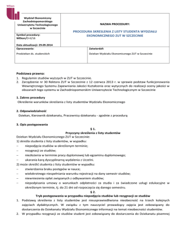 Wydział Ekonomiczny Zachodniopomorskiego Uniwersytetu Technologicznego w Szczecinie Symbol procedury: WEkon/O-II/16 NAZWA PROCEDURY: PROCEDURA SKRESLENIA Z LISTY STUDENTA WYDZIAŁU EKONOMICZNEGO ZUT W SZCZECINIE Data aktualizacji: 29.09.2014 Opracowanie: Zatwierdził: Prodziekan ds. studenckich Dziekan Wydziału Ekonomicznego ZUT w Szczecinie Podstawa prawna: 1. Regulamin studiów wyższych w ZUT w Szczecinie. 2. Zarządzenie nr 30 Rektora ZUT w Szczecinie z 12 czerwca 2013 r. w sprawie podstaw funkcjonowania Wewnętrznego Systemu Zapewniania Jakości Kształcenia oraz wytycznych do realizacji oceny jakości w obszarach tego systemu w Zachodniopomorskim Uniwersytecie Technologicznym w Szczecinie 1. Zakres procedury Określenie warunków skreślania z listy studentów Wydziału Ekonomicznego 2. Odpowiedzialność Dziekan, Kierownik dziekanatu, Pracownicy dziekanatu - zgodnie z procedurą 3. Opis postępowania § 1. Przyczyny skreślenia z listy studentów Dziekan Wydziału Ekonomicznego ZUT w Szczecinie: 1) skreśla studenta z listy studentów, w wypadku: niepodjęcia studiów w określonym terminie; rezygnacji ze studiów; niezłożenia w terminie pracy dyplomowej lub egzaminu dyplomowego; ukarania karą dyscyplinarną wydalenia z Uczelni. 2) może skreślić studenta z listy studentów w wypadku: stwierdzenia braku postępów w nauce; wielokrotnego niespełniania warunku rejestracji na dany semestr studiów; niewniesienia opłat związanych z odbywaniem studiów; niepodpisania umowy o warunkach odpłatności za studia i za świadczone usługi edukacyjne w określonym terminie, tj. do 21 dni od rozpoczęcia się danego semestru. § 2. Tryb postępowania w przypadku niepodjęcia studiów lub rezygnacji ze studiów 1. Podstawą skreślenia z listy studentów jest nieusprawiedliwiona nieobecność na trzech kolejnych zajęciach dydaktycznych. W związku z tym nauczyciel prowadzący zajęcia jest zobowiązany do dostarczenia do Dziekanatu Wydziału Ekonomicznego informacji na temat nieobecności studentów. 2. W przypadku rezygnacji ze studiów student jest zobowiązany do dostarczenia do Dziekanatu pisemnej rezygnacji. § 3. Tryb postępowania w przypadku nieterminowego złożenia pracy dyplomowej 1. Student zobowiązany jest złożyć pracę dyplomową w formie pisemnej (2 kopie) i formie elektronicznej na nośniku CD (1 sztuka) u opiekuna pracy i w dziekanacie nie później niż do 15 czerwca roku akademickiego, w którym ma się odbywać obrona pracy. 2. W szczególnych wypadkach na wniosek studenta, przy pozytywnej opinii promotora, Dziekan może przesunąć termin złożenia pracy dyplomowej o okres nie przekraczający trzech miesięcy. 3. Rektor Zachodniopomorskiego Uniwersytetu Technologicznego w Szczecinie na wniosek studenta, przy pozytywnej opinii opiekuna pracy i Dziekana Wydziału, może przesunąć termin złożenia pracy dyplomowej o kolejne dwa miesiące. Nie złożenie pracy dyplomowej w/w terminach skutkuje skreśleniem z listy studentów. 4. Student jest skreślany z listy studentów w wypadku niezłożenia pracy w terminie i niezłożenia wniosku o przesunięcie terminu złożenia pracy dyplomowej. § 4. Tryb postępowania w przypadku ukarania karą dyscyplinarną wydalenia z Uczelni 1. W wypadku naruszenia przepisów obowiązujących w Uczelni oraz za czyny uchybiające godności studenta - student jest kierowany na komisję dyscyplinarną ds. studentów. 2. W wypadku ukarania studenta karą wydalenia z Uczelni Dziekan skreśla studenta z listy studentów. § 5. Tryb postępowania w przypadku stwierdzenia braku postępów w nauce lub wielokrotnego nie spełniania warunku rejestracji na dany semestr studiów 1. Dziekan może skreślić studenta z listy studentów w przypadku stwierdzenia braku postępów w nauce, co oznacza wielokrotny brak zaliczenia przedmiotu bądź przedmiotów. 2. Dziekan skreśla studenta z listy studentów w momencie wielokrotnego niespełniania warunku rejestracji na dany semestr studiów, czyli nieuzyskania odpowiedniej ilości punktów ECTS w danym semestrze, lub za wszystkie semestry. § 6. Tryb postępowania w wypadku niewniesienia opłat związanych z odbywaniem studiów lub nie podpisania umowy o warunkach odpłatności za studia i za świadczone usługi edukacyjne w określonym terminie, tj. do 21 dni od rozpoczęcia się danego semestru Student, który nie wniesie opłat za powtarzane zajęć lub formy zajęć oraz za świadczone usługi edukacyjne (czesne na studiach niestacjonarnych) może decyzją Dziekana zostać skreślony z listy studentów. § 7. Decyzja o skreśleniu studenta z listy studentów 1. Decyzja o skreśleniu z listy studentów jest sporządzana w dwóch kopiach. Jeden egzemplarz podpisany przez studenta pozostaje w aktach, natomiast drugi jest wydawany studentowi. 2. Studentowi skreślonemu przez Dziekana przysługuje prawo odwołania do Rektora, w terminie 14 dni od daty dostarczenia na piśmie tej decyzji. Decyzja Rektora jest ostateczna. 4. Dokumenty związane z procedurą ---5. Załączniki ---
