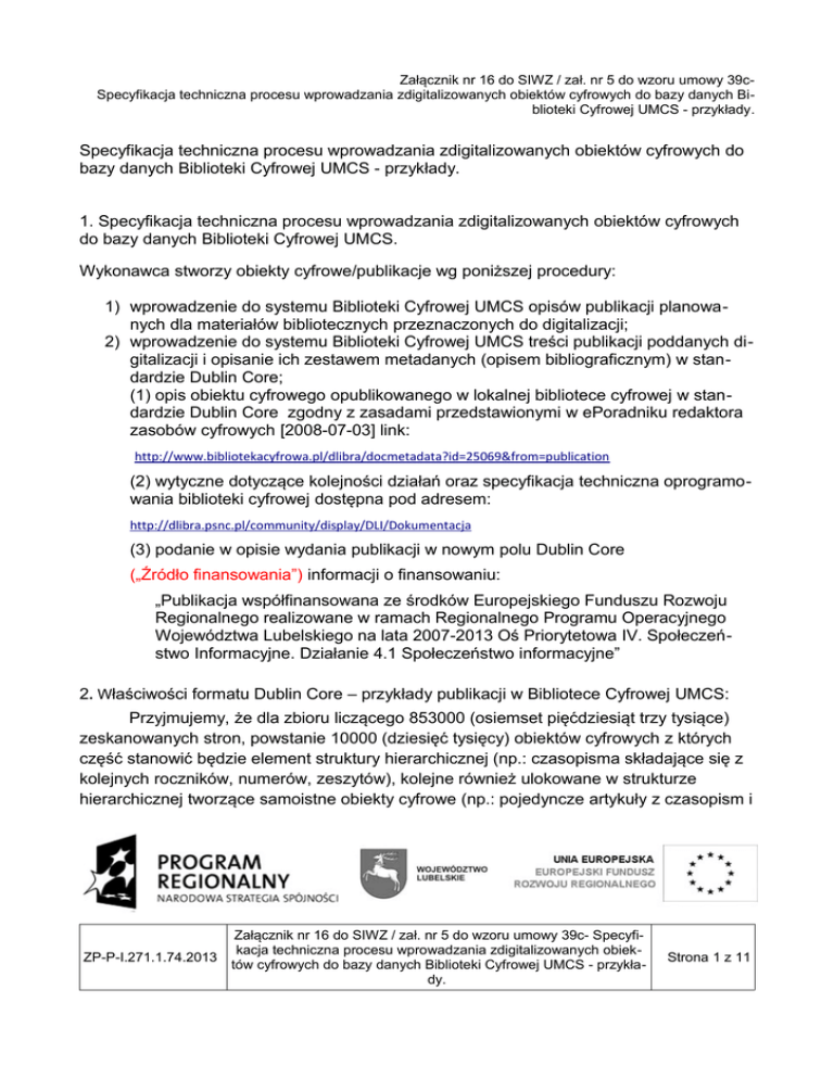 Załącznik nr 16 do SIWZ / zał. nr 5 do wzoru umowy 39cSpecyfikacja techniczna procesu wprowadzania zdigitalizowanych obiektów cyfrowych do bazy danych Biblioteki Cyfrowej UMCS - przykłady. Specyfikacja techniczna procesu wprowadzania zdigitalizowanych obiektów cyfrowych do bazy danych Biblioteki Cyfrowej UMCS - przykłady. 1. Specyfikacja techniczna procesu wprowadzania zdigitalizowanych obiektów cyfrowych do bazy danych Biblioteki Cyfrowej UMCS. Wykonawca stworzy obiekty cyfrowe/publikacje wg poniższej procedury: 1) wprowadzenie do systemu Biblioteki Cyfrowej UMCS opisów publikacji planowanych dla materiałów bibliotecznych przeznaczonych do digitalizacji; 2) wprowadzenie do systemu Biblioteki Cyfrowej UMCS treści publikacji poddanych digitalizacji i opisanie ich zestawem metadanych (opisem bibliograficznym) w standardzie Dublin Core; (1) opis obiektu cyfrowego opublikowanego w lokalnej bibliotece cyfrowej w standardzie Dublin Core zgodny z zasadami przedstawionymi w ePoradniku redaktora zasobów cyfrowych [2008-07-03] link: http://www.bibliotekacyfrowa.pl/dlibra/docmetadata?id=25069&from=publication (2) wytyczne dotyczące kolejności działań oraz specyfikacja techniczna oprogramowania biblioteki cyfrowej dostępna pod adresem: http://dlibra.psnc.pl/community/display/DLI/Dokumentacja (3) podanie w opisie wydania publikacji w nowym polu Dublin Core („Źródło finansowania”) informacji o finansowaniu: „Publikacja współfinansowana ze środków Europejskiego Funduszu Rozwoju Regionalnego realizowane w ramach Regionalnego Programu Operacyjnego Województwa Lubelskiego na lata 2007-2013 Oś Priorytetowa IV. Społeczeństwo Informacyjne. Działanie 4.1 Społeczeństwo informacyjne” 2. Właściwości formatu Dublin Core – przykłady publikacji w Bibliotece Cyfrowej UMCS: Przyjmujemy, że dla zbioru liczącego 853000 (osiemset pięćdziesiąt trzy tysiące) zeskanowanych stron, powstanie 10000 (dziesięć tysięcy) obiektów cyfrowych z których część stanowić będzie element struktury hierarchicznej (np.: czasopisma składające się z kolejnych roczników, numerów, zeszytów), kolejne również ulokowane w strukturze hierarchicznej tworzące samoistne obiekty cyfrowe (np.: pojedyncze artykuły z czasopism i ZP-P-I.271.1.74.2013 Załącznik nr 16 do SIWZ / zał. nr 5 do wzoru umowy 39c- Specyfikacja techniczna procesu wprowadzania zdigitalizowanych obiektów cyfrowych do bazy danych Biblioteki Cyfrowej UMCS - przykłady. Strona 1 z 11 Załącznik nr 16 do SIWZ / zał. nr 5 do wzoru umowy 39cSpecyfikacja techniczna procesu wprowadzania zdigitalizowanych obiektów cyfrowych do bazy danych Biblioteki Cyfrowej UMCS - przykłady. prac zbiorowych), pozostałe samoistne obiekty cyfrowe (np.: książki, starodruki, karty pocztowe, ekslibrisy, mapy). 1) Struktura hierarchiczna czasopisma – składająca się z pojedynczych numerów, zeszytów, wchodzących w skład poszczególnych roczników, woluminów, tworzących w efekcie kompletny tytuł czasopisma: ZP-P-I.271.1.74.2013 Załącznik nr 16 do SIWZ / zał. nr 5 do wzoru umowy 39c- Specyfikacja techniczna procesu wprowadzania zdigitalizowanych obiektów cyfrowych do bazy danych Biblioteki Cyfrowej UMCS - przykłady. Strona 2 z 11 Załącznik nr 16 do SIWZ / zał. nr 5 do wzoru umowy 39cSpecyfikacja techniczna procesu wprowadzania zdigitalizowanych obiektów cyfrowych do bazy danych Biblioteki Cyfrowej UMCS - przykłady. ZP-P-I.271.1.74.2013 Załącznik nr 16 do SIWZ / zał. nr 5 do wzoru umowy 39c- Specyfikacja techniczna procesu wprowadzania zdigitalizowanych obiektów cyfrowych do bazy danych Biblioteki Cyfrowej UMCS - przykłady. Strona 3 z 11 Załącznik nr 16 do SIWZ / zał. nr 5 do wzoru umowy 39cSpecyfikacja techniczna procesu wprowadzania zdigitalizowanych obiektów cyfrowych do bazy danych Biblioteki Cyfrowej UMCS - przykłady. ZP-P-I.271.1.74.2013 Załącznik nr 16 do SIWZ / zał. nr 5 do wzoru umowy 39c- Specyfikacja techniczna procesu wprowadzania zdigitalizowanych obiektów cyfrowych do bazy danych Biblioteki Cyfrowej UMCS - przykłady. Strona 4 z 11 Załącznik nr 16 do SIWZ / zał. nr 5 do wzoru umowy 39cSpecyfikacja techniczna procesu wprowadzania zdigitalizowanych obiektów cyfrowych do bazy danych Biblioteki Cyfrowej UMCS - przykłady. 2) Struktura hierarchiczna czasopisma/pracy zbiorowej – składająca się z pojedynczych artykułów, recenzji, wchodzących w skład poszczególnych roczników, woluminów, tworzących w efekcie kompletny tytuł czasopisma lub samoistną pracę zbiorową: ZP-P-I.271.1.74.2013 Załącznik nr 16 do SIWZ / zał. nr 5 do wzoru umowy 39c- Specyfikacja techniczna procesu wprowadzania zdigitalizowanych obiektów cyfrowych do bazy danych Biblioteki Cyfrowej UMCS - przykłady. Strona 5 z 11 Załącznik nr 16 do SIWZ / zał. nr 5 do wzoru umowy 39cSpecyfikacja techniczna procesu wprowadzania zdigitalizowanych obiektów cyfrowych do bazy danych Biblioteki Cyfrowej UMCS - przykłady. ZP-P-I.271.1.74.2013 Załącznik nr 16 do SIWZ / zał. nr 5 do wzoru umowy 39c- Specyfikacja techniczna procesu wprowadzania zdigitalizowanych obiektów cyfrowych do bazy danych Biblioteki Cyfrowej UMCS - przykłady. Strona 6 z 11 Załącznik nr 16 do SIWZ / zał. nr 5 do wzoru umowy 39cSpecyfikacja techniczna procesu wprowadzania zdigitalizowanych obiektów cyfrowych do bazy danych Biblioteki Cyfrowej UMCS - przykłady. ZP-P-I.271.1.74.2013 Załącznik nr 16 do SIWZ / zał. nr 5 do wzoru umowy 39c- Specyfikacja techniczna procesu wprowadzania zdigitalizowanych obiektów cyfrowych do bazy danych Biblioteki Cyfrowej UMCS - przykłady. Strona 7 z 11 Załącznik nr 16 do SIWZ / zał. nr 5 do wzoru umowy 39cSpecyfikacja techniczna procesu wprowadzania zdigitalizowanych obiektów cyfrowych do bazy danych Biblioteki Cyfrowej UMCS - przykłady. ZP-P-I.271.1.74.2013 Załącznik nr 16 do SIWZ / zał. nr 5 do wzoru umowy 39c- Specyfikacja techniczna procesu wprowadzania zdigitalizowanych obiektów cyfrowych do