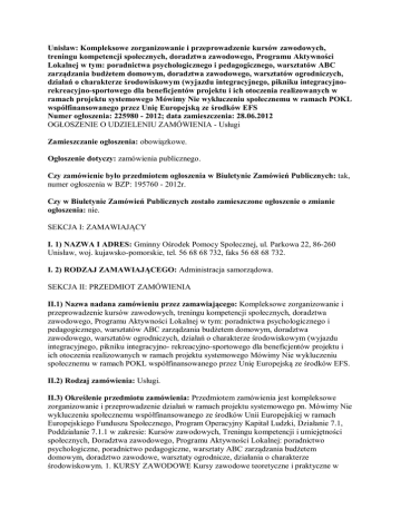 Unisław: Kompleksowe zorganizowanie i przeprowadzenie kursów zawodowych, treningu kompetencji społecznych, doradztwa zawodowego, Programu Aktywności Lokalnej w tym: poradnictwa psychologicznego i pedagogicznego, warsztatów ABC zarządzania budżetem domowym, doradztwa zawodowego, warsztatów ogrodniczych, działań o charakterze środowiskowym (wyjazdu integracyjnego, pikniku integracyjnorekreacyjno-sportowego dla beneficjentów projektu i ich otoczenia realizowanych w ramach projektu systemowego Mówimy Nie wykluczeniu społecznemu w ramach POKL współfinansowanego przez Unię Europejską ze środków EFS Numer ogłoszenia: 225980 - 2012; data zamieszczenia: 28.06.2012 OGŁOSZENIE O UDZIELENIU ZAMÓWIENIA - Usługi Zamieszczanie ogłoszenia: obowiązkowe. Ogłoszenie dotyczy: zamówienia publicznego. Czy zamówienie było przedmiotem ogłoszenia w Biuletynie Zamówień Publicznych: tak, numer ogłoszenia w BZP: 195760 - 2012r. Czy w Biuletynie Zamówień Publicznych zostało zamieszczone ogłoszenie o zmianie ogłoszenia: nie. SEKCJA I: ZAMAWIAJĄCY I. 1) NAZWA I ADRES: Gminny Ośrodek Pomocy Społecznej, ul. Parkowa 22, 86-260 Unisław, woj. kujawsko-pomorskie, tel. 56 68 68 732, faks 56 68 68 732. I. 2) RODZAJ ZAMAWIAJĄCEGO: Administracja samorządowa. SEKCJA II: PRZEDMIOT ZAMÓWIENIA II.1) Nazwa nadana zamówieniu przez zamawiającego: Kompleksowe zorganizowanie i przeprowadzenie kursów zawodowych, treningu kompetencji społecznych, doradztwa zawodowego, Programu Aktywności Lokalnej w tym: poradnictwa psychologicznego i pedagogicznego, warsztatów ABC zarządzania budżetem domowym, doradztwa zawodowego, warsztatów ogrodniczych, działań o charakterze środowiskowym (wyjazdu integracyjnego, pikniku integracyjno- rekreacyjno-sportowego dla beneficjentów projektu i ich otoczenia realizowanych w ramach projektu systemowego Mówimy Nie wykluczeniu społecznemu w ramach POKL współfinansowanego przez Unię Europejską ze środków EFS. II.2) Rodzaj zamówienia: Usługi. II.3) Określenie przedmiotu zamówienia: Przedmiotem zamówienia jest kompleksowe zorganizowanie i przeprowadzenie działań w ramach projektu systemowego pn. Mówimy Nie wykluczeniu społecznemu współfinansowanego ze środków Unii Europejskiej w ramach Europejskiego Funduszu Społecznego, Program Operacyjny Kapitał Ludzki, Działanie 7.1, Poddziałanie 7.1.1 w zakresie: Kursów zawodowych, Treningu kompetencji i umiejętności społecznych, Doradztwa zawodowego, Programu Aktywności Lokalnej: poradnictwo psychologiczne, poradnictwo pedagogiczne, warsztaty ABC zarządzania budżetem domowym, doradztwo zawodowe, warsztaty ogrodnicze, działania o charakterze środowiskowym. 1. KURSY ZAWODOWE Kursy zawodowe teoretyczne i praktyczne w instytucjach i zakładach odpowiadających specyfice danego kursu dla 18 beneficjentów (podopieczni GOPS): a) pracownik robót ogólnobudowlanych - 5 osób (80 godz. dla każdej osoby) b) sprzedawca z obsługą kasy fiskalnej i fakturowaniem - 13 osób - 60 godzin dla każdej osoby, c) podstawy obsługi komputera -8 osób - 40 godzin dla każdej osoby. 1 godzina dydaktyczna = 45 minut Wykonanie badań lekarskich dla 18 beneficjantów w celu stwierdzenia braku przeciwwskazań do odbycia danego kursu zawodowego; wykonanie dodatkowych badań specjalistycznych, jeśli takie będą wymagane; ubezpieczenie beneficjentów od następstw nieszczęśliwych wypadków. Okres trwania kursów: lipiec wrzesień 2012 rok (rozpoczęcie kursów nastąpi po ukończeniu I części treningu kompetencji i umiejętności społecznych oraz doradztwa zawodowego). Kursy zawodowe winny odbywać się od poniedziałku do piątku (w dni robocze). Kursy zawodowe winny odbywać się w godzinach od 8:00 a 17:00. Kursy zawodowe winny odbywać się w miejscowości Unisław lub innej miejscowości oddalonej od Unisławia nie dalej niż 60 km. Wykonawca zobowiązuje się dowiezienia uczestników z ich miejsca zamieszkania do miejsca odbywania kursów oraz odwiezienie z powrotem do ich miejsca zamieszkania lub zwrot kosztów za dojazdy na trasie : Kokocko, Bruki Unisławskie, Błoto, Stablewice, Unisław w każdym dniu odbywanego szkolenia czy zajęć. Wykonawca zapewnia i ponosi koszty wynajęcia sali wykładowej Wykonawca w ciągu każdego dnia zajęciowego zapewnia: przerwy kawowe (dwie przerwy kawowe, podczas których serwowane będą minimum: kawa i herbata bez ograniczeń; ciastka 100 g. na 1 uczestnika, słone paluszki 100g na 1 uczestnika i zimne napoje minimum 0,5 litra na jednego uczestnika (woda mineralna, sok) oraz poczęstunek w postaci ciepłego dania obiadowego (przykładowy zestaw: ziemniaki (200 g.)lub frytki (150 g.), mięso lub ryba (150 g. - waga po przetworzeniu), surówka (150 g.) 2. TRENING KOMPETENCJI I UMIEJĘTNOŚCI SPOŁECZNYCH Trening kompetencji i umiejętności społecznych dla 18 beneficjentów (podopieczni GOPS) Ilość godzin dydaktycznych - 40 na całą grupę - 2 etapy (1 godzina dydaktyczna = 45 minut) I etap w okresie czerwiec- lipiec, drugi etap po zakończeniu kursów zawodowych - wrzesień-październik Wymagany minimalny zakres tematyczny zajęć: trening postaw i komunikacji interpersonalnej, radzenie sobie ze stresem i negatywnymi emocjami, zasady konstruowania celów życiowych, wypracowanie planu zmiany osobistej: potrzeba rozwoju, edukacji, samorealizacji, zajęcia z pozytywnego myślenia, asertywność. Okres trwania zajęć: Czerwiec - lipiec 2012 rok, wrzesień październik Zajęcia winny odbywać się od poniedziałku do piątku (w dni robocze). Zajęcia winny odbywać się w godzinach od 8:00 a 15:00. Zajęcia winny odbywać się w miejscowości Unisław. Zajęcia winny być prowadzone przez specjalistów z tej dziedziny. Wykonawca zapewnia i ponosi koszty wynajęcia sali wykładowej Wykonawca zobowiązuje się dowiezienia uczestników z ich miejsca zamieszkania do miejsca odbywania kursów oraz odwiezienie z powrotem do ich miejsca zamieszkania lub zwrot kosztów 