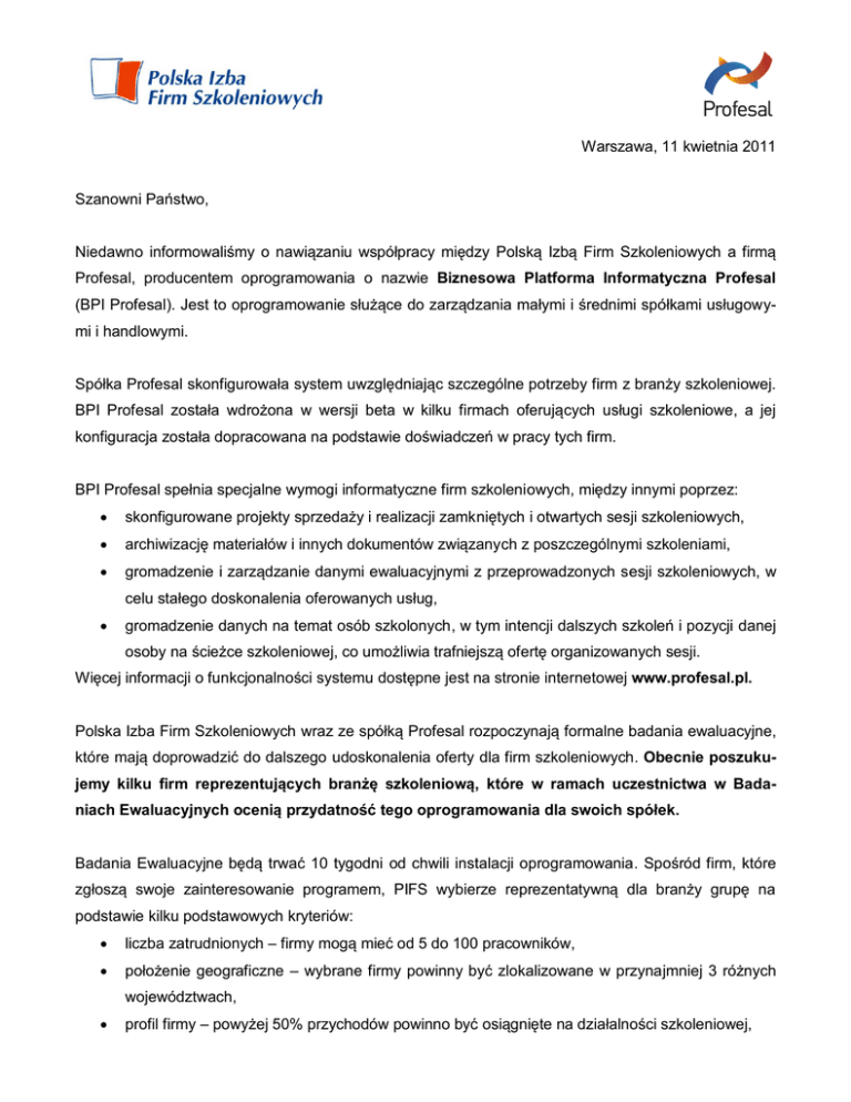 Warszawa, 11 kwietnia 2011 Szanowni Państwo, Niedawno informowaliśmy o nawiązaniu współpracy między Polską Izbą Firm Szkoleniowych a firmą Profesal, producentem oprogramowania o nazwie Biznesowa Platforma Informatyczna Profesal (BPI Profesal). Jest to oprogramowanie służące do zarządzania małymi i średnimi spółkami usługowymi i handlowymi. Spółka Profesal skonfigurowała system uwzględniając szczególne potrzeby firm z branży szkoleniowej. BPI Profesal została wdrożona w wersji beta w kilku firmach oferujących usługi szkoleniowe, a jej konfiguracja została dopracowana na podstawie doświadczeń w pracy tych firm. BPI Profesal spełnia specjalne wymogi informatyczne firm szkoleniowych, między innymi poprzez: skonfigurowane projekty sprzedaży i realizacji zamkniętych i otwartych sesji szkoleniowych, archiwizację materiałów i innych dokumentów związanych z poszczególnymi szkoleniami, gromadzenie i zarządzanie danymi ewaluacyjnymi z przeprowadzonych sesji szkoleniowych, w celu stałego doskonalenia oferowanych usług, gromadzenie danych na temat osób szkolonych, w tym intencji dalszych szkoleń i pozycji danej osoby na ścieżce szkoleniowej, co umożliwia trafniejszą ofertę organizowanych sesji. Więcej informacji o funkcjonalności systemu dostępne jest na stronie internetowej www.profesal.pl. Polska Izba Firm Szkoleniowych wraz ze spółką Profesal rozpoczynają formalne badania ewaluacyjne, które mają doprowadzić do dalszego udoskonalenia oferty dla firm szkoleniowych. Obecnie poszukujemy kilku firm reprezentujących branżę szkoleniową, które w ramach uczestnictwa w Badaniach Ewaluacyjnych ocenią przydatność tego oprogramowania dla swoich spółek. Badania Ewaluacyjne będą trwać 10 tygodni od chwili instalacji oprogramowania. Spośród firm, które zgłoszą swoje zainteresowanie programem, PIFS wybierze reprezentatywną dla branży grupę na podstawie kilku podstawowych kryteriów: liczba zatrudnionych – firmy mogą mieć od 5 do 100 pracowników, położenie geograficzne – wybrane firmy powinny być zlokalizowane w przynajmniej 3 różnych województwach, profil firmy – powyżej 50% przychodów powinno być osiągnięte na działalności szkoleniowej, obroty – poszukujemy firm, których obroty wynoszą od 0,5 do 20 milionów PLN, stan infrastruktury informatycznej i poziom wsparcia informatycznego dostępny dla spółki. Badanie Ewaluacyjne BPI Profesal będzie polegać na instalacji oprogramowania i wykorzystaniu jego możliwości w codziennej pracy firmy. W badaniu powinni brać udział pracownicy na każdym szczeblu hierarchii służbowej firmy. Producent oprogramowania będzie w stałym kontakcie z firmą biorącą udział w badaniach. Po 10 tygodniach używania programu oceniająca firma wyda opinię, czy BPI Profesal nadaje się do użytku w branży szkoleniowej i czy stanowi pomoc w działalności firmy. Po wydaniu opinii oceniające firmy będą miały dodatkowe 16 tygodni na decyzję o nabyciu Biznesowej Platformy Informatycznej Profesal dla swoich potrzeb. Profesal zobowiązuje się do udzielenia firmom uczestniczącym w Badaniach Ewaluacyjnych 30% rabatu. Ze względu na to, że cena oprogramowania zależy od ilości użytkowników, nie możemy w tym piśmie podać dokładnej ceny oprogramowania dla uczestniczących firm. Spółka Profesal zobowiązuje się rozłożyć resztę ceny na korzystne miesięczne raty, tak aby rata nie przekraczała 1000 PLN na miesiąc. Firmy zainteresowane uczestnictwem w badaniach prosimy o przestudiowanie Regulaminu Badań Ewaluacyjnych w zamieszczonego w Załączniku 1 do niniejszego pisma, a następnie o wypełnienie, podpisanie i przesłanie zeskanowanej Ankiety Zgłoszeniowej zamieszczonej w Załączniku 2 na adres: [email protected] lub faksem na numer 22 692 15 21 do piątku 22 kwietnia bieżącego roku. Spośród zgłoszonych firm, Polska Izba Firm Szkoleniowych wybierze - na podstawie wyżej wymienionych kryteriów – te, z którymi podpisana zostanie umowa na udział w Badaniach Ewaluacyjnych. W razie dodatkowych pytań dotyczących procesu Badań Ewaluacyjnych prosimy kontaktować się z panią Jolantą Mejszutowicz, adres [email protected], numer telefonu: (22) 692 15 23. Pozdrawiamy i liczymy na współpracę: Dyrektor Zarządzający Prezes Zarządu Polska Izba Firm Szkoleniowych Profesal Sp. z o.o. Michał Gawryszczak Adam Życzkowski .