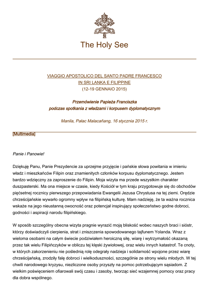 The Holy See VIAGGIO APOSTOLICO DEL SANTO PADRE FRANCESCO IN SRI LANKA E FILIPPINE (12-19 GENNAIO 2015) Przemówienie Papieża Franciszka podczas spotkania z władzami i korpusem dyplomatycznym Manila, Pałac Malacañang, 16 stycznia 2015 r. [Multimedia] Panie i Panowie! Dziękuję Panu, Panie Prezydencie za uprzejme przyjęcie i pańskie słowa powitania w imieniu władz i mieszkańców Filipin oraz znamienitych członków korpusu dyplomatycznego. Jestem bardzo wdzięczny za zaproszenie do Filipin. Moja wizyta ma przede wszystkim charakter duszpasterski. Ma ona miejsce w czasie, kiedy Kościół w tym kraju przygotowuje się do obchodów pięćsetnej rocznicy pierwszego przepowiadania Ewangelii Jezusa Chrystusa na tej ziemi. Orędzie chrześcijańskie wywarło ogromny wpływ na filipińską kulturę. Mam nadzieję, że ta ważna rocznica wskaże na jego nieustanną owocność oraz potencjał inspirujący społeczeństwo godne dobroci, godności i aspiracji narodu filipińskiego. W sposób szczególny obecna wizyta pragnie wyrazić moją bliskość wobec naszych braci i sióstr, którzy doświadczyli cierpienia, strat i zniszczenia spowodowanego tajfunem Yolanda. Wraz z wieloma osobami na całym świecie podziwiałem heroiczną siłę, wiarę i wytrzymałość okazaną przez tak wielu Filipińczyków w obliczu tej klęski żywiołowej, oraz wielu innych katastrof. Te cnoty, w których zakorzenieniu nie poślednią rolę odegrały nadzieja i solidarność wpojone przez wiarę chrześcijańską, zrodziły falę dobroci i wielkoduszności, szczególnie ze strony wielu młodych. W tej chwili narodowego kryzysu, niezliczone osoby przyszły na pomoc potrzebującym sąsiadom. Z wielkim poświęceniem ofiarowali swój czasu i zasoby, tworząc sieć wzajemnej pomocy oraz pracy dla dobra wspólnego. 2 Ten przykład solidarności w dziele odbudowy daje nam ważną lekcję. Każde społeczeństwo, podobnie jak rodzina, czerpie ze swoich najgłębszych zasobów w celu sprostania nowym wyzwaniom. Dziś Filipiny, wraz z wieloma innymi krajami w Azji, stoją przed wyzwaniem budowy na solidnych fundamentach nowoczesnego społeczeństwa – społeczeństwa szanującego autentyczne wartości ludzkie, chroniącego naszą nadaną przez Boga ludzką godność oraz prawa człowieka, gotowego do konfrontacji z nowymi i złożonymi kwestiami politycznymi i etycznymi. Jak wskazało wiele głosów w waszym kraju, dzisiaj bardziej niż kiedykolwiek jest konieczne, aby przywódcy polityczni wyróżniali się uczciwością, rzetelnością i zaangażowaniem na rzecz dobra wspólnego. W ten sposób pomogą oni w zachowaniu bogatych zasobów ludzkich i naturalnych, jakimi Bóg pobłogosławił ten kraj. Tak będą oni zdolni do kierowania zasobami moralnymi niezbędnymi, by sprostać wymaganiom współczesności i przekazać nowym pokoleniom społeczeństwo autentycznie sprawiedliwe, solidarne i pokojowe. Istotne znaczenie dla osiągnięcia tych celów narodowych ma imperatyw moralny zapewnienia sprawiedliwości społecznej i poszanowania ludzkiej godności. Wielka tradycja biblijna nakłada na wszystkie narody obowiązek słuchania głosu biednych oraz zerwania więzów niesprawiedliwości i ucisku, rodzących rażące, a nawet skandaliczne nierówności społeczne. Reformowanie struktur społecznych, które utrwalają ubóstwo i wykluczenie biednych po pierwsze wymaga nawrócenia umysłu i serca. Biskupi Filipin prosili, aby obecny rok został ogłoszony „Rokiem Ubogich”. Mam nadzieję, że to prorocze wołanie będzie stanowiło wyzwanie dla wszystkich, na każdym poziomie społeczeństwa, aby odrzucić wszelkie formy korupcji, która odsuwa środki od biednych. Niech ono także inspiruje wspólny wysiłek, aby zapewnić włączenie każdego mężczyzny, kobiety i dziecka w życie społeczeństwa. Podstawową rolę w odnowie społeczeństwa odgrywa oczywiście rodzina, a zwłaszcza młodzież. Punktem kulminacyjnym mojej wizyty będą spotkania z rodzinami i ludźmi młodymi tutaj w Manili. Rodziny mają w społeczeństwie misję, której nie da się zastąpić. To właśnie w rodzinie dzieci nabywają solidnych wartości, wzniosłych ideałów i prawdziwej troski o innych. Jednak, podobnie jak wszystkie Boże dary, rodzina może być również zniekształcona i zniszczona. Potrzebuje naszego wsparcia. Wiemy, jak trudno jest dzisiaj w naszych demokracjach zachować i obronić takie podstawowe ludzkie wartości, jak poszanowanie nienaruszalnej godności każdej osoby ludzkiej, respektowanie praw sumienia i wolności religijnej oraz poszanowanie niezbywalnego prawa do życia, począwszy od dzieci jeszcze nienarodzonych aż po życie osób starszych i niedołężnych. Z tego powodu, trzeba zachęcić i wspierać rodziny i społeczności lokalne w ich staraniach o przekazanie naszej młodzieży wartości i wizji, które mogą doprowadzić do kultury uczciwości – takiej, która szanuje dobroć, prawdomówność, wierność i solidarność jako solidny fundament i spoiwo moralne trzymające społeczeństwo razem. Panie Prezydencie, szanowni przedstawiciele władz, drodzy przyjaciele: Zaczynając moją wizytę w tym kraju, nie mogę nie wspomnieć ważnej roli Filipin w krzewieniu 3 porozumienia i współpracy między krajami Azji, a także często pomijanego, tym niemniej rzeczywistego wkładu Filipińskich emigrantów w życie i dobrobyt społeczeństw, w których żyją. To właśnie w świetle bogatego dziedzictwa kulturowego i religijnego, z którego dumny jest wasz kraj, pozostawiam wam jedno wyzwanie i jedną zachętę. Niech najgłębsze wartości duchowe narodu Filipińskiego nadal znajdują wyraz w wysiłkach, aby zapewnić waszym współobywatelom integralny rozwój ludzki. W ten sposób każdy będzie mógł zrealizować swój potencjał, a tak mądrze i dobrze przyczynić się dla przyszłości tego kraju. Ufam, że godne pochwały wysiłki na rzecz promocji dialogu i współpracy między wyznawcami ró