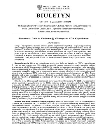 BIURO BADAŃ I ANALIZ BIULETYN Nr 67 (599) 3 grudnia 2009 © PISM Redakcja: Sławomir Dębski (redaktor naczelny), Łukasz Adamski, Mateusz Gniazdowski, Beata Górka-Winter, Leszek Jesień, Agnieszka Kondek (sekretarz redakcji), Łukasz Kulesa, Ernest Wyciszkiewicz Stanowisko Chin na Konferencję Klimatyczną NZ w Kopenhadze Artur Gradziuk Chiny – największy na świecie emitent gazów cieplarnianych (GHG) – odgrywają kluczową rolę w negocjacjach przyszłego porozumienia klimatycznego. W ramach protokołu z Kioto nie posiadają zobowiązań redukcyjnych oraz finansowych i deklarują podobne oczekiwania w stosunku do nowego porozumienia. Główne postulaty Chin dotyczą redukcji emisji GHG przez kraje uprzemysłowione o 40%, finansowania przez nie działań w zakresie mitygacji i adaptacji w krajach rozwijających się oraz niekomercyjnych zasad transferu technologii. Stanowisko Chin jest jednak trudne do zaakceptowania przez Stany Zjednoczone i Unię Europejską. Uwarunkowania. Chiny są największym emitentem CO2 na świecie: w 2007 r. wyemitowały 6,1 mld ton tego gazu (ponad 21% globalnych emisji), z czego najwięcej przypadło na sektor elektroenergetyczny (ok. 50%) oraz przemysł (28%). W związku z dynamicznym rozwojem rynku samochodowego szybko rosną emisje pochodzące z sektora transportu. Wpływ na wysoki poziom emisji GHG ma przede wszystkim duża rola w gospodarce węgla, którego udział w strukturze zużycia energii pierwotnej wynosi ponad 60%, natomiast w strukturze produkcji energii elektrycznej ok. 80%. Biorąc ponadto pod uwagę energochłonność chińskiej gospodarki, zdolność Chin nie tylko do redukcji emisji, ale nawet do znaczącego spowolnienia ich wzrostu przy wysokim poziomie wzrostu PKB, jest ograniczona. Kilka lat temu Chiny zaczęły realizować aktywną politykę klimatyczną. W 2006 r. w jedenastym planie pięcioletnim przyjęto jako cel na 2010 r. redukcję zużycia energii na jednostkę PKB o 20% w stosunku do 2005 r. oraz wzrost udziału odnawialnych źródeł energii (OZE) w strukturze zużycia energii pierwotnej do 10%. W 2007 r. przyjęto Narodowy Plan Odpowiedzi na Zmiany Klimatyczne, w którym podkreślono ryzyko wynikające z podniesienia poziomu mórz oraz pustynnienia niektórych obszarów. Przyjęto również plan działania dotyczący adaptacji do zmian klimatycznych. Zdając sobie sprawę z trudności związanych z ograniczeniem całkowitego poziomu emisji GHG, główny nacisk położno na poprawę efektywności energetycznej i rozwój niskoemisyjnych źródeł energii, zwłaszcza energetyki jądrowej i OZE, a jako kryterium oceny skuteczności tych działań przyjęto wskaźnik redukcji emisji CO2 na jednostkę PKB. Główne elementy stanowiska negocjacyjnego. Od Chin, emitujących obecnie najwięcej GHG, oczekuje się – podobnie jak i od Stanów Zjednoczonych – ambitnych deklaracji redukcyjnych. Rząd Chin podkreśla jednak, że głównym priorytetem kraju jest rozwój, więc zaciąganie zobowiązań, które mogłoby negatywnie wpłynąć na wzrost gospodarczy jest nie do przyjęcia. Zasadniczym elementem stanowiska negocjacyjnego Chin jest odwoływanie się do zasad historycznej odpowiedzialności za emisję oraz „wspólnej, lecz zróżnicowanej odpowiedzialności” za przeciwdziałanie zmianom klimatycznym. Wskaźnikiem, do którego często odwołują się Chiny, jest poziom emisji per capita, który wynosi 4,6 t CO2 i jest znacznie niższy niż we wszystkich krajach uprzemysłowionych. Dlatego, ich zdaniem, największy ciężar odpowiedzialności za ochronę klimatu powinny ponieść kraje uprzemysłowione. ChRL stoi na stanowisku, że powinny one do 2020 r. zredukować emisję GHG przynajmniej o 40% w stosunku do 1990 r. Natomiast kraje rozwijające się w ramach właściwych krajowych działań łagodzących (NAMA) nie powinny mieć prawnie wiążących zobowiązań redukcyjnych, zaś ich 2086 Polski Instytut Spraw Międzynarodowych działania zmierzające do ograniczenia emisji GHG powinny być obligatoryjnie wspierane przez kraje uprzemysłowione. Chiny nie zadeklarowały poziomu redukcji emisji GHG, niemniej jednak pod koniec listopada br. (w odpowiedzi na deklaracje redukcyjne USA) zapowiedziały redukcję do 2020 r. o 40–45% w stosunku do 2005 r. emisji w przeliczeniu na jednostkę PKB. Nie oznacza to zmniejszenia emisji GHG w Chinach, lecz jedynie spowolnienie tempa ich wzrostu. Przedstawiona deklaracja jest dobrowolnym krajowym celem redukcyjnym Chin, który niekoniecznie zostanie zapisany jako zobowiązanie w przyszłym porozumieniu klimatycznym. Chiny są krajem, w którym realizowanych jest najwięcej projektów mechanizmu czystego rozwoju CDM (zarejestrowanych 673 projektów na 1916 w skali globalnej), czyli inwestycji państw rozwiniętych w państwach rozwijających się mających na celu redukcję, uniknięcie lub pochłanianie GHG, które może zostać wykorzystane do rozliczenia zobowiązań protokołu z Kioto. Dlatego też mają pozytywny stosunek do możliwości zwiększenia ich stosowania licząc na to, że współpraca międzynarodowa przy ich realizacji przyczyni się do zwiększenia zdolności krajowych przedsiębiorstw w działaniach związanych z ochroną klimatu. W ramach działań związanych z łagodzeniem zmian klimatycznych i adaptacją Chiny chcą, aby kraje uprzemysłowione dostarczały krajom rozwijającym się odpowiednich technologii. Co więcej, transfer tych technologii powinien być przez kraje uprzemysłowione finansowany. Kwestią o szczególnym znaczeniu dla Chin jest złagodzenie międzynarodowych norm ochrony własności intelektualnej w odniesieniu do technologii sprzyjających ochronie klimatu. Pożądanym rozwiązaniem jest obowiązkowe udzielanie licencji na korzystanie z patentów na te technologie oraz zapewnienie krajom rozwijającym się dostępu do nich po obniżonych lub zerowych kosztach. Chiny opowiadają się również za nowymi rozwiązaniami instytucjonalnymi maj