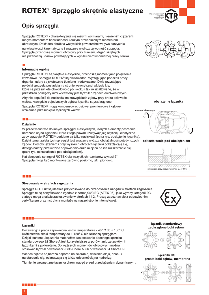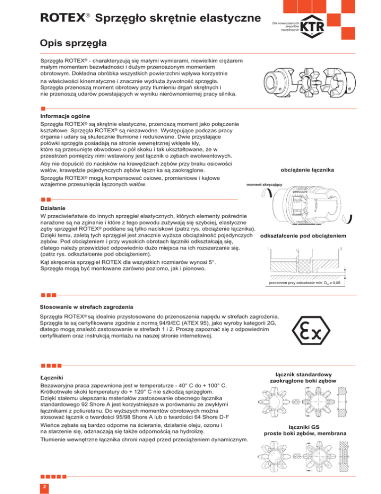 ROTEX® 6SU]ĊJáRVNUĊWQLHHODVW\F]QH 'ODQRZRF]HVQ\FK ]HVSRáyZ QDSĊGRZ\FK 2SLVVSU]ĊJáD 6SU]ĊJáD527(;FKDUDNWHU\]XMąVLĊPDá\PLZ\PLDUDPLQLHZLHONLPFLĊĪDUHP PDá\PPRPHQWHPEH]ZáDGQRĞFLLGXĪ\PSU]HQRV]RQ\PPRPHQWHP REURWRZ\P'RNáDGQDREUyENDZV]\VWNLFKSRZLHU]FKQLZSá\ZDNRU]\VWQLH QDZáDĞFLZRĞFLNLQHPDW\F]QHL]QDF]QLHZ\GáXĪDĪ\ZRWQRĞüVSU]ĊJáD 6SU]ĊJáDSU]HQRV]ąPRPHQWREURWRZ\SU]\WáXPLHQLXGUJDĔVNUĊWQ\FKL QLHSU]HQRV]ąXGDUyZSRZVWDMąF\FKZZ\QLNXQLHUyZQRPLHUQHMSUDF\VLOQLND ,QIRUPDFMHRJyOQH 6SU]ĊJáD527(;VąVNUĊWQLHHODVW\F]QHSU]HQRV]ąPRPHQWMDNRSRáąF]HQLH NV]WDáWRZH6SU]ĊJáD527(;VąQLH]DZRGQH:\VWĊSXMąFHSRGF]DVSUDF\ GUJDQLDLXGDU\VąVNXWHF]QLHWáXPLRQHLUHGXNRZDQH'ZLHSU]\VWDMąFH SRáyZNLVSU]ĊJáDSRVLDGDMąQDVWURQLHZHZQĊWU]QHMZNOĊVáHNá\ NWyUHVąSU]HVXQLĊWHREZRGRZRRSyáVNRNXLWDNXNV]WDáWRZDQHĪHZ SU]HVWU]HĔSRPLĊG]\QLPLZVWDZLRQ\MHVWáąF]QLNR]ĊEDFKHZROZHQWRZ\FK $E\QLHGRSXĞFLüGRQDFLVNyZQDNUDZĊG]LDFK]ĊEyZSU]\EUDNXRVLRZRĞFL ZDáyZNUDZĊG]LHSRMHG\QF]\FK]ĊEyZáąF]QLNDVą]DRNUąJORQH 6SU]ĊJáD527(;PRJąNRPSHQVRZDüRVLRZHSURPLHQLRZHLNąWRZH Z]DMHPQHSU]HVXQLĊFLDáąF]RQ\FKZDáyZ REFLąĪHQLHáąF]QLND PRPHQWVNUĊFDMąF\ Druck pressure ']LDáDQLH :SU]HFLZLHĔVWZLHGRLQQ\FKVSU]ĊJLHáHODVW\F]Q\FKNWyU\FKHOHPHQW\SRĞUHGQLH QDUDĪRQHVąQD]JLQDQLHLNWyUH]WHJRSRZRGX]XĪ\ZDMąVLĊV]\EFLHMHODVW\F]QH ]ĊE\VSU]ĊJLHá527(;SRGGDQHVąW\ONRQDFLVNRZLSDWU]U\VREFLąĪHQLHáąF]QLND ']LĊNLWHPX]DOHWąW\FKVSU]ĊJLHáMHVW]QDF]QLHZ\ĪV]DREFLąĪDOQRĞüSRMHG\QF]\FK RGNV]WDáFHQLHSRGREFLąĪHQLHP ]ĊEyZ3RGREFLąĪHQLHPLSU]\Z\VRNLFKREURWDFKáąF]QLNLRGNV]WDáFDMąVLĊ GODWHJRQDOHĪ\SU]HZLG]LHüRGSRZLHGQLRGXĪRPLHMVFDQDLFKUR]V]HU]DQLHVLĊ SDWU]U\VRGNV]WDáFHQLHSRGREFLąĪHQLHP .ąWVNUĊFHQLDVSU]ĊJLHá527(;GODZV]\VWNLFKUR]PLDUyZZ\QRVL 6SU]ĊJáDPRJąE\üPRQWRZDQH]DUyZQRSR]LRPRMDNLSLRQRZR SU]HVWU]HĔSU]\]DEXGRZLHPLQ'+[ 6WRVRZDQLHZVWUHIDFK]DJURĪHQLD 6SU]ĊJáD527(;VąLGHDOQLHSU]\VWRVRZDQHGRSU]HQRV]HQLDQDSĊGXZVWUHIDFK]DJURĪHQLD 6SU]ĊJáDWHVąFHUW\ILNRZDQH]JRGQLH]QRUPą(&$7(;MDNRZ\URE\NDWHJRULL* GODWHJRPRJą]QDOHĨü]DVWRVRZDQLHZVWUHIDFKL3URV]Ċ]DSR]QDüVLĊ]RGSRZLHGQLP FHUW\ILNDWHPRUD]LQVWUXNFMąPRQWDĪXQDQDV]HMVWURQLHLQWHUQHWRZHM àąF]QLNL %H]DZDU\MQDSUDFD]DSHZQLRQDMHVWZWHPSHUDWXU]H&GR& .UyWNRWUZDáHVNRNLWHPSHUDWXU\GR&QLHV]NRG]ąVSU]ĊJáRP ']LĊNLVWDáHPXXOHSV]DQLXPDWHULDáyZ]DVWRVRZDQLHREHFQHJRáąF]QLND VWDQGDUGRZHJR6KRUH$MHVWNRU]\VWQLHMV]HZSRUyZQDQLX]H]Z\Ná\PL áąF]QLNDPL]SROLXUHWDQX'RZ\ĪV]\FKPRPHQWyZREURWRZ\FKPRĪQD VWRVRZDüáąF]QLNRWZDUGRĞFL6KRUH$OXERWZDUGRĞFL6KRUH') :LHĔFH]ĊEDWHVąEDUG]RRGSRUQHQDĞFLHUDQLHG]LDáDQLHROHMXR]RQXL QDVWDU]HQLHVLĊRG]QDF]DMąVLĊWDNĪHRGSRUQRĞFLąQDK\GUROL]Ċ 7áXPLHQLHZHZQĊWU]QHáąF]QLNDFKURQLQDSĊGSU]HGSU]HFLąĪHQLHPG\QDPLF]Q\P 2 áąF]QLNVWDQGDUGRZ\ ]DRNUąJORQHERNL]ĊEyZ áąF]QLNL*6 SURVWHERNL]ĊEyZPHPEUDQD