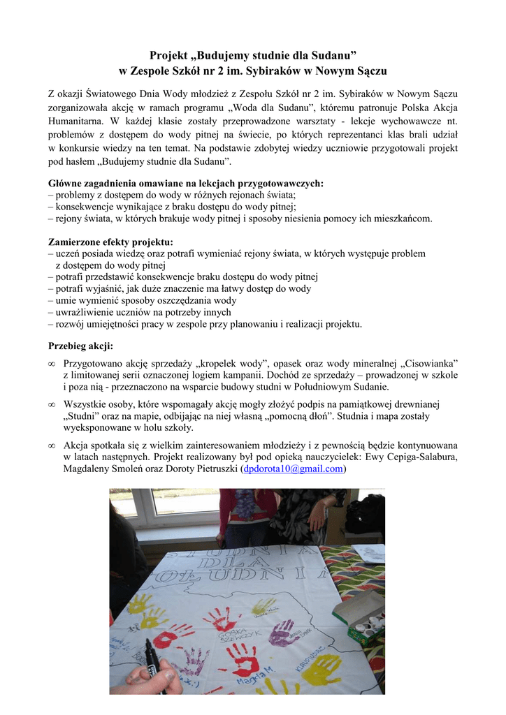 Projekt „Budujemy studnie dla Sudanu” w Zespole Szkół nr 2 im. Sybiraków w Nowym Sączu Z okazji Światowego Dnia Wody młodzieŜ z Zespołu Szkół nr 2 im. Sybiraków w Nowym Sączu zorganizowała akcję w ramach programu „Woda dla Sudanu”, któremu patronuje Polska Akcja Humanitarna. W kaŜdej klasie zostały przeprowadzone warsztaty - lekcje wychowawcze nt. problemów z dostępem do wody pitnej na świecie, po których reprezentanci klas brali udział w konkursie wiedzy na ten temat. Na podstawie zdobytej wiedzy uczniowie przygotowali projekt pod hasłem „Budujemy studnie dla Sudanu”. Główne zagadnienia omawiane na lekcjach przygotowawczych: – problemy z dostępem do wody w róŜnych rejonach świata; – konsekwencje wynikające z braku dostępu do wody pitnej; – rejony świata, w których brakuje wody pitnej i sposoby niesienia pomocy ich mieszkańcom. Zamierzone efekty projektu: – uczeń posiada wiedzę oraz potrafi wymieniać rejony świata, w których występuje problem z dostępem do wody pitnej – potrafi przedstawić konsekwencje braku dostępu do wody pitnej – potrafi wyjaśnić, jak duŜe znaczenie ma łatwy dostęp do wody – umie wymienić sposoby oszczędzania wody – uwraŜliwienie uczniów na potrzeby innych – rozwój umiejętności pracy w zespole przy planowaniu i realizacji projektu. Przebieg akcji: • Przygotowano akcję sprzedaŜy „kropelek wody”, opasek oraz wody mineralnej „Cisowianka” z limitowanej serii oznaczonej logiem kampanii. Dochód ze sprzedaŜy – prowadzonej w szkole i poza nią - przeznaczono na wsparcie budowy studni w Południowym Sudanie. • Wszystkie osoby, które wspomagały akcję mogły złoŜyć podpis na pamiątkowej drewnianej „Studni” oraz na mapie, odbijając na niej własną „pomocną dłoń”. Studnia i mapa zostały wyeksponowane w holu szkoły. • Akcja spotkała się z wielkim zainteresowaniem młodzieŜy i z pewnością będzie kontynuowana w latach następnych. Projekt realizowany był pod opieką nauczycielek: Ewy Cepiga-Salabura, Magdaleny Smoleń oraz Doroty Pietruszki ([email protected])