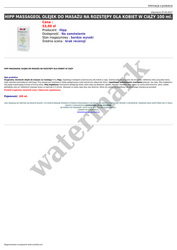 Informacje o produkcie Utworzono 07-03-2017 HIPP MASSAGEOL OLEJEK DO MASAŻU NA ROZSTĘPY DLA KOBIET W CIĄŻY 100 ml. Cena : 53,00 zł Producent : Hipp Dostępność : Na zamówienie Stan magazynowy : bardzo wysoki Średnia ocena : brak recenzji er m ar k HIPP MASSAGEOL OLEJEK DO MASAŻU NA ROZSTĘPY DLA KOBIET W CIĄŻY Opis produktu: Oryginalny niemiecki olejek do masażu na rozstępy firmy Hipp. Zapobiega rozstępom przeznaczony dla kobiet w ciąży. Zawiera jedynie przyjazne dla wrażliwej i delikatnej skóry przyszłej mamy oleje naturalne pochodzenia roślinnego. Przy regularnym stosowaniu olejek pielęgnacyjny może wzmacniać odporność skóry i zapobiegać powstawaniu rozstępów podczas i po ciąży. Olej migdałowy i olej jojoba wspomagają funkcję ochronną skóry. Olej migdałowy intensywnie pielęgnuję skórę, która staje się delikatna i gładka. Nanieść niewielką ilość olejku na suchą skórę brzucha, piersi, bioder, pośladków oraz ud i delikatnie masować przez co najmniej 2-3 minuty. Stosować w czasie ciąży dwa razy dziennie. Okres ten zaleca się przedłużyć do pierwszego miesiąca po porodzie. Produkt oryginalny niemiecki nowy i fabrycznie zapakowany. Pojemność: 100 ml. w at JEŚLI ZNAJDUJĄ SIĘ PAŃSTWO NA NASZYM SKLEPIE, A W OFERCIE BRAKUJE PRODUKTU KTÓREGO POSZUKUJECIE LUB JEST GO ZA MAŁO TO SERDECZNIE PROSIMY O INFORMACJE, PONIEWAŻ NASZ ASORTYMENT JEST O WIELE WIĘKSZY Z MOŻLIWOŚCIĄ ZAMÓWIENIA GO NA ŻYCZENIE. NA PEWNO COŚ PORADZIMY, GDYŻ KLIENT JEST DLA NAS NAJWAŻNIEJSZY. CZEKAMY NA WASZE MAILE: [email protected] Wygenerowano w programie www.oscGold.com