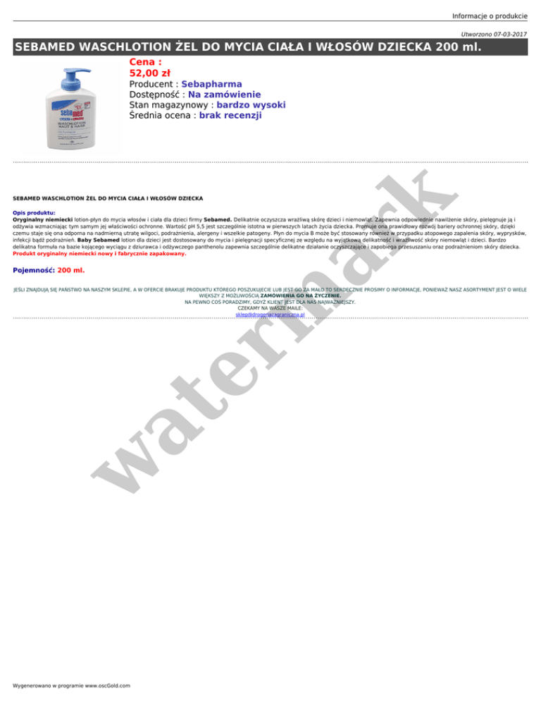 Informacje o produkcie Utworzono 07-03-2017 SEBAMED WASCHLOTION ŻEL DO MYCIA CIAŁA I WŁOSÓW DZIECKA 200 ml. Cena : 52,00 zł Producent : Sebapharma Dostępność : Na zamówienie Stan magazynowy : bardzo wysoki Średnia ocena : brak recenzji er m ar k SEBAMED WASCHLOTION ŻEL DO MYCIA CIAŁA I WŁOSÓW DZIECKA Opis produktu: Oryginalny niemiecki lotion-płyn do mycia włosów i ciała dla dzieci firmy Sebamed. Delikatnie oczyszcza wrażliwą skórę dzieci i niemowląt. Zapewnia odpowiednie nawilżenie skóry, pielęgnuje ją i odżywia wzmacniając tym samym jej właściwości ochronne. Wartość pH 5,5 jest szczególnie istotna w pierwszych latach życia dziecka. Promuje ona prawidłowy rozwój bariery ochronnej skóry, dzięki czemu staje się ona odporna na nadmierną utratę wilgoci, podrażnienia, alergeny i wszelkie patogeny. Płyn do mycia B może być stosowany również w przypadku atopowego zapalenia skóry, wyprysków, infekcji bądź podrażnień. Baby Sebamed lotion dla dzieci jest dostosowany do mycia i pielęgnacji specyficznej ze względu na wyjątkową delikatność i wrażliwość skóry niemowląt i dzieci. Bardzo delikatna formuła na bazie kojącego wyciągu z dziurawca i odżywczego panthenolu zapewnia szczególnie delikatne działanie oczyszczające i zapobiega przesuszaniu oraz podrażnieniom skóry dziecka. Produkt oryginalny niemiecki nowy i fabrycznie zapakowany. Pojemność: 200 ml. w at JEŚLI ZNAJDUJĄ SIĘ PAŃSTWO NA NASZYM SKLEPIE, A W OFERCIE BRAKUJE PRODUKTU KTÓREGO POSZUKUJECIE LUB JEST GO ZA MAŁO TO SERDECZNIE PROSIMY O INFORMACJE, PONIEWAŻ NASZ ASORTYMENT JEST O WIELE WIĘKSZY Z MOŻLIWOŚCIĄ ZAMÓWIENIA GO NA ŻYCZENIE. NA PEWNO COŚ PORADZIMY, GDYŻ KLIENT JEST DLA NAS NAJWAŻNIEJSZY. CZEKAMY NA WASZE MAILE: [email protected] Wygenerowano w programie www.oscGold.com