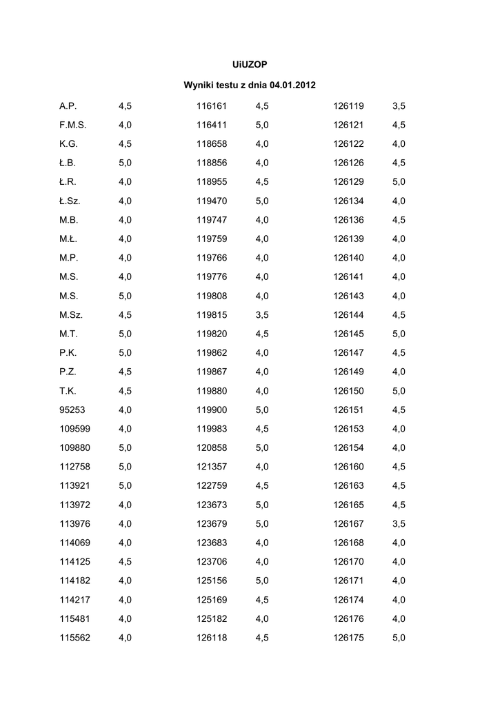 UiUZOP Wyniki testu z dnia 04.01.2012 A.P. 4,5 116161 4,5 126119 3,5 F.M.S. 4,0 116411 5,0 126121 4,5 K.G. 4,5 118658 4,0 126122 4,0 Ł.B. 5,0 118856 4,0 126126 4,5 Ł.R. 4,0 118955 4,5 126129 5,0 Ł.Sz. 4,0 119470 5,0 126134 4,0 M.B. 4,0 119747 4,0 126136 4,5 M.Ł. 4,0 119759 4,0 126139 4,0 M.P. 4,0 119766 4,0 126140 4,0 M.S. 4,0 119776 4,0 126141 4,0 M.S. 5,0 119808 4,0 126143 4,0 M.Sz. 4,5 119815 3,5 126144 4,5 M.T. 5,0 119820 4,5 126145 5,0 P.K. 5,0 119862 4,0 126147 4,5 P.Z. 4,5 119867 4,0 126149 4,0 T.K. 4,5 119880 4,0 126150 5,0 95253 4,0 119900 5,0 126151 4,5 109599 4,0 119983 4,5 126153 4,0 109880 5,0 120858 5,0 126154 4,0 112758 5,0 121357 4,0 126160 4,5 113921 5,0 122759 4,5 126163 4,5 113972 4,0 123673 5,0 126165 4,5 113976 4,0 123679 5,0 126167 3,5 114069 4,0 123683 4,0 126168 4,0 114125 4,5 123706 4,0 126170 4,0 114182 4,0 125156 5,0 126171 4,0 114217 4,0 125169 4,5 126174 4,0 115481 4,0 125182 4,0 126176 4,0 115562 4,0 126118 4,5 126175 5,0 126177 4,0 126215 4,0 126263 4,5 126178 4,5 126218 4,0 126264 4,0 126179 5,0 126220 4,0 126266 4,5 126184 5,0 126221 4,5 126268 3,5 126185 5,0 126222 4,5 126273 4,0 126187 5,0 126224 4,5 126279 4,0 126189 4,0 126232 5,0 126282 4,0 126191 4,5 126233 4,5 126283 4,5 126192 4,0 126235 4,0 126285 4,0 126196 4,0 126236 4,0 126287 5,0 126195 5,0 126239 4,0 128853 4,5 126197 5,0 126244 4,0 129919 4,0 126199 4,5 126243 5,0 141386 4,5 126201 4,0 126250 4,0 141388 4,5 126202 5,0 126253 4,5 141389 4,0 126212 4,0 126256 4,9 141400 4,0 126214 4,0 126259 4,5