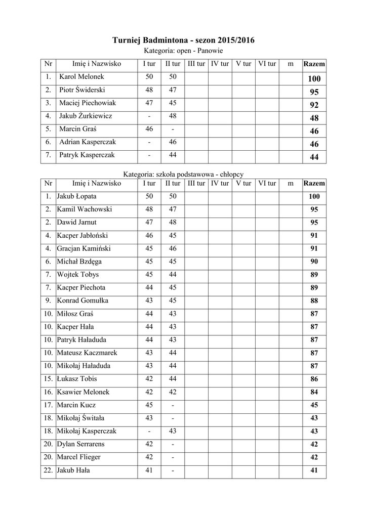 Turniej Badmintona - sezon 2015/2016 Kategoria: open - Panowie Nr Imię i Nazwisko I tur II tur III tur IV tur V tur VI tur m Razem 1. Karol Melonek 50 50 100 2. Piotr Świderski 48 47 95 3. Maciej Piechowiak 47 45 92 4. Jakub Żurkiewicz - 48 48 5. Marcin Graś 46 - 46 6. Adrian Kasperczak - 46 46 7. Patryk Kasperczak - 44 44 Nr Kategoria: szkoła podstawowa - chłopcy Imię i Nazwisko I tur II tur III tur IV tur V tur VI tur m Razem 1. Jakub Łopata 50 50 100 2. Kamil Wachowski 48 47 95 2. Dawid Jarnut 47 48 95 4. Kacper Jabłoński 46 45 91 4. Gracjan Kamiński 45 46 91 6. Michał Bzdęga 45 45 90 7. Wojtek Tobys 45 44 89 7. Kacper Piechota 44 45 89 9. Konrad Gomułka 43 45 88 10. Miłosz Graś 44 43 87 10. Kacper Hała 44 43 87 10. Patryk Haładuda 44 43 87 10. Mateusz Kaczmarek 43 44 87 10. Mikołaj Haładuda 43 44 87 15. Łukasz Tobis 42 44 86 16. Ksawier Melonek 42 42 84 17. Marcin Kucz 45 - 45 18. Mikołaj Świtała 43 - 43 - 43 43 20. Dylan Serrarens 42 - 42 20. Marcel Flieger 42 - 42 22. Jakub Hała 41 - 41 18. Mikołaj Kasperczak Kategoria: gimnazjum - chłopcy Nr Imię i Nazwisko I tur II tur III tur IV tur V tur VI tur m Razem 1. Bartosz Szymoniak 50 48 98 2. Jędrzej Maciejewski 48 45 93 3. Mateusz Jarnut 47 46 93 4. Emanuel Łęszczak 46 45 91 5. Piotr Sobkowiak 45 43 88 6. Rafał Jędrzejczak - 50 50 7. Tobiasz Henicz - 47 47 8. Jacek Górny 45 - 45 9. Wojciech Marcinkowski 44 - 44 9. Sebastian Troszczyński - 44 44 9. Wojciech Kupś - 44 44 Kategoria: gimnazjum - dziewczęta Nr Imię i Nazwisko I tur II tur III tur IV tur V tur VI tur m Razem 1. Aleksandra Minge 50 50 100 2. Martyna Wojtkowiak 48 47 95 3. Paulina Knop 46 48 94 4. Ewelina Matyjasik 47 - 47 5. Zofia Wojtkowiak - 46 46 6. Amelia Kniat 45 - 45 6. Julia Kozłowska 45 - 45 6. Arletta Szerment - 45 45 6. Aleksandra Łęszczak - 45 45 10. Wiktoria Kozłowska 44 - 44 10. Angelika Nalewajk 44 - 44 12. Adrianna Kluge 43 - 43 Kategoria: dziewczęta i chłopcy do klasy III szkoły podstawowej Nr Imię i Nazwisko 1. Patrycja Frelich I tur 50 II tur III tur IV tur V tur VI tur 50 m Razem 100 2. Iga Dachtera 47 46 93 2. Karolina Kupś 46 47 93 4. Maciej Kasztelan 50 - 50 5. Miłosz Kostrzewski - 48 48 Kategoria: szkoła podstawowa - dziewczęta Nr Imię i Nazwisko I tur II tur III tur IV tur V tur VI tur m Razem 1. Matylda Wesoła 50 48 98 1. Wiktoria Frelich 48 50 98 3. Weronika Batura 47 46 93 4. Nicola Wojtkowiak 45 47 92 5. Zuzanna Krasowska 46 45 91 6. Oliwia Gorońska 45 45 90 6. Donata Szymoniak 45 45 90 8. Julia Mańczak 45 44 89 9. Zuzanna Szajek 44 44 88 10. Paulina Nowaczyk 44 43 87 10. Gabriela Kupś 44 43 87 10. Aleksandra Kaźmierczak 43 44 87 13. Wiktoria Górecka 43 42 85 13. Julia Jędrzejczak 42 43 85 15. Martyna Sobisiak 42 42 84 15. Olga Dachtera 42 42 84 15. Klaudia Kupsz 42 42 84 15. Tatiana Fornalik 42 42 84 19. Oliwia Kostrzewska - 45 45 20. Ania Michałowska 44 - 44 - 44 44 22. Weronika Romanowska 43 - 43 22. Zuzanna Jędrzejczak 43 - 43 22. Martyna Kańduła - 43 43 25. Amelia Łanoszka 42 - 42 25. Jagoda Korytowska 42 - 42 25. Agnieszka Macioszek - 42 42 25. Dominika Jaworowicz - 42 42 20. Oliwia Migdałek Kategoria: open - Panie Nr 1. Imię i Nazwisko I tur II tur III tur IV tur V tur VI tur m Razem